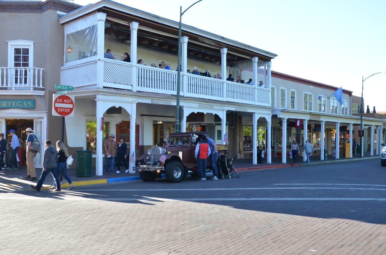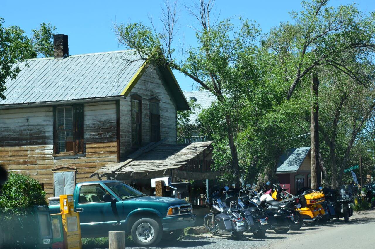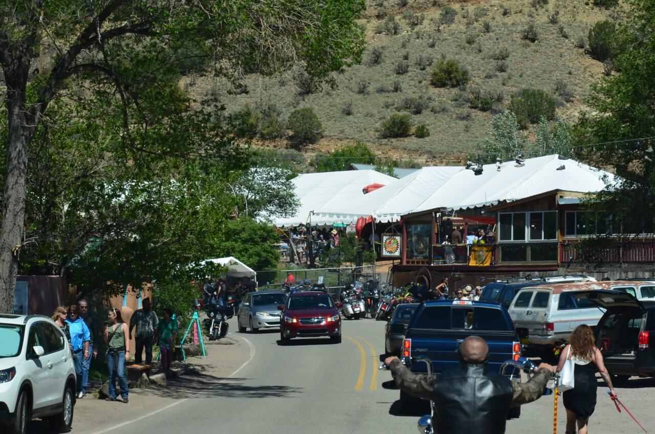 Jetzt haben wir nicht mehr weit bis zu unserem Ziel Santa Fe. Schon eine ganze Weile haben wir einen Harley-Fahrer vor uns. Hinter einer Kurve wird er langsamer und dann wissen wir auch warum. Madrid, so nennt sich das kleine Straßendorf feiert heute wohl ein besonderes Fest keine Chance auch nur annähernd einen Parkplatz zu finden, so schießen wir im Vorbeifahren ein paar Fotos.
