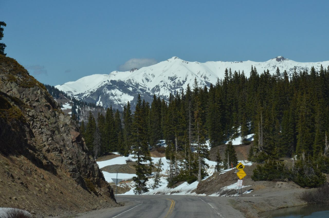 Weiter geht es auf hochalpinen Straßen, umrahmt von über 4000 m hohen Bergen ringsum. Vorbei an Skigebieten hier in den “San Juan Mountains” einem Ausläufer der Rocky Mountains und vorbei an alten Relikten aus den Silberbergwerken. Wie überqueren jetzt den Pass “Red Mountain” in einer Höhe von 3358 m, wieder geht es durch Schneelandschaft und dann hinunter in das Hochgebirgsstädtchen Ouray.