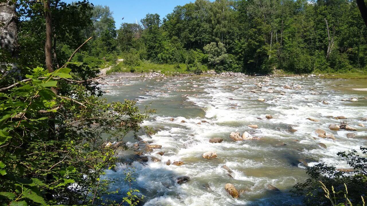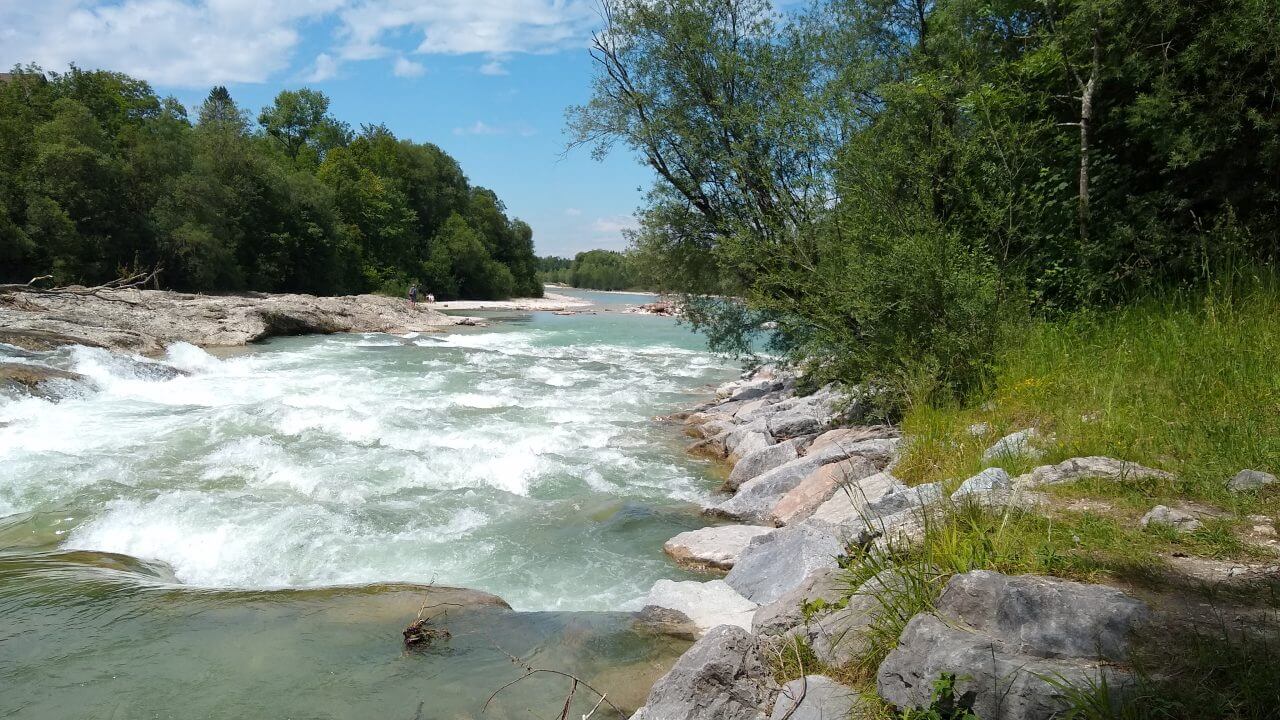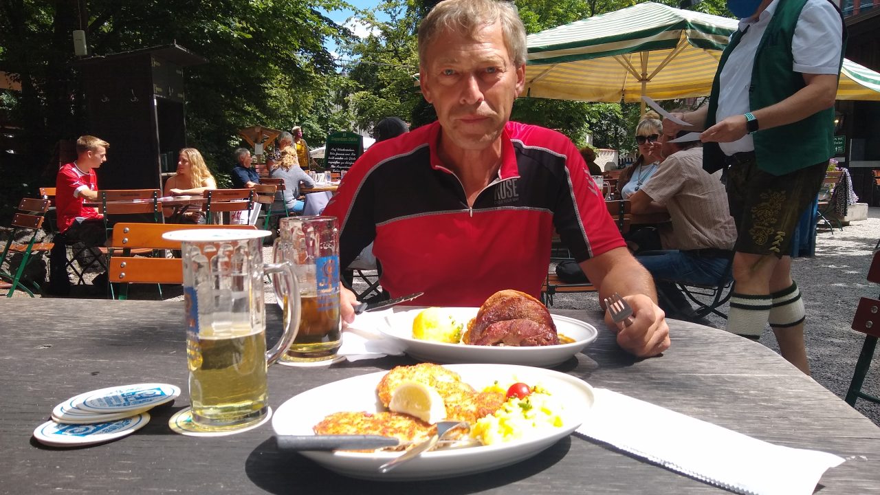 Nachdem die Räder gepackt sind, fahren wir runter an die Isar und an dieser weiter entlang bis wir automatisch den englischen Garten in München erreichen. Richtig schön ist es hier. Ein kurzer Abstecher zum Marienplatz in München muss natürlich auch sein, bevor es immer an der Isar entlang bis nach Wolfratshausen geht. Nach fast 70 km und angenehmen 25°C übernachten wir an diesem Tag im Gasthof „Humpl Bräu“ (70,-€) und spazieren am Abend zum Biergarten Flößerhof zum leckeren Abendessen.