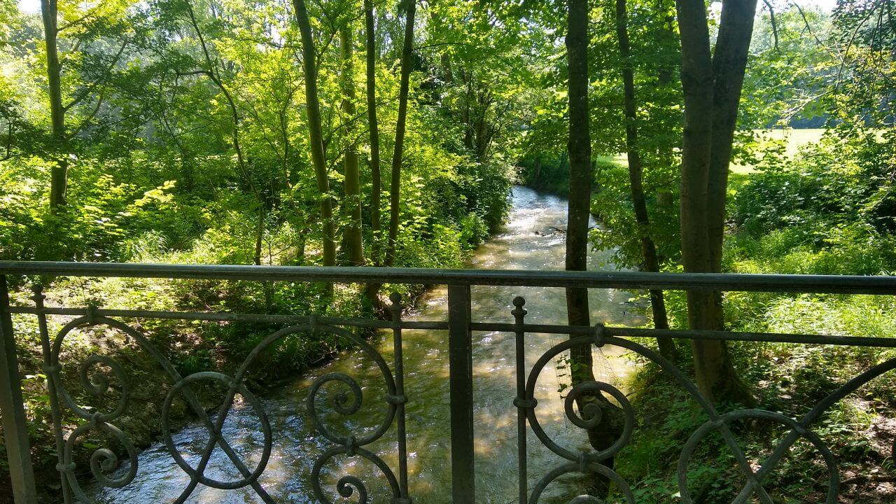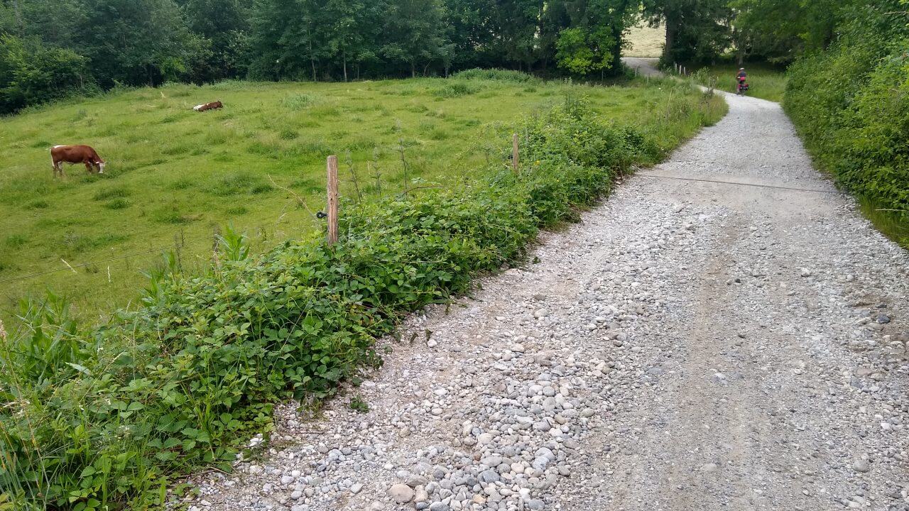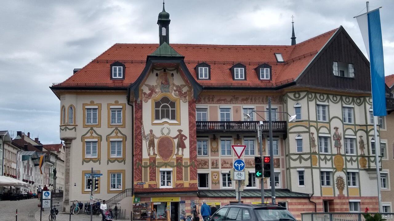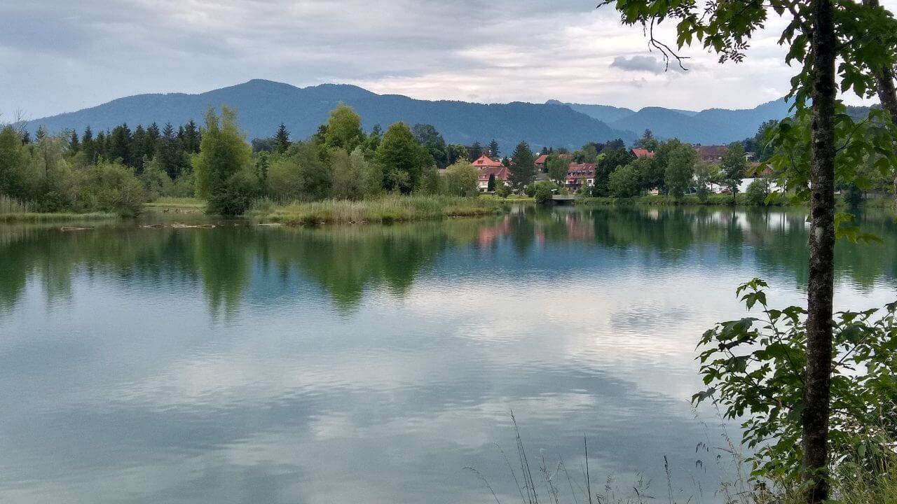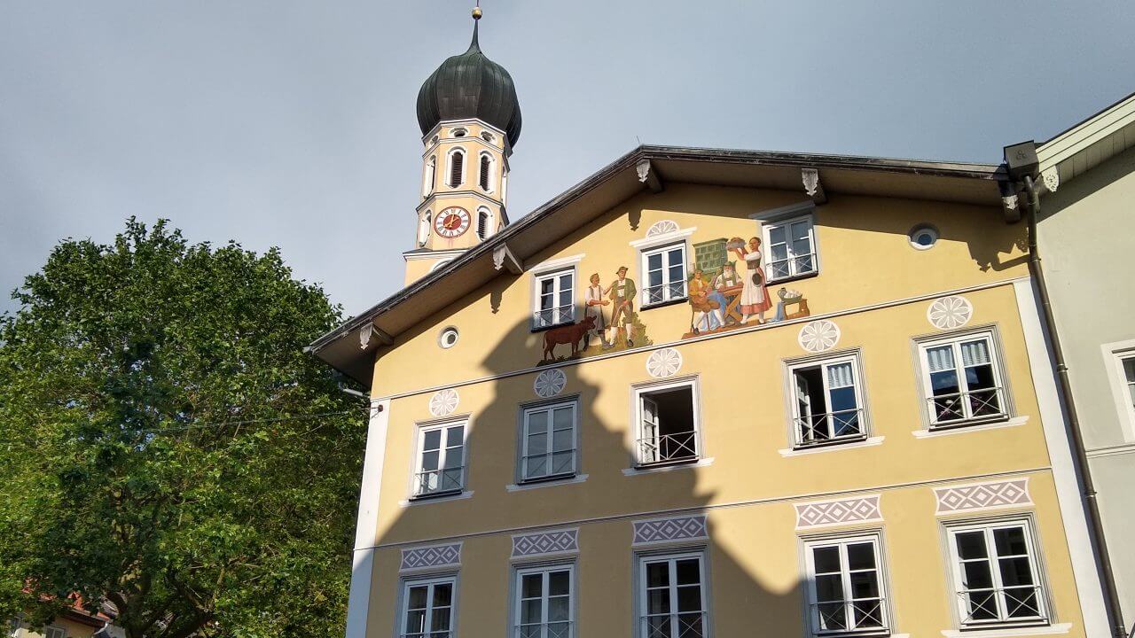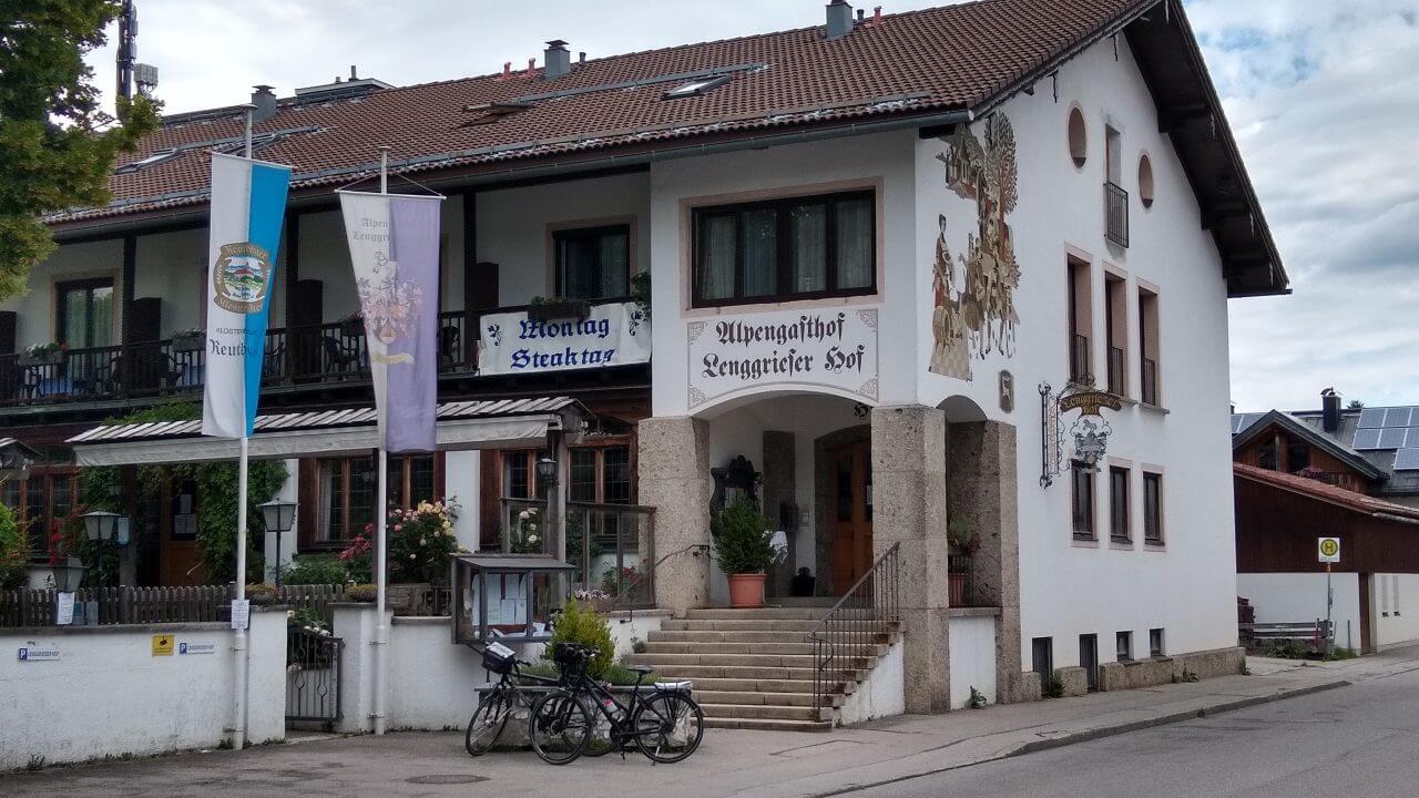Heute geht es durch Feld, Wald und Wiese entlang der Isar. In Bad Tölz machen wir einen kurzen Stopp um noch einmal über die historische Marktstraße mit ihren reich verzierten Häusern zu bummeln. Danach tröpfelt es vereinzelt aus den Wolken, aber letztendlich kommen wir nach 50 km im „Alpengasthof“ (63,-€) Lenggrieß trocken an.
