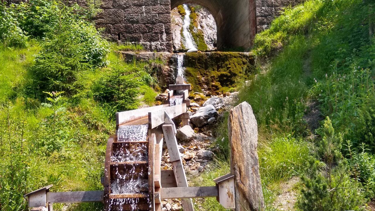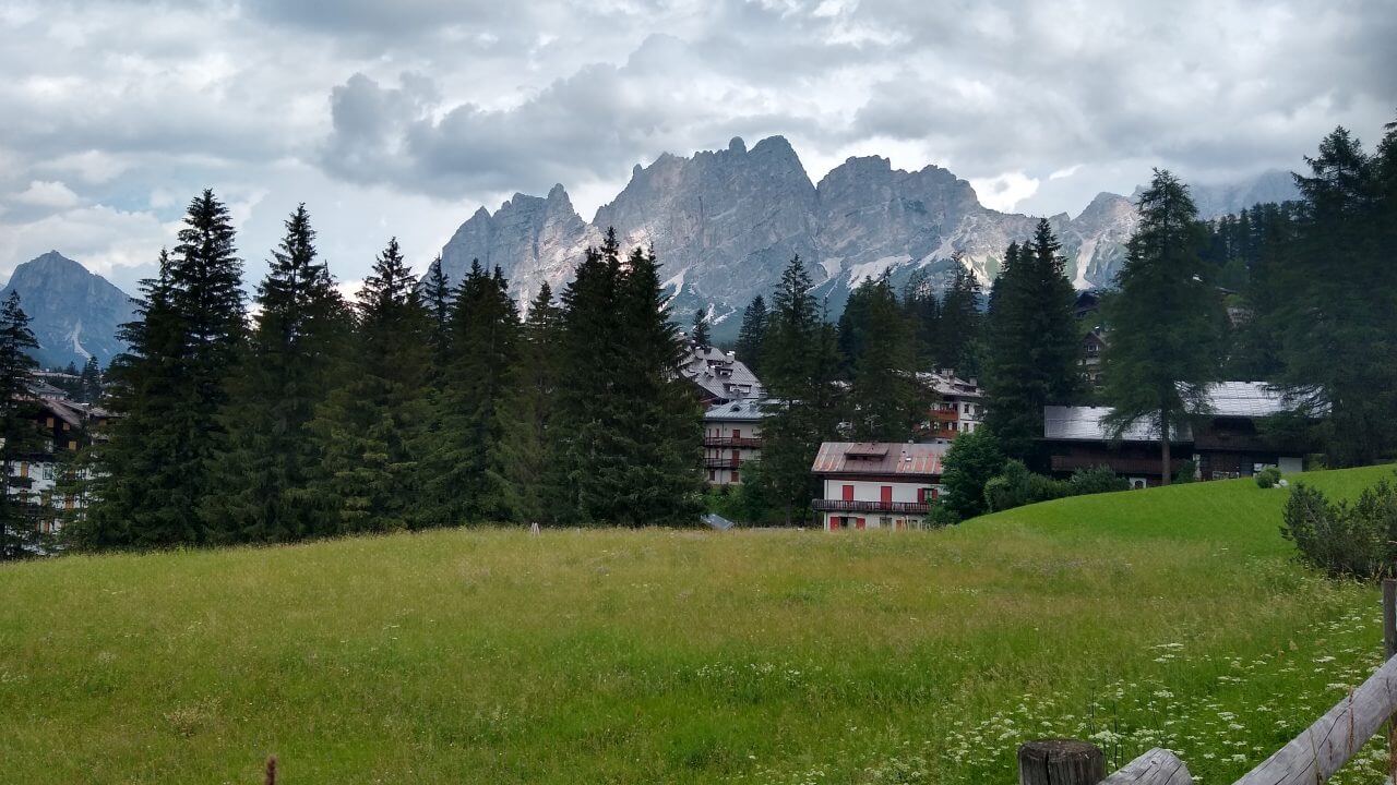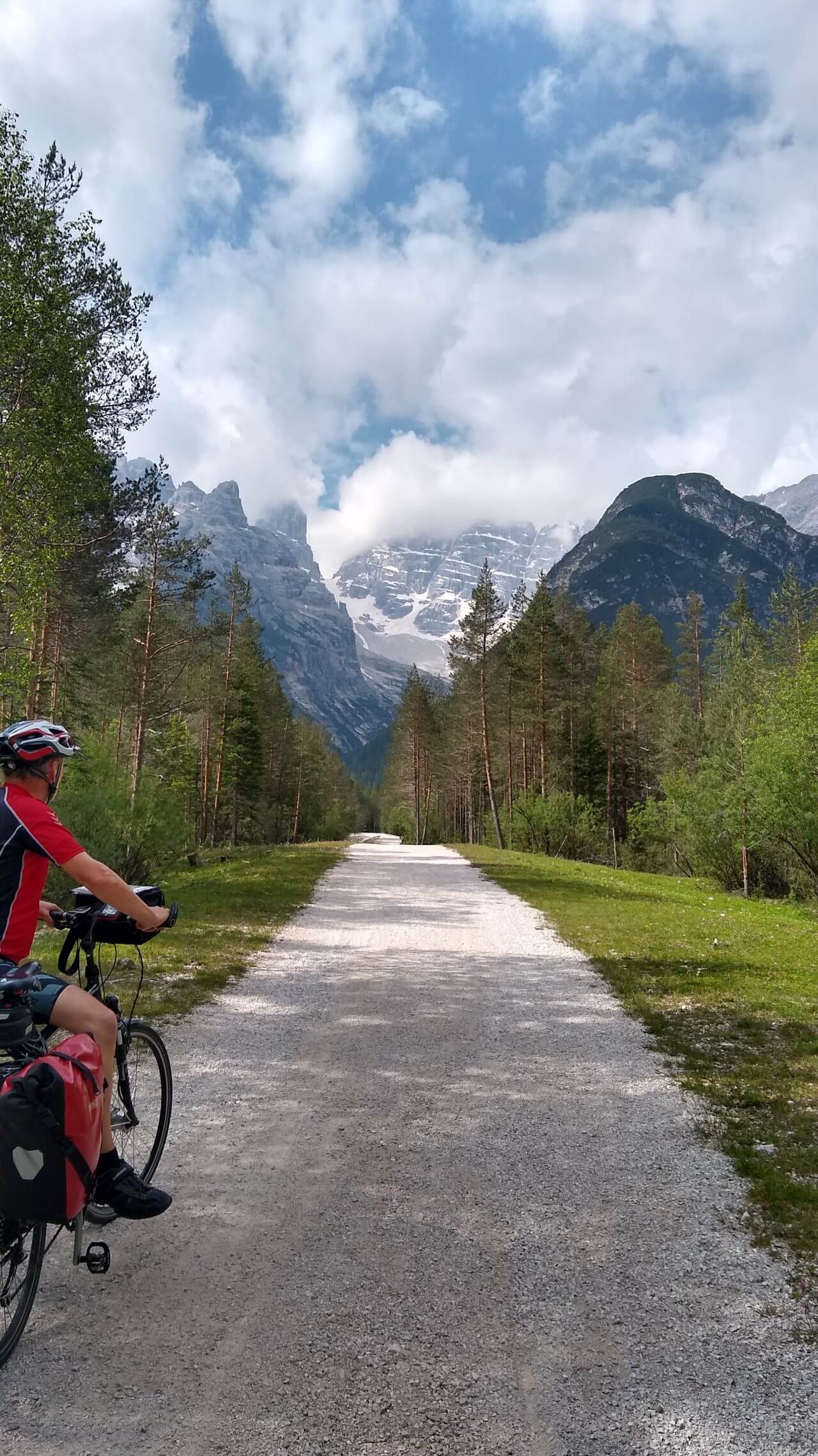 Heute sind wir wieder auf einer ehemaligen Bahntrasse, die der Dolomitenbahn unterwegs. Wir radeln fernab vom Verkehr durch die herrliche Gebirgswelt. Entsprechend müssen wir in die Ketten treten, da es bis zum Pass natürlich ständig ansteigt. Dafür entschädigt aber unter anderem auch der Blick auf die berühmten „Drei Zinnen“ und das wohlverdiente Pausenradler in der Gartenwirtschaft am Passo Cima. Nun beginnt eine einzigartige Abfahrt durch alte Bahntunnel und über eine tiefe Schlucht. Auf phantastisch asphaltierten Radwegen rauschen wir hinunter nach Cortina d’Ampezzo, diesem berühmten Wintersportort mitten in den Dolomiten. Dann erwischt uns aber ein heftiger stundenlanger Regen, durch den wir noch einige Zeit fahren, um dann pitschenass in Borca di Cadore im Hotel „Dolomiti Mountain Ressort“ (59,-€) direkt an der Wegstrecke einzuchecken. Heute waren es dann 50 km, die wir zurück gelegt haben.
