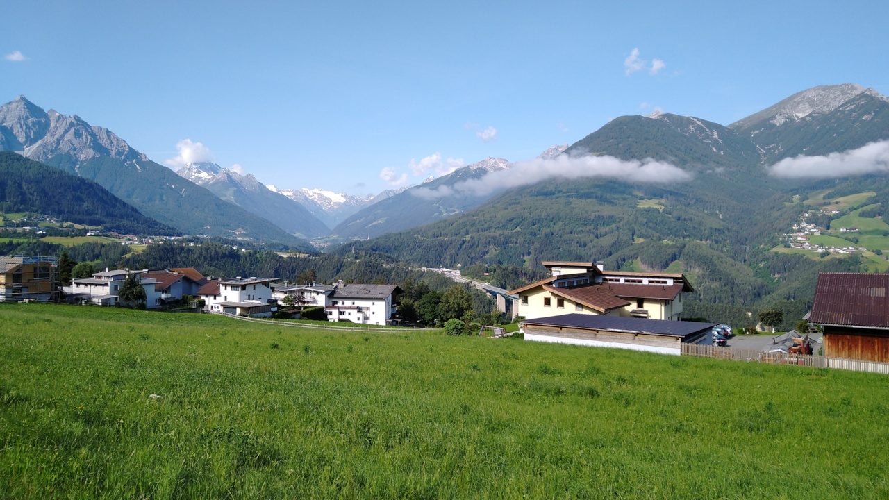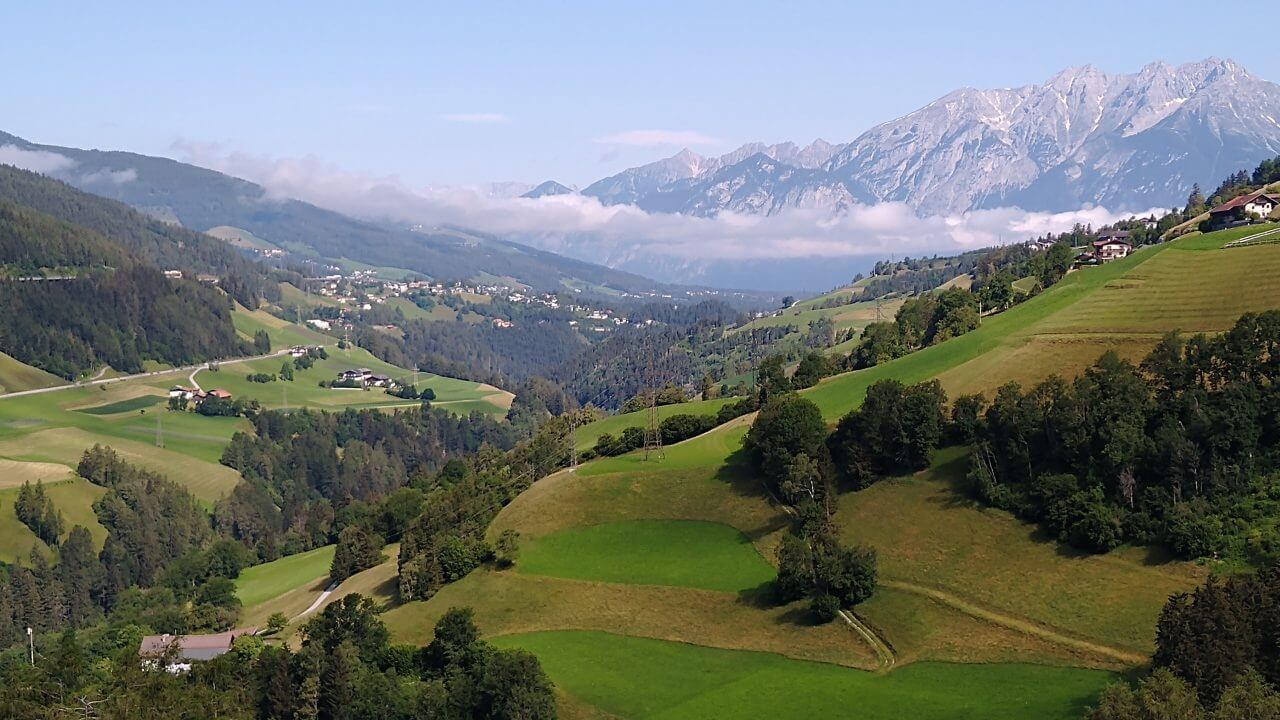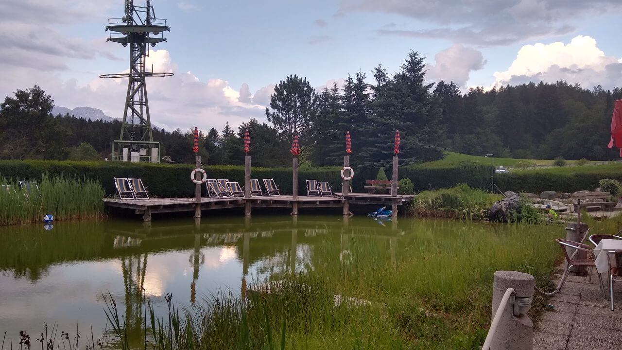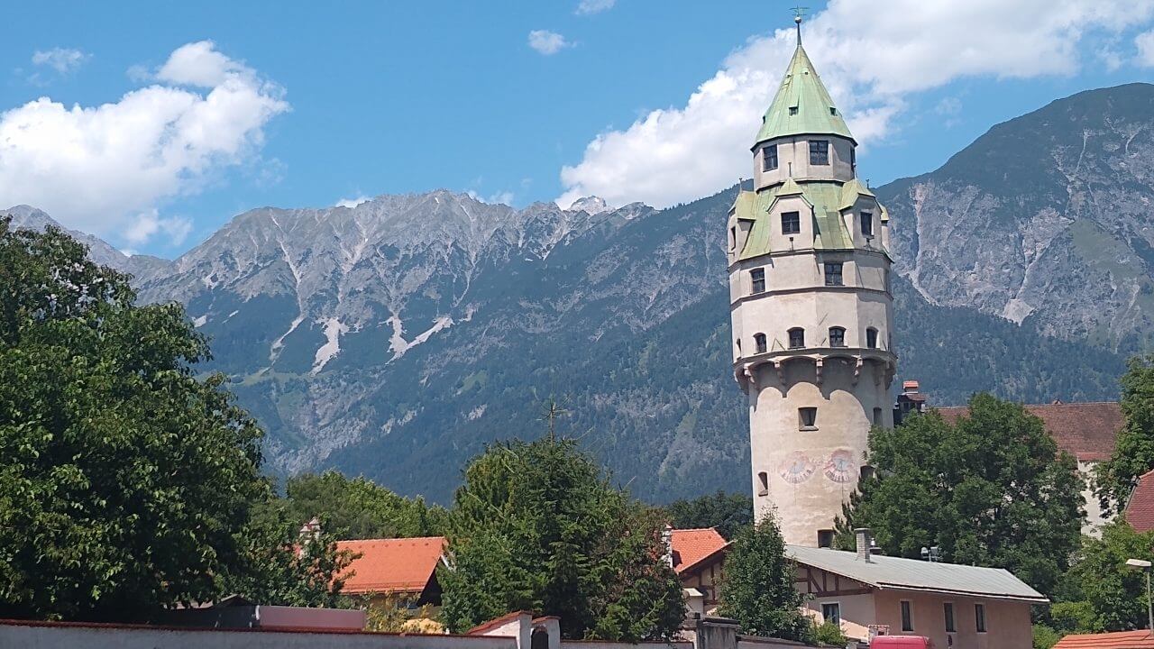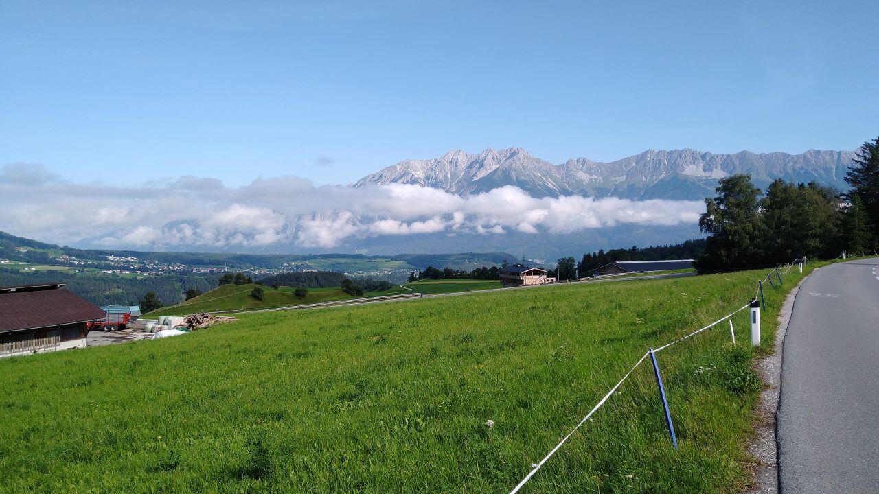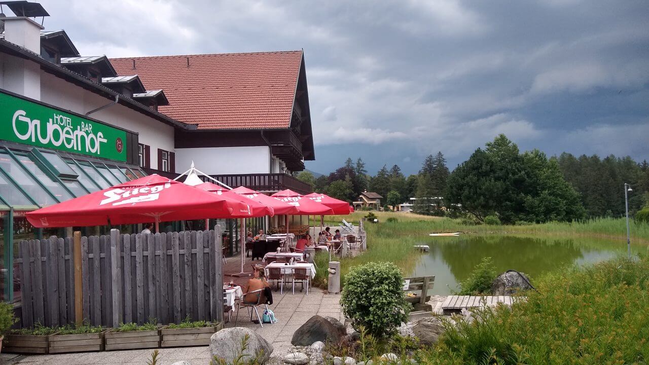 Nach einer guten und erholsamen Nacht geht es bei herrlichem Wetter entlang der Ziller wieder zurück zur Strecke, wo wir nun auf dem Inntalradweg Richtung Innsbruck unterwegs sind. In Wattens legen wir einen Stop ein. Hier sind die Swarowski Kristallwelten, ein von André Heller gestaltetes Museum zu finden. Uns genügt aber der Anblick von außen und wir stoppen stattdessen wenige Kilometer später in der mittelalterlich geprägten Stadt Hall. Vielleicht eine der schönsten Städte in Tirol. Danach geht’s bei inzwischen wieder mindestens schwülen 30°C weiter bis in die Landeshauptstadt Innsbruck. Weil es für ein Sightseeing in der Stadt viel zu heiß geworden ist, ziehen wir es vor, noch 5 km weiter bis nach Igels zu fahren. Dort liegt auf unserem Weg zum Brenner ein schönes Hotel mit Naturschwimmteich…..genau das richtige bei diesem Wetter. Wie sich dann allerdings herausstellt, geht es diese 5 km direkt an der berühmten Sprungschanze vorbei ständig steil bergan. „Wer sein Fahrrad liebt, der schiebt“ frei nach diesem Motto geht es bis zum „Gruberhof“ (75,-€) wo wir nach insgesamt 70 km unsere Fahrräder in den Keller schieben, um dann bei aufkommenden Sturm und Regen doch drinnen zu sitzen.