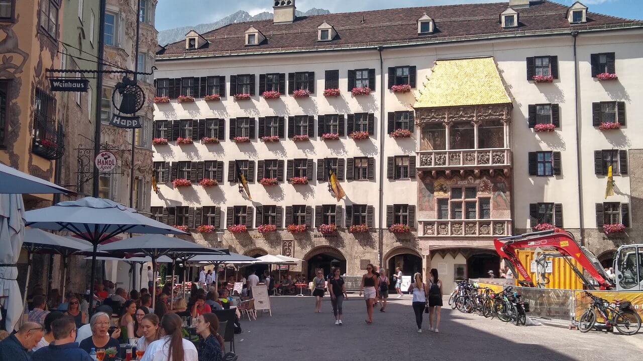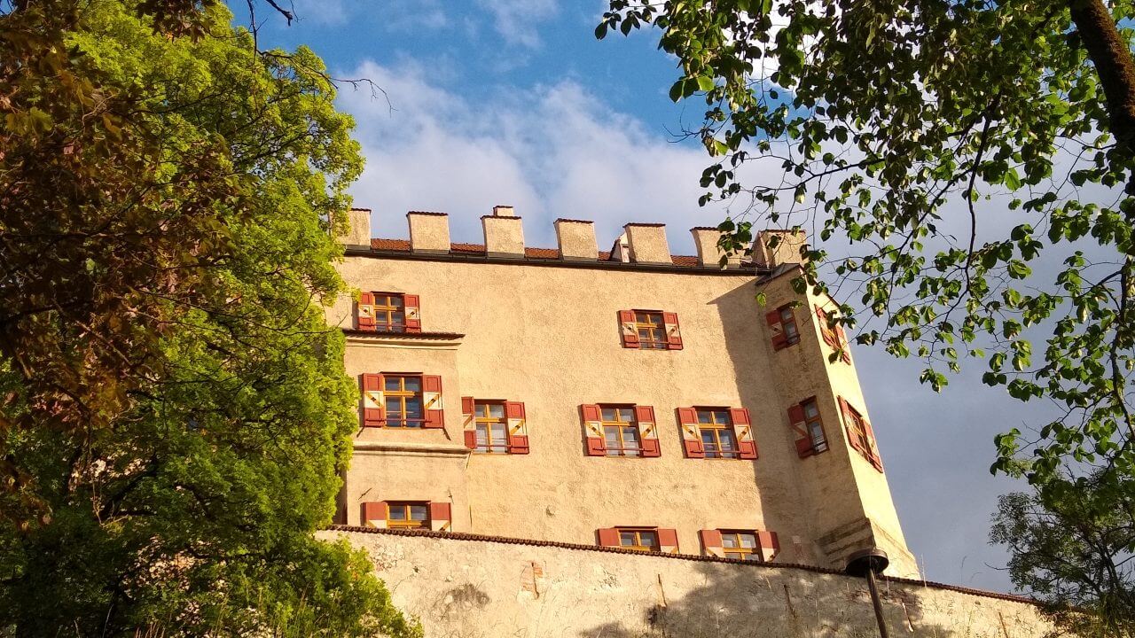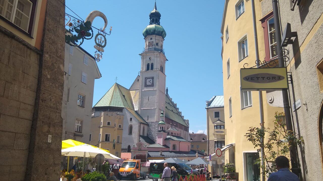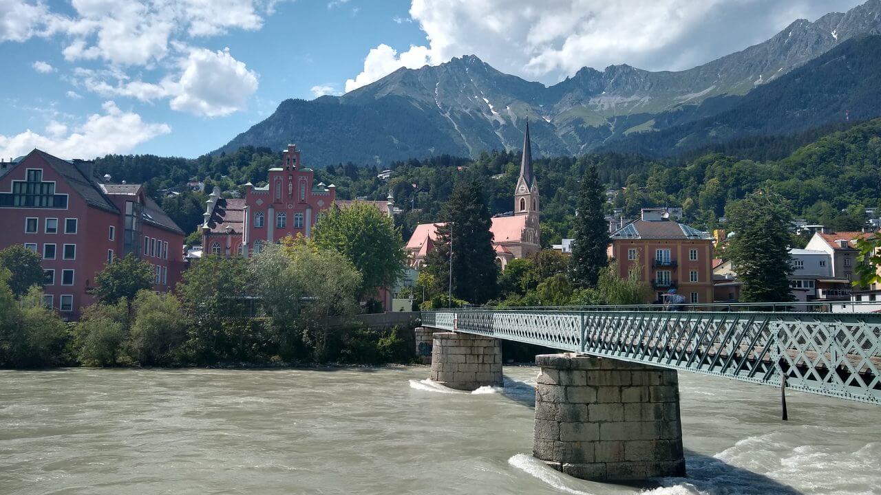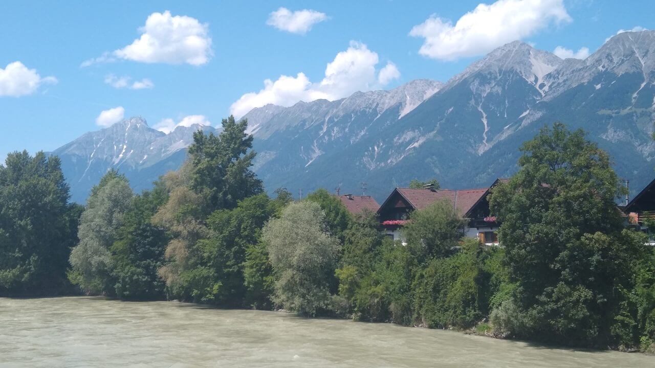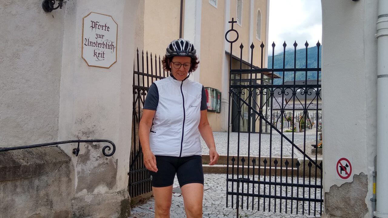 Nach einer guten und erholsamen Nacht geht es bei herrlichem Wetter entlang der Ziller wieder zurück zur Strecke, wo wir nun auf dem Inntalradweg Richtung Innsbruck unterwegs sind. In Wattens legen wir einen Stop ein. Hier sind die Swarowski Kristallwelten, ein von André Heller gestaltetes Museum zu finden. Uns genügt aber der Anblick von außen und wir stoppen stattdessen wenige Kilometer später in der mittelalterlich geprägten Stadt Hall. Vielleicht eine der schönsten Städte in Tirol. Danach geht’s bei inzwischen wieder mindestens schwülen 30°C weiter bis in die Landeshauptstadt Innsbruck. Weil es für ein Sightseeing in der Stadt viel zu heiß geworden ist, ziehen wir es vor, noch 5 km weiter bis nach Igels zu fahren. Dort liegt auf unserem Weg zum Brenner ein schönes Hotel mit Naturschwimmteich…..genau das richtige bei diesem Wetter. Wie sich dann allerdings herausstellt, geht es diese 5 km direkt an der berühmten Sprungschanze vorbei ständig steil bergan. „Wer sein Fahrrad liebt, der schiebt“ frei nach diesem Motto geht es bis zum „Gruberhof“ (75,-€) wo wir nach insgesamt 70 km unsere Fahrräder in den Keller schieben, um dann bei aufkommenden Sturm und Regen doch drinnen zu sitzen.
