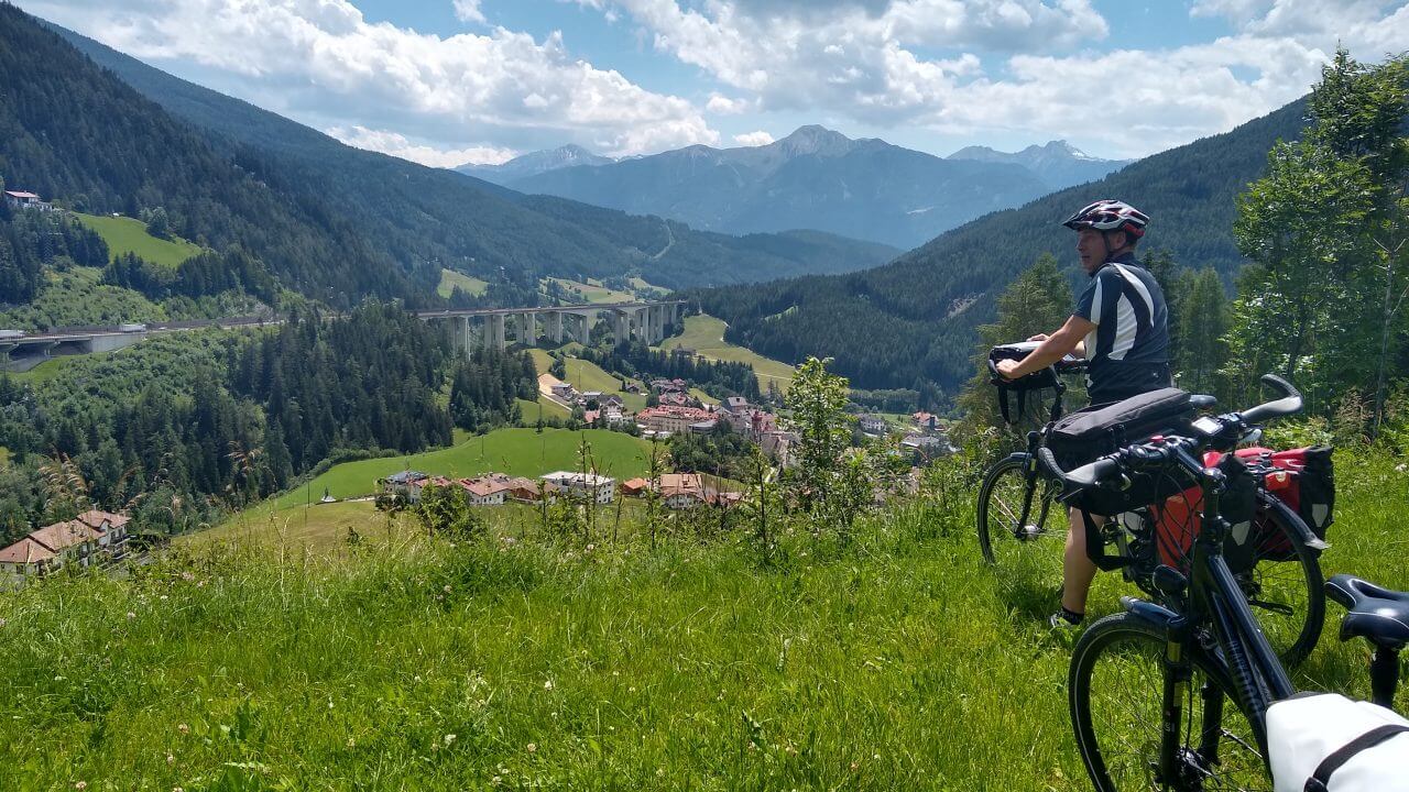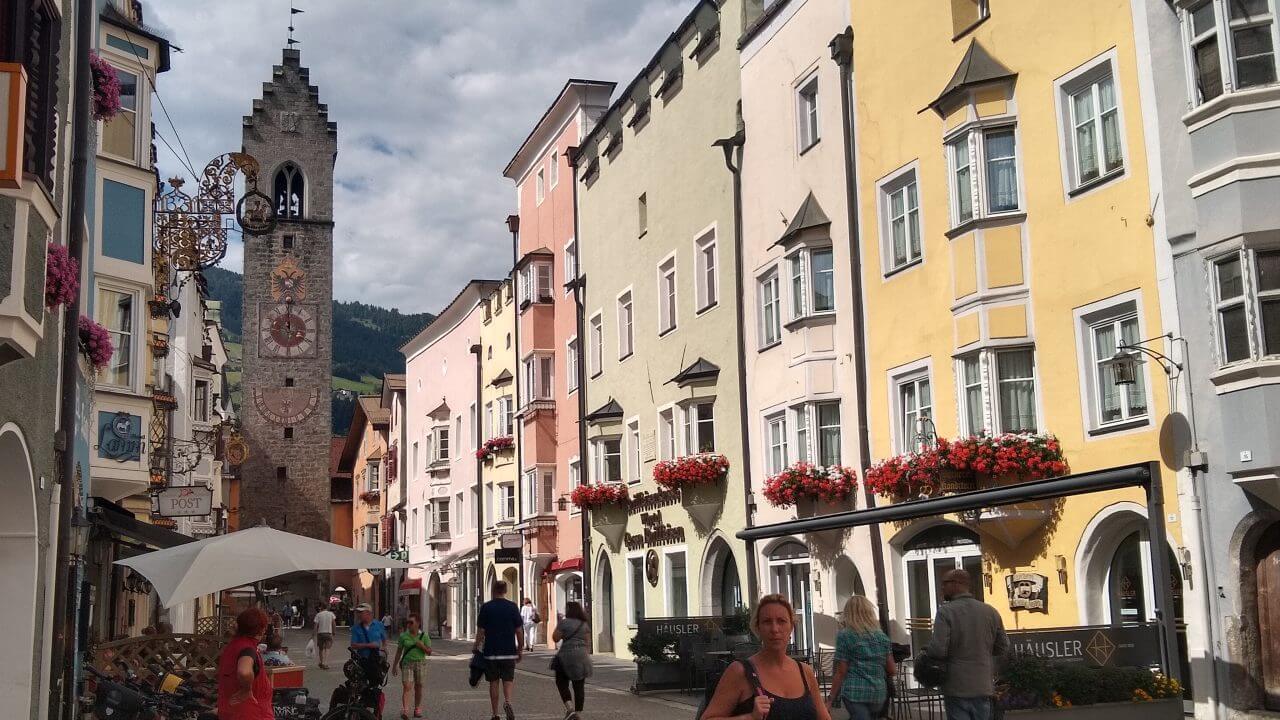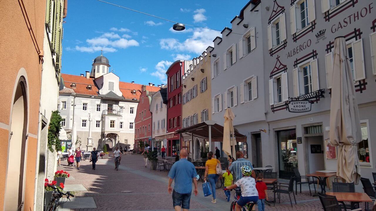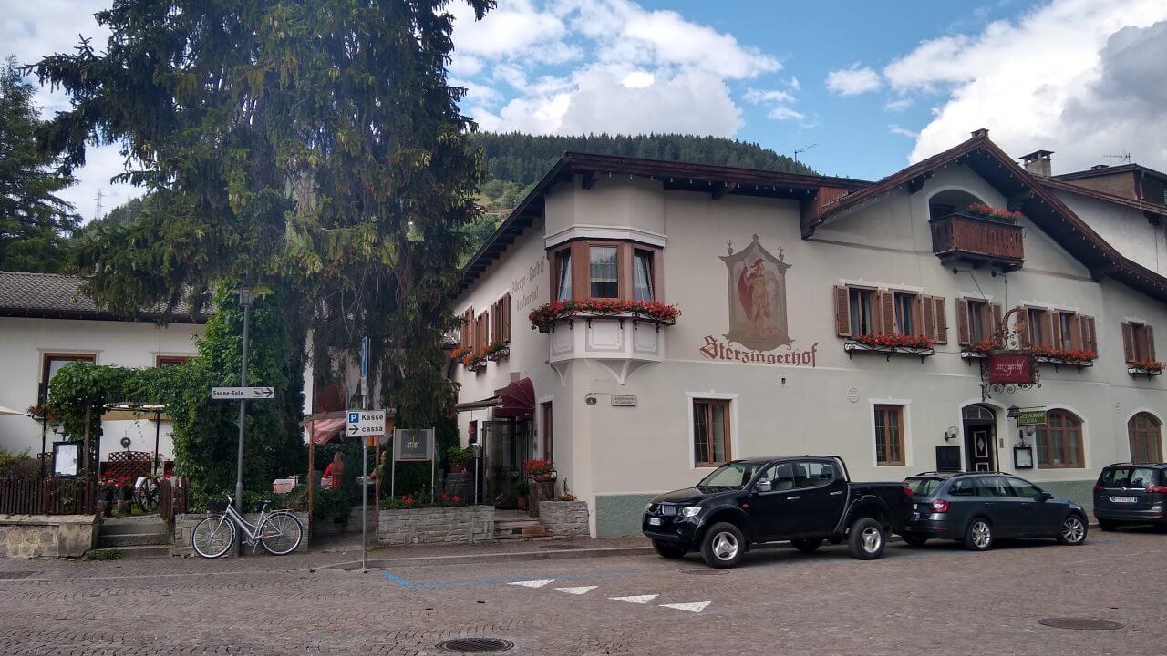 Oben angekommen, freuen wir uns beide, dass alles so gut geklappt hat und wir genießen nun wieder die gemeinsame Fahrt nach Sterzing. Hierbei geht es fast ausschließlich abwärts durch grandiose Landschaft auf einer ehemaligenBahntrasse hinab ins Eisacktal. Höchster Radfahrgenuss! Im Hotel „Sterzinger Hof“ (60,-€) mit kleinem Biergarten finden wir eine wirklich nette Unterkunft. Wir erkunden nun die superschöne Stadt in Südtirol (übrigens die nördlichste Stadt Italiens) und sind ganz begeistert von der tollen Atmosphäre.