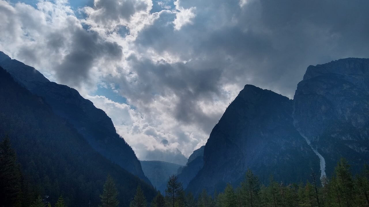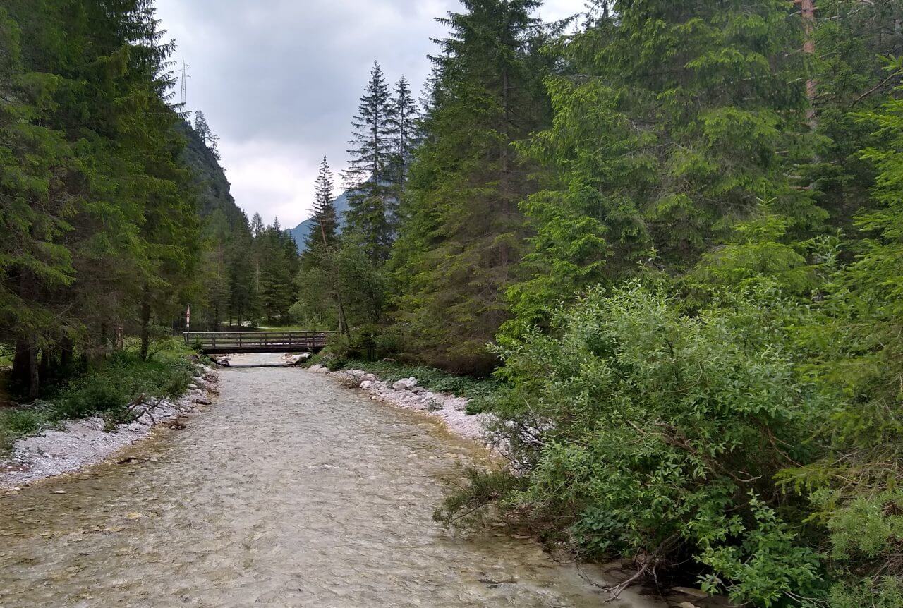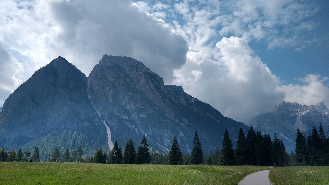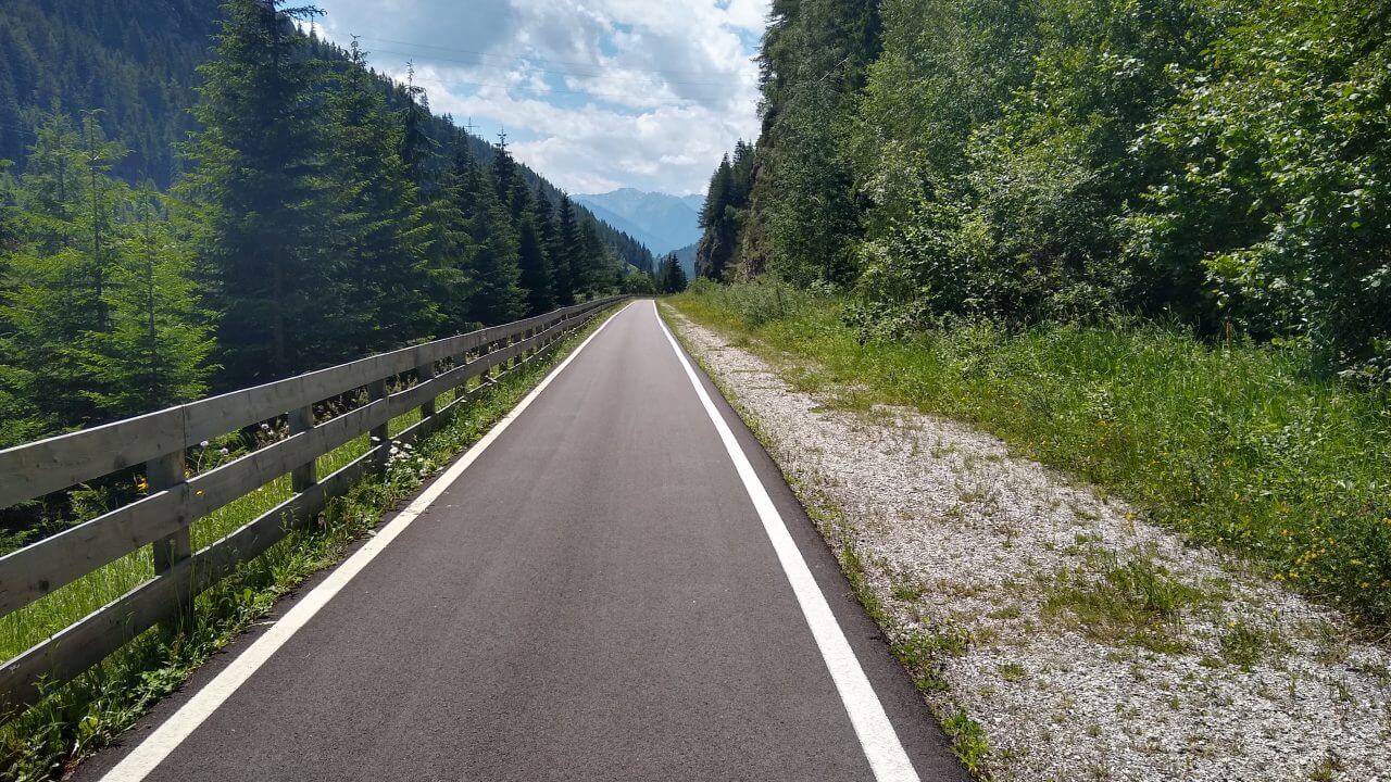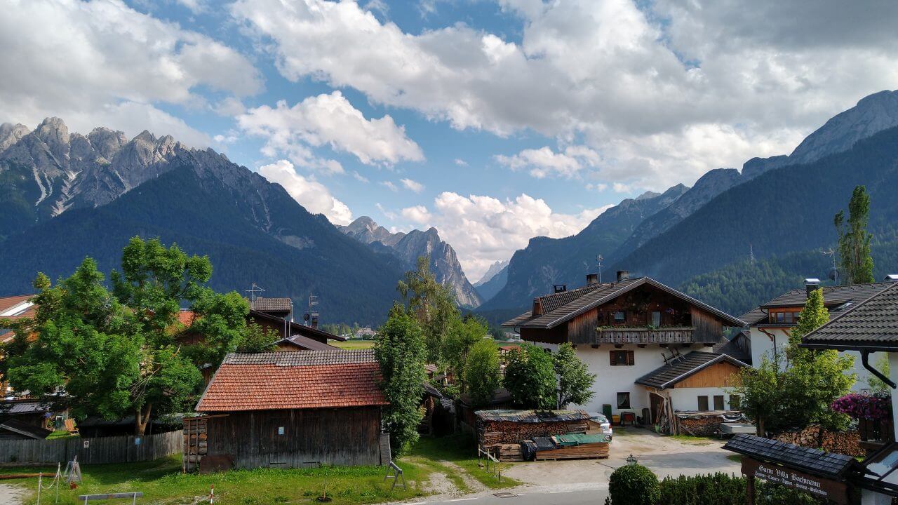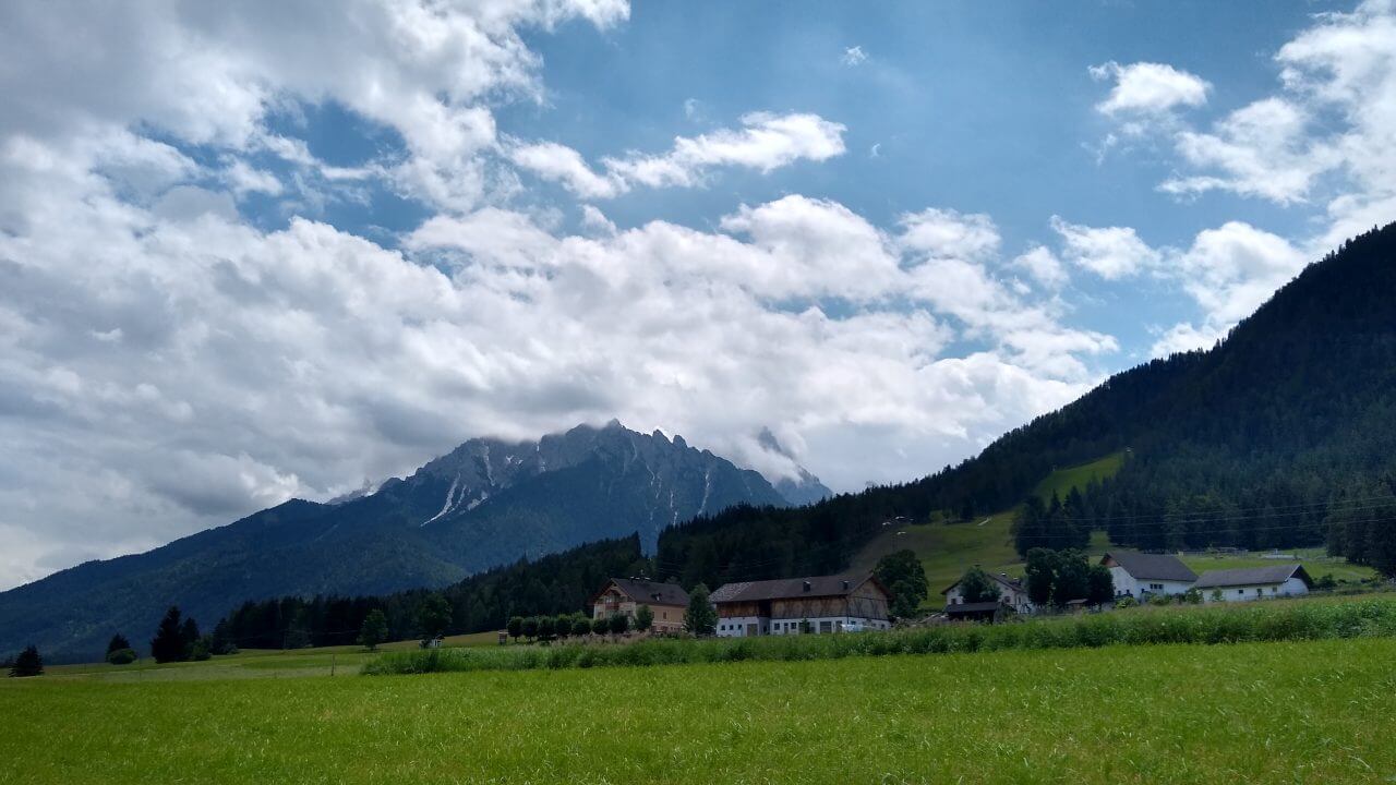Bei leicht bewölktem Himmel starten wir nach einem guten Frühstück und fahren erstmalig auf dieser Tour lange Strecken auf unbefestigten Wegen. Die Rienz begleitet uns weiter durchs Pustertal. Wir radeln insgesamt eine wunderschöne Strecke durch mehrere kleine Orte, auf vielen Waldwegen, aber stetig bergauf. Nach nur 30 Kilometern erreichen wir den Ferienort Toblach am Fuße der Dolomiten. Hier verbringen wir den restlichen Sommertag in einem kleinen Appartement „Haus Alpenblick“ (62,-€).