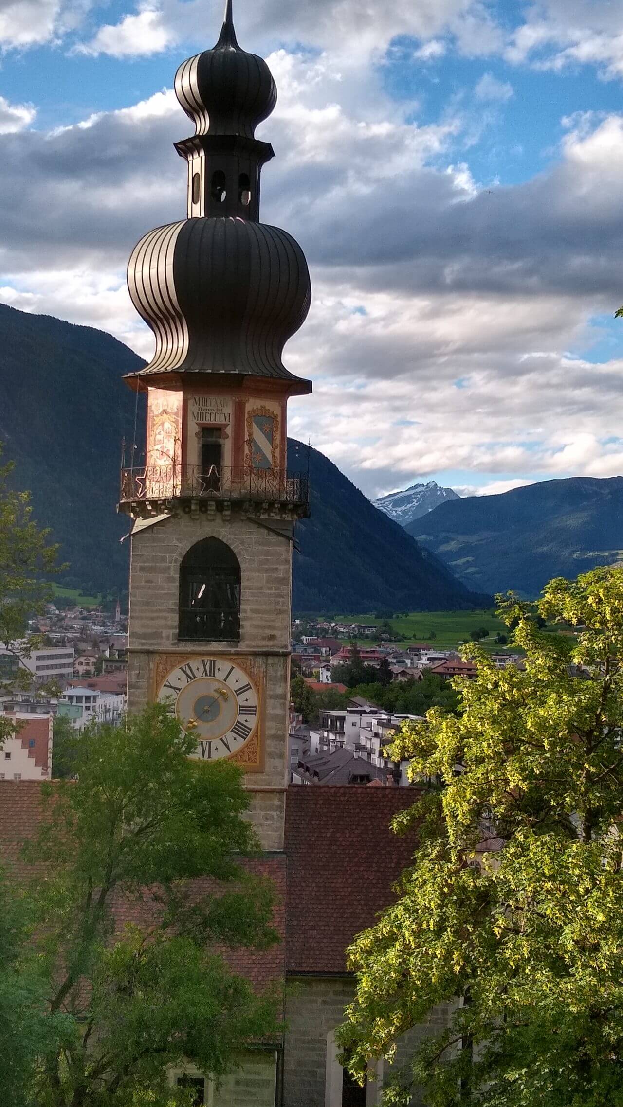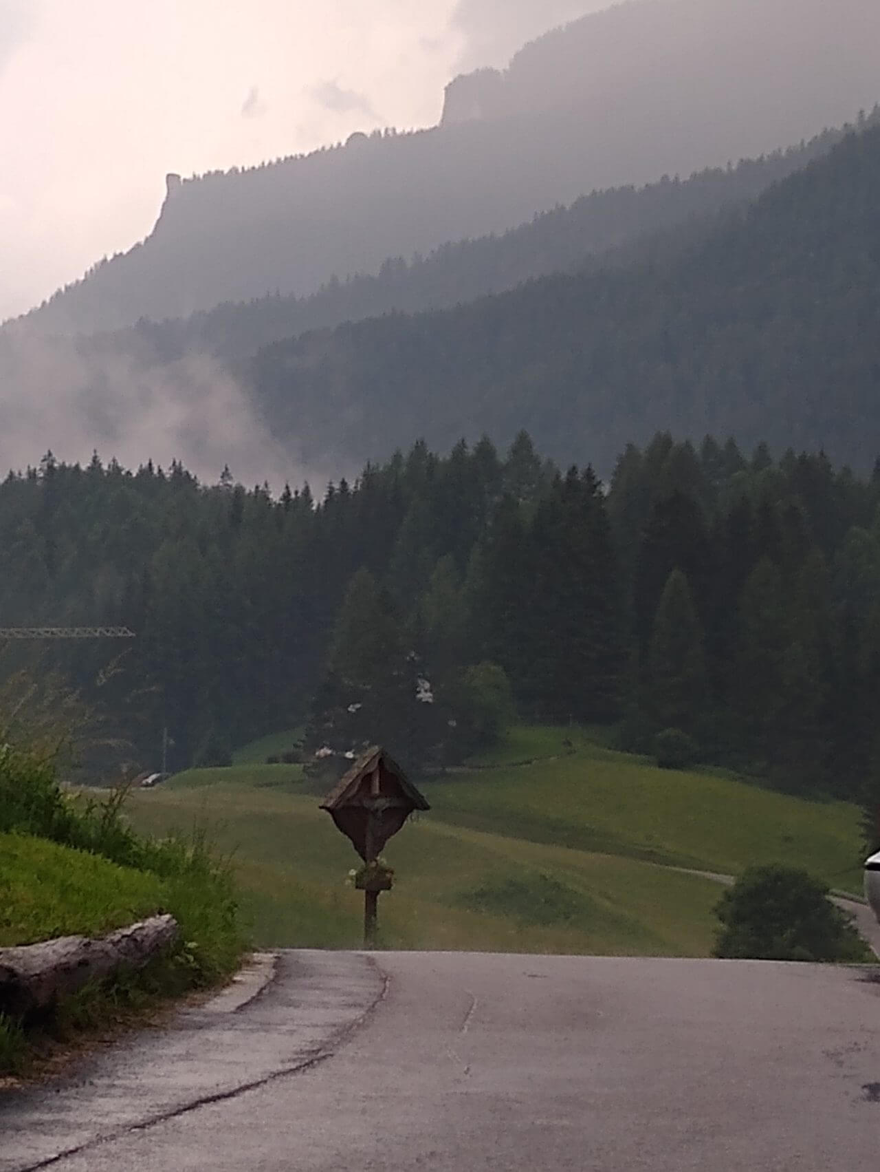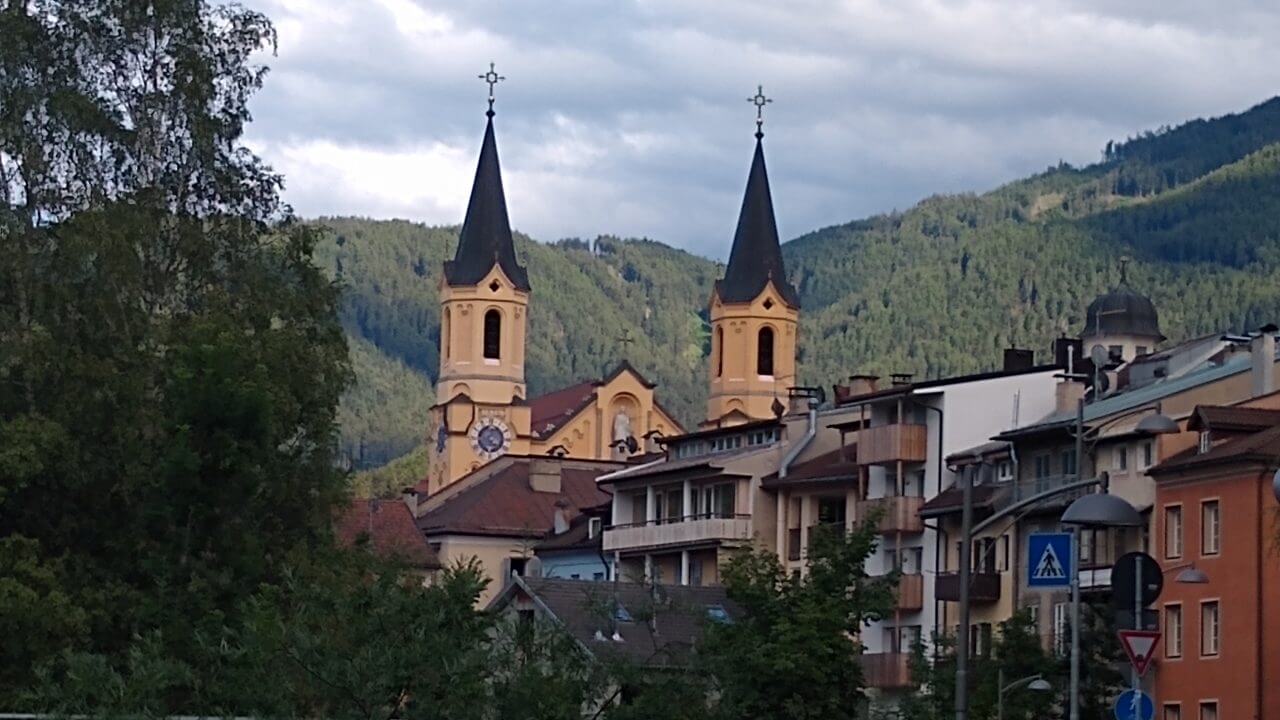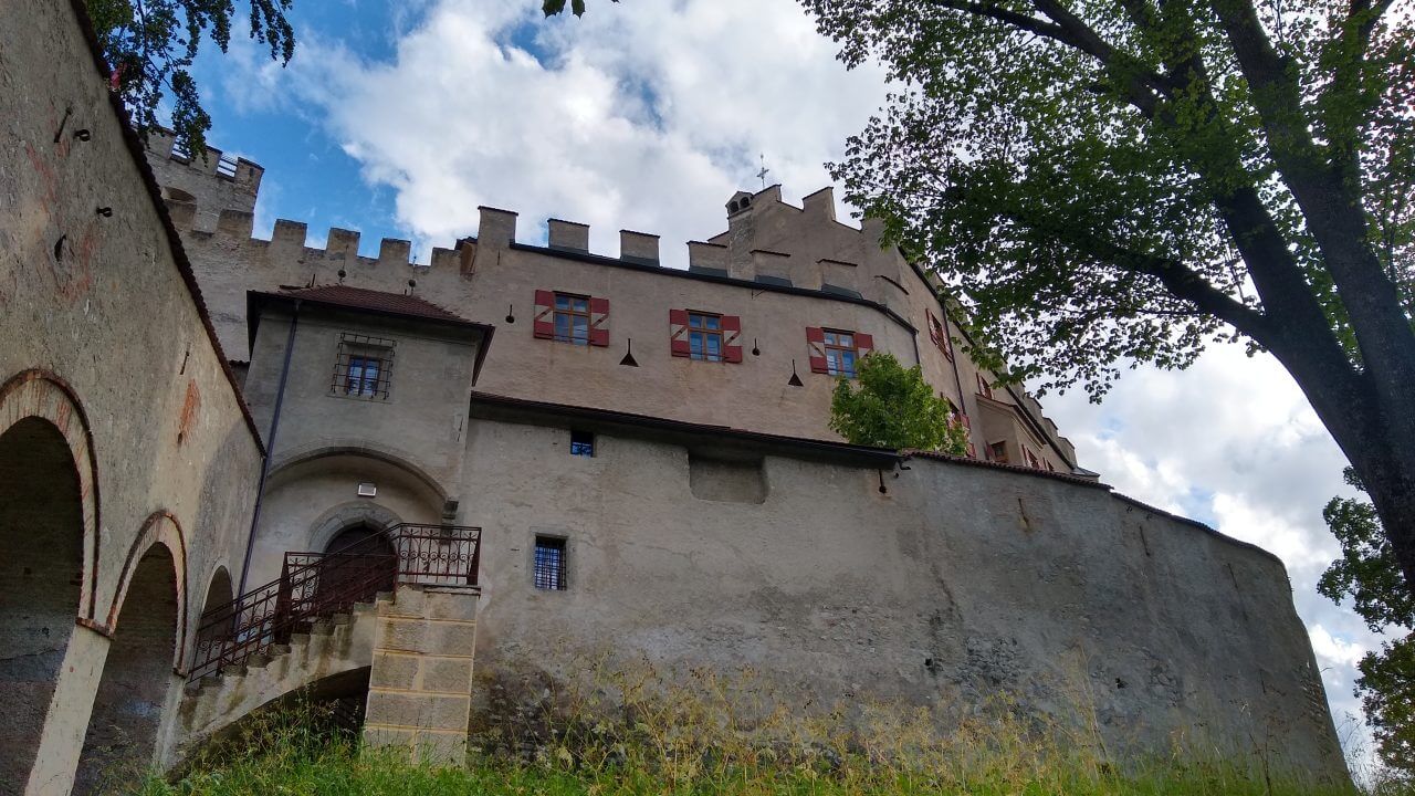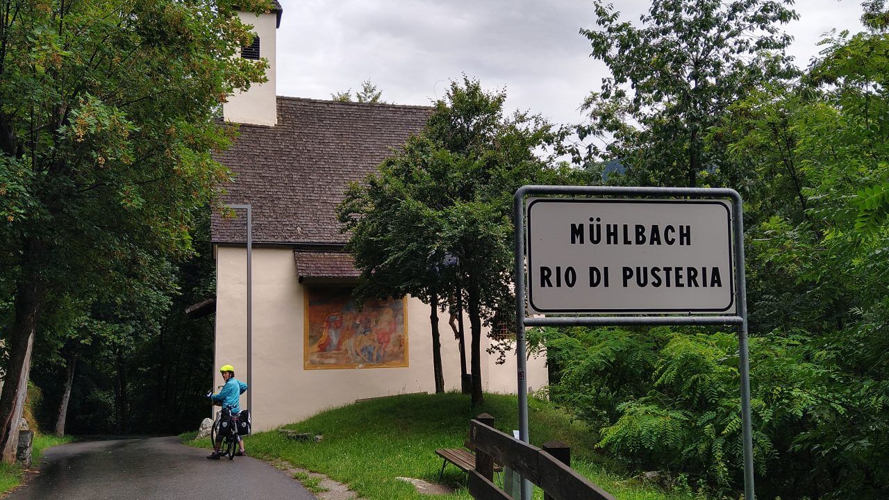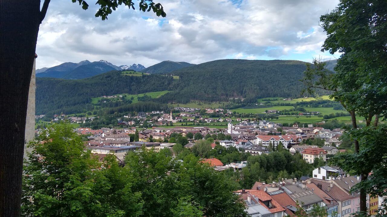 Nach einem gemütlichen Tag in Sterzing heißt es heute morgen nach einem super Frühstück wieder Abschied nehmen. Regen ist heute vorhergesagt, also schauen wir mal, wie weit wir kommen. Zunächst geht es über die ehemalige Burg Franzensfeste/Fortezza vorbei an den Baustellen des neuen Brenner Basis Tunnels bis nach Aicha/Aica. Dort flüchten wir im strömenden Regen zum erst besten Gasthaus und werden trotz Ruhetag ganz freundlich von den Wirtsleuten hereingebeten. Bei Cappuccino und Co führen wir interessante Gespräche und erfahren einiges über das Verhältnis Südtirol und Italien. Nachdem sich das Wetter wieder beruhigt, radeln wir weiter auf tollen Wegen. Ab hier zweigen wir ab ins Pustertal, erleben grandiose Landschaft und machen einen Stop in Mühlbach/Rio de Pusteria. Aus diesem Ort stammt die Familie von Josef Ratzinger, dem späteren Papst Benedikt. Die sehenswerte Stadt Brunneck erreichen wir nach 60 gefahrenen Kilometern und genießen unser Landebier bei herrlichem Sonnenschein. Das MMM Messner Mountain Museum hat heute leider geschlossen , trotzdem machen wir noch eine Runde um das Schloss mit seinen Außenanlagen, zumal es fußläufig von unserem „Hotel Krone“ (82,-€) zu erreichen ist.