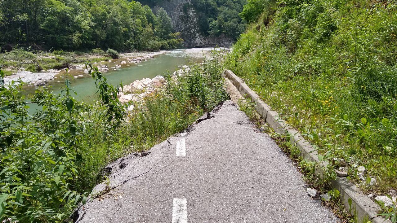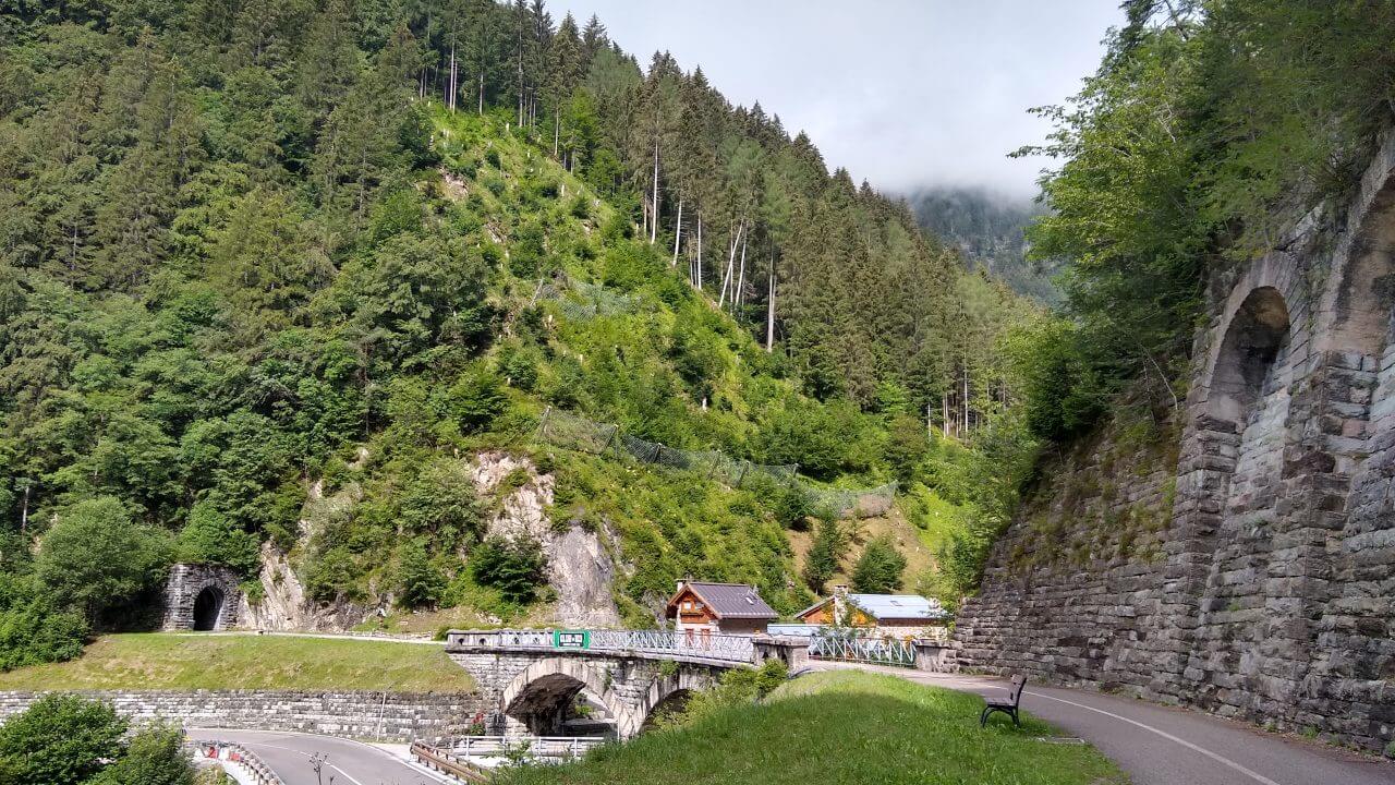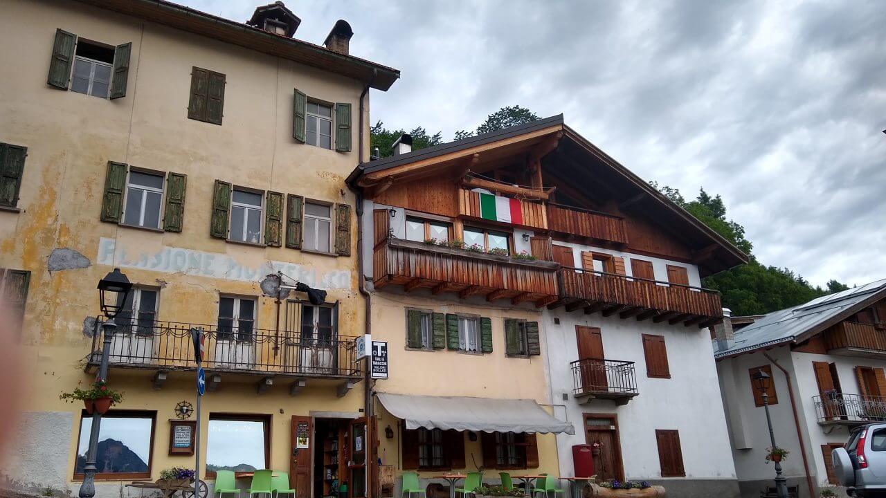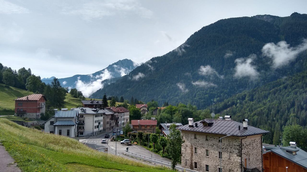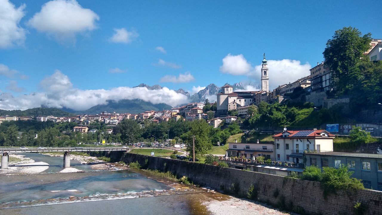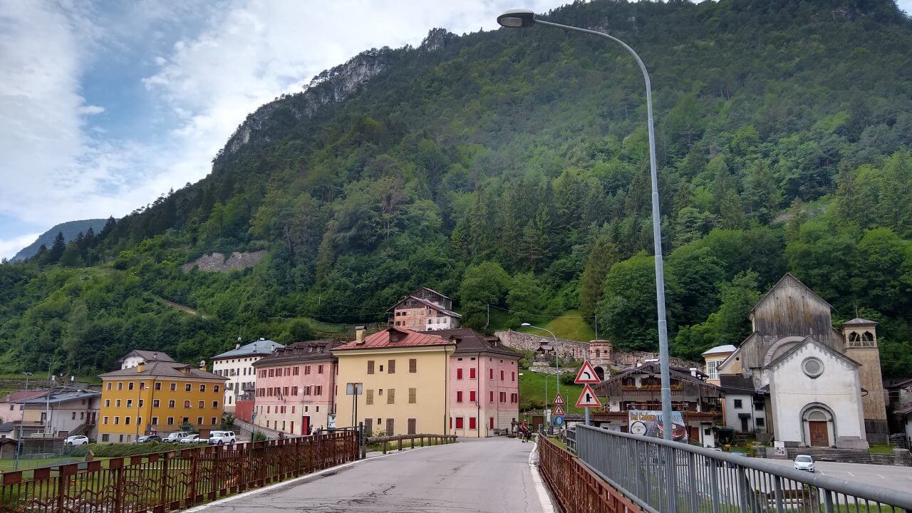 Nachdem unsere Klamotten tatsächlich alle wieder trocken sind, packen wir unsere Taschen und es kann wieder los gehen. Das Frühstück ist vorzüglich und der Regen hat sich auch verzogen. Bis nach Pieve di Cadore geht es immer nur bergab. Wir radeln zwischen steil aufragenden Felswänden immer entlang des Piave. Doch plötzlich ist der Radweg weggebrochen! Im Frühjahr hat es hier große Überschwemmungen gegeben, sicher noch ein Überbleibsel der fatalen Folgen in der Region…….Also wieder auf die Straße und nach einigen Kilometern können wir zurück auf den Radweg. Wir fahren durch kleine pittoreske Dörfer, sehr ursprünglich, aber teilweise auch recht trostlos, weil die Infrastruktur in dieser Region doch sehr zu wünschen übrig lässt. Ein tolles Radfahrerlebnis bietet uns die Abfahrt auf einer stillgelegten KFZ Straße die in Serpentinen in das Tal des Val di Cadore führt. Ohne jeglichen Autoverkehr können wir es hier richtig gehenlassen. So genießen wir auch schon bald nach 73 Tageskilometern ein kaltes Getränk in einer schattigen Bar mitten in Belluno. Einen Rundgang in dieser reizvollen Altstadt mit seinen vielen eindrucksvollen Palazzi, dehnen wir jedoch nicht sonderlich aus, da die Nachmittagshitze wieder voll zuschlägt. Und so radeln wir noch drei Kilometer weiter bis zu unserem „B & B La Pecora“ (54,-€) von dem wir angenehm überrascht sind, da es in zweiter Reihe zur Straße liegt und einen großen Garten hat. Somit steht einem gemütlichen Abend nichts mehr im Wege.