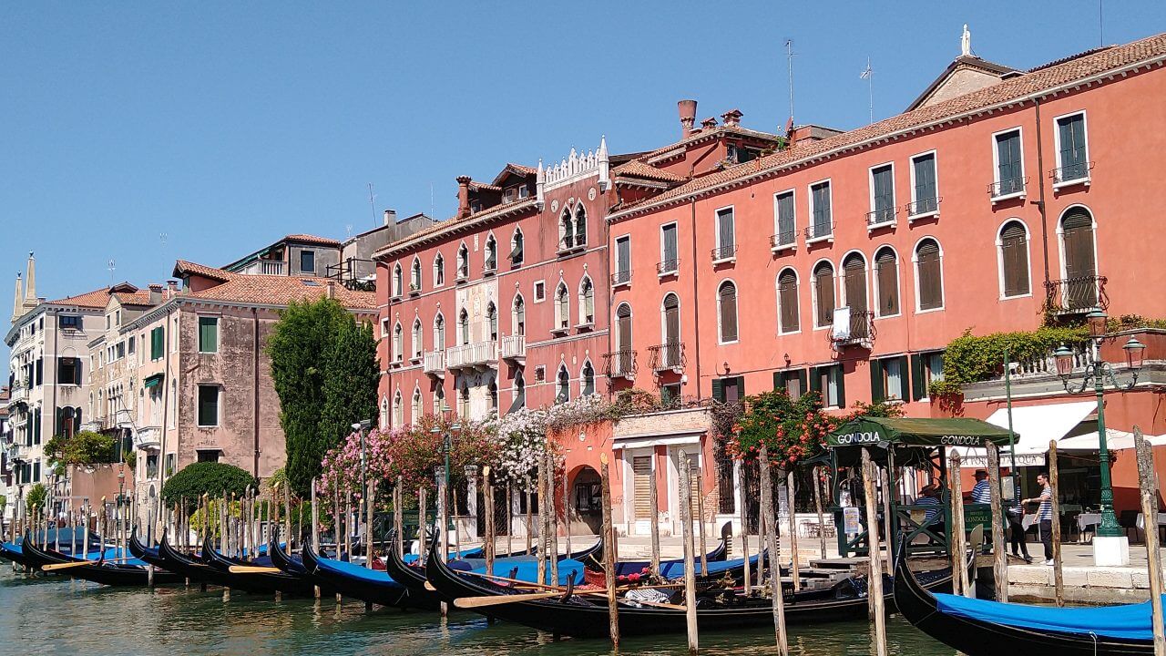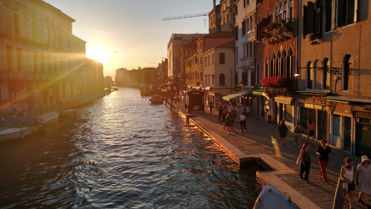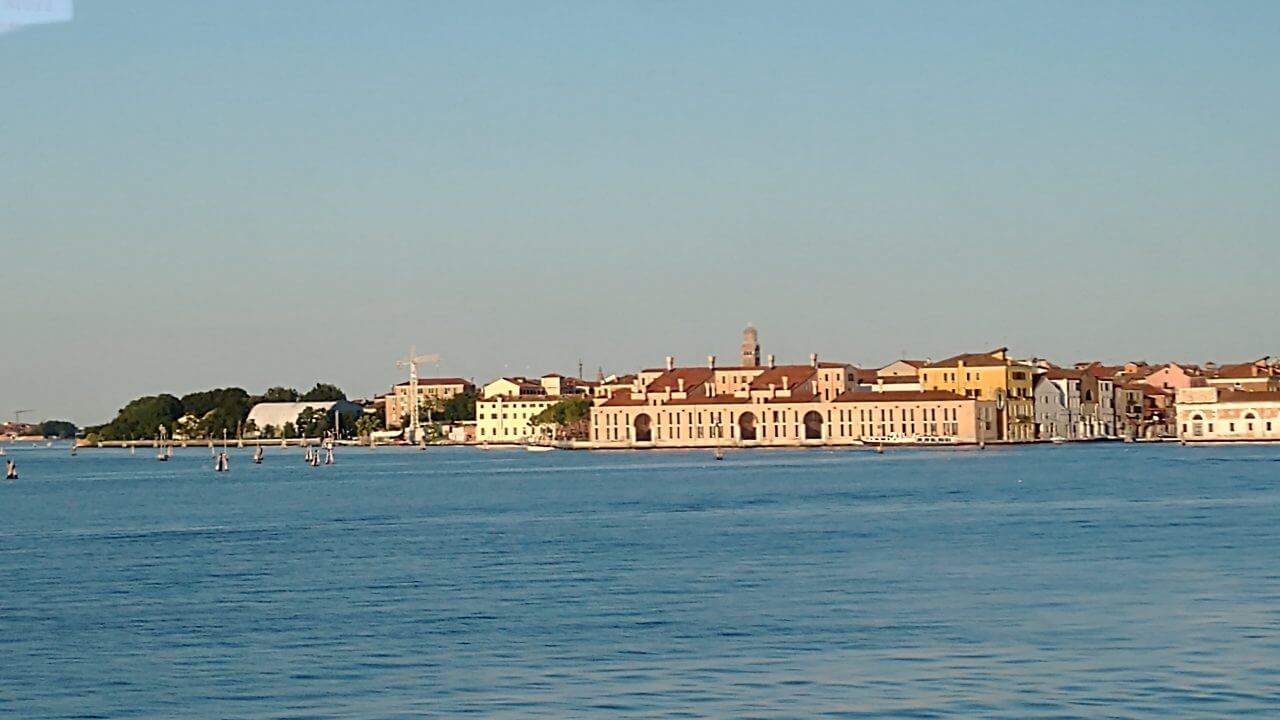 Nach dem spartanischsten Frühstück aller Zeiten (wir wissen ja inzwischen, dass den Italienern da Frühstück nicht so wichtig ist, aber abgepackter Zwieback und ein Getränk geht gar nicht!) Dafür geht es dann den ganzen Tag wieder überwiegend abwärts. Schon am frühen Mittag erreichen wir die schöne Stadt Treviso mit ihren vielen Kirchen, Museen, dem Dom, Cafés, Bars und netten Geschäften. Da wir hier auf unserer ersten Alpenüberquerung 2018 übernachtet haben, bleiben wir dieses Mal nicht länger und radeln nach einer kleinen Pause direkt weiter. Durch viele kleine Dörfer auf gut ausgebauten Radwegen erreichen wir am späten Nachmittag Mestre. In Mestre ist mit dem Fahrrad für uns Endstation, da Venedig für Fahrräder zum einen verboten und zum anderen auch gar nicht machbar ist. So buchen wir nach 96 gefahrenen Kilometern für drei Nächte im Hotel „Paris“ (48,-€) direkt am Bahnhof in Mestre ein Zimmer. Bevor es nun endlich in die Lagunenstadt per Bus geht, essen wir noch schnell eine Pizza in einem der Straßen Cafés. Und dann stehen wir endlich da und staunen – Bella Venezia!