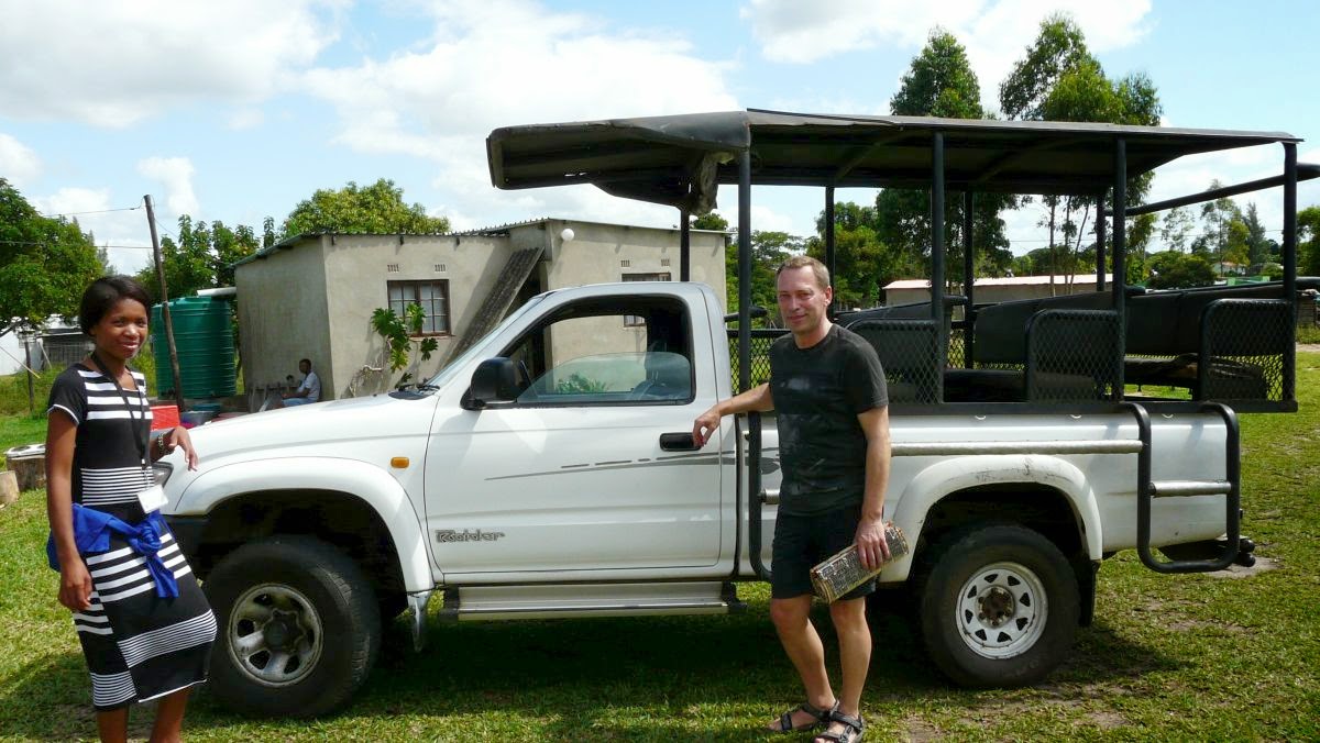 Auf uns wartet Tocho. Sie holt uns mit einem Tourauto ab, um uns mit in ihr Zulu-Dorf fünf Kilometer außerhalb mitzunehmen. Sie verdient sich als Guide ihren Unterhalt und so haben wir als Touristen die Möglichkeit, etwas mehr über das Leben der Afrikaner zu erfahren. Im Dorf sollen etwa 18.000 Menschen leben, 80% davon haben entweder keine Arbeit oder nur Gelegenheitsjobs.