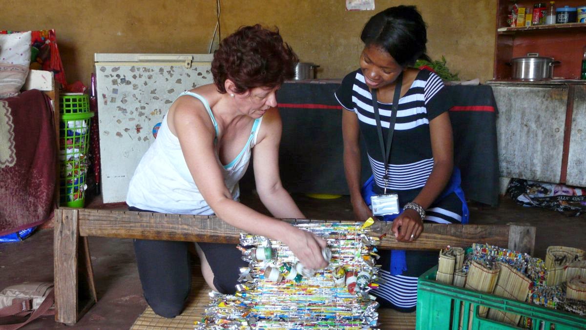 Um zum Lebensunterhalt beizutragen fertigt sie Platzdeckchen und Matten aus Rietgrashalmen. Farbe kommt ins Spiel indem sie die einzelnen Halme zuvor mit bunten Folienstreifen umwickelt. Dazu schneidet sie leere Chipstüten in schmale Streifen. Ein Holzgestell, dass an einen Webrahmen erinnert, dient ihr zur Unterstützung bei der Herstellung der Matten. Ich darf ihr eine Runde dabei helfen und wir kaufen ihr anschließend natürlich einige Sets ab. Sie lächelt und freundlich zum Abschied an, will uns ihr Alter aber nicht verraten – vielleicht weiß sie einfach auch nicht.