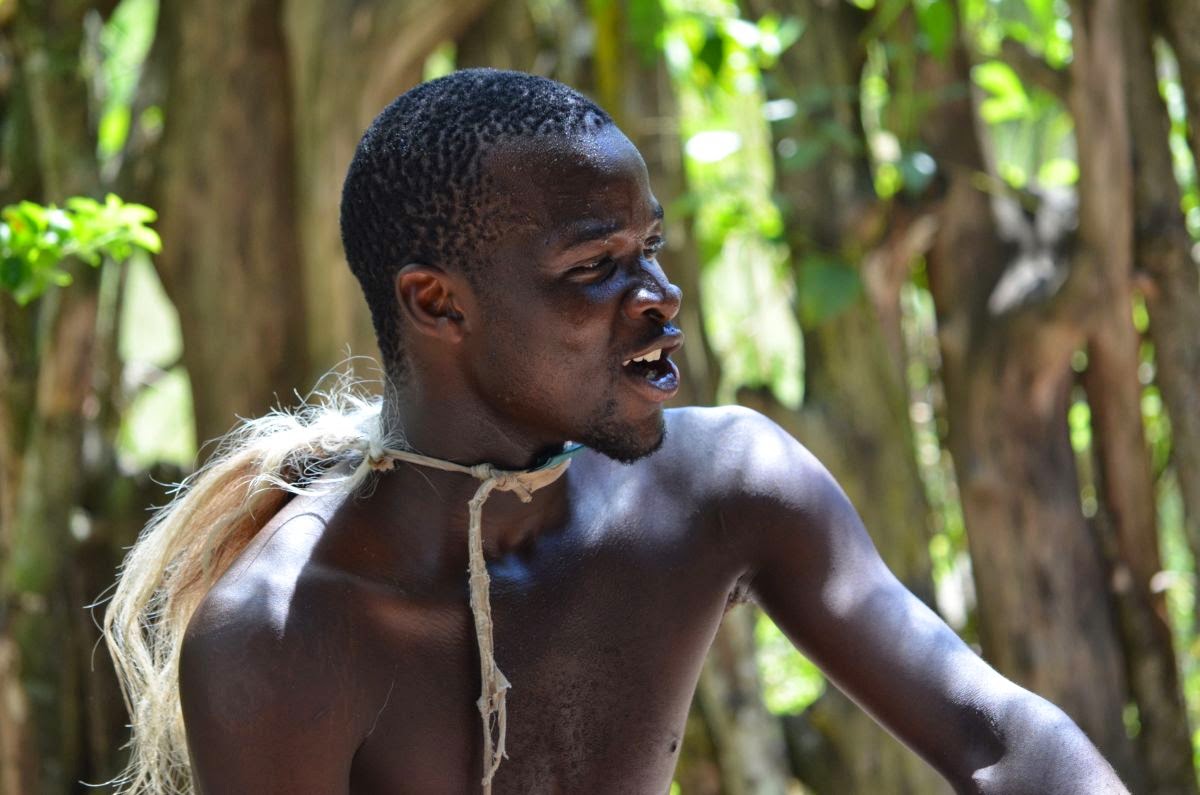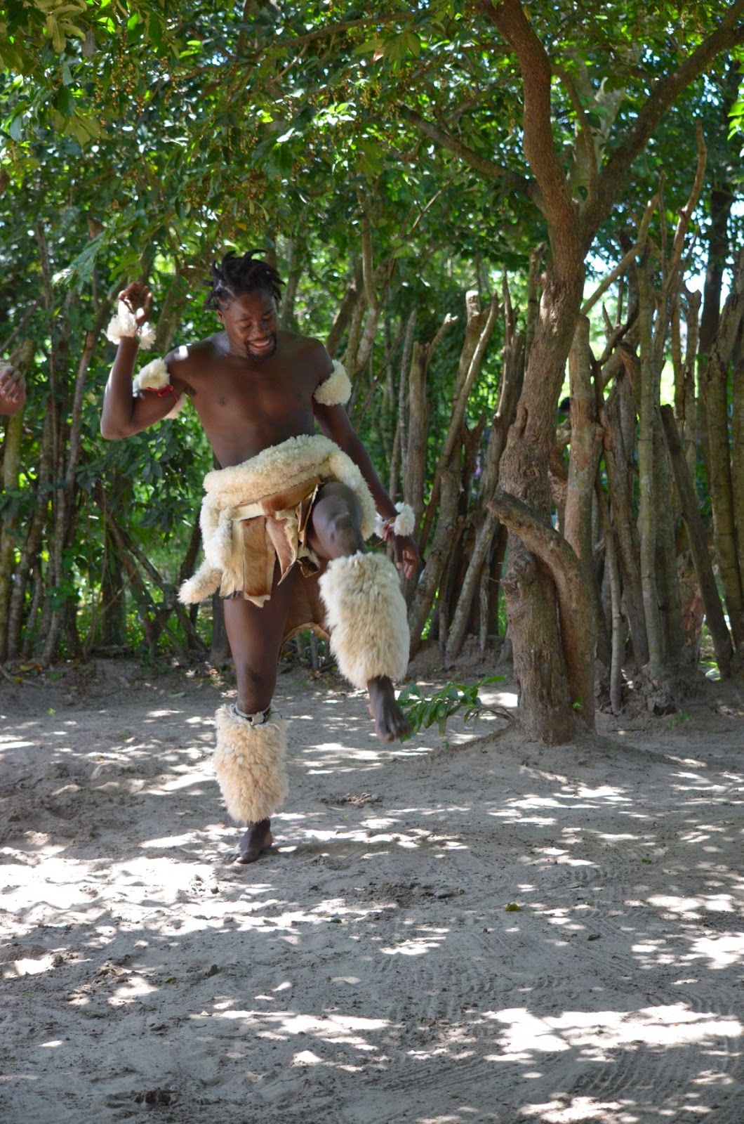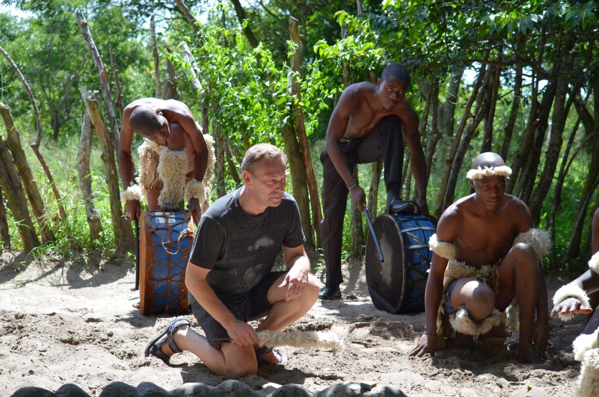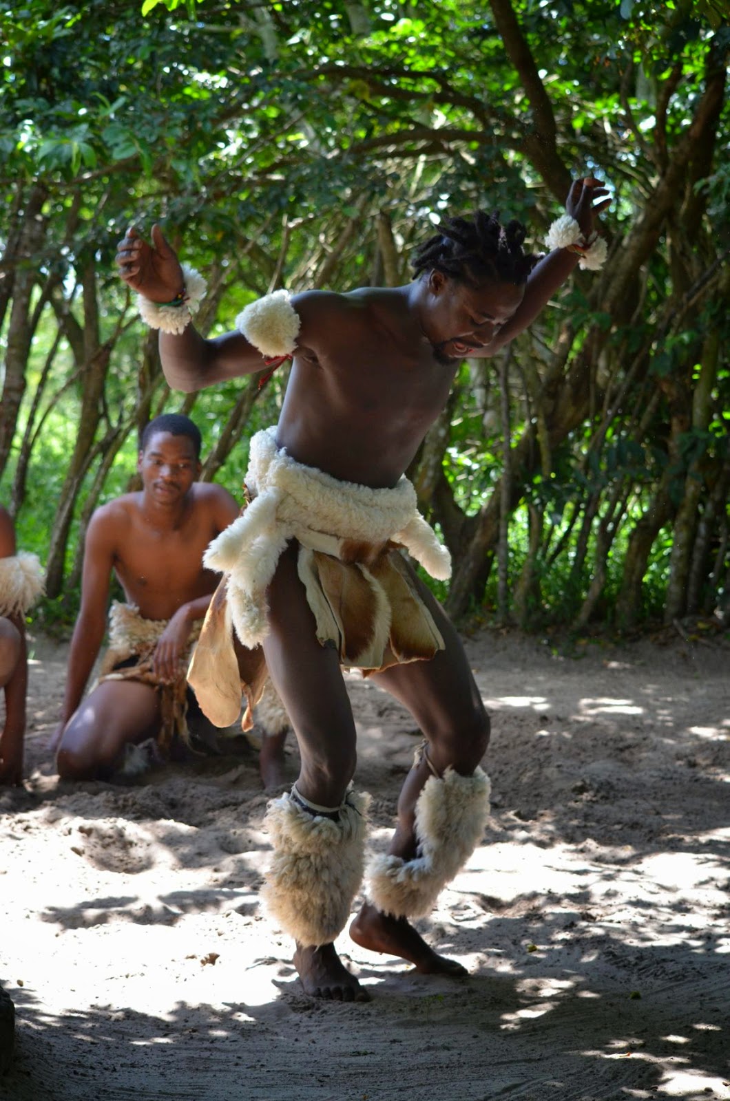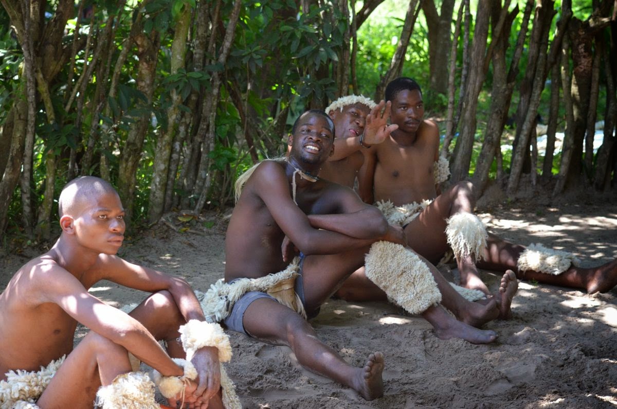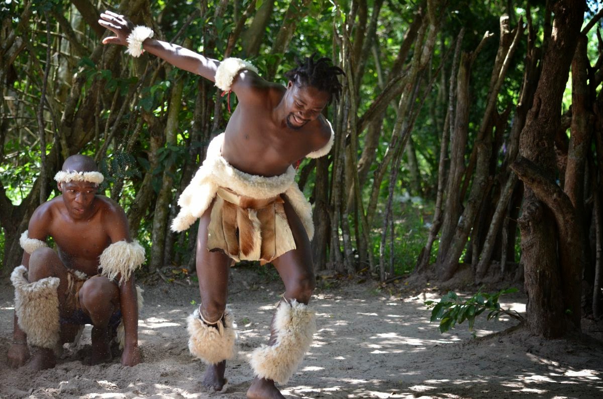 Zum Abschluss unserer exklusiven Rundfahrt bekommen wir noch einige rituelle und traditionelle Tänze des Zulustammes zu sehen. Tocho fährt mit uns in die Nähe ihres Wohnhauses, wo auf einem Platz sechs junge Männer mit ihren Trommeln auf uns warten. Sie haben sichtlich Spaß bei ihrer gesanglichen und tänzerischen Darbietung, die sie letztlich nur für uns vorführen.