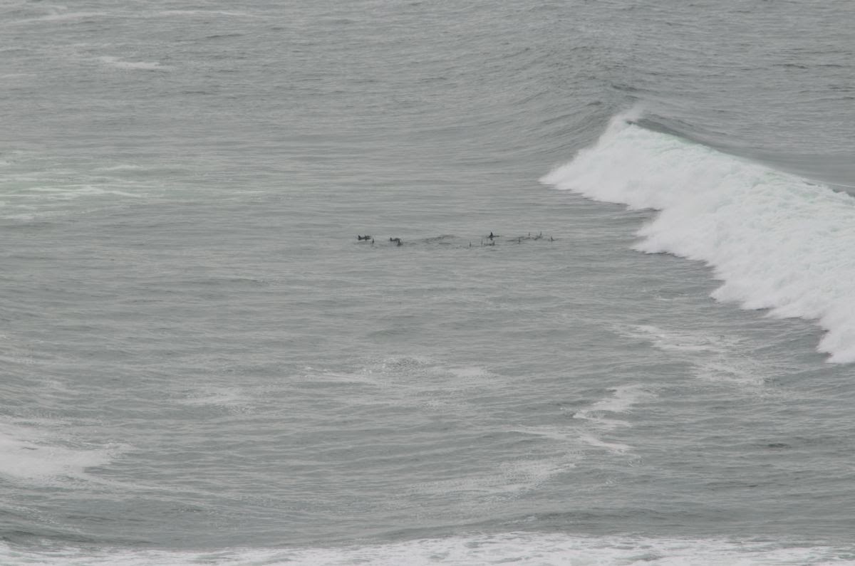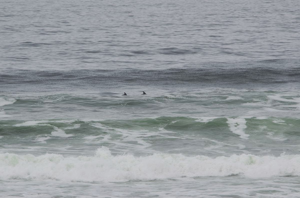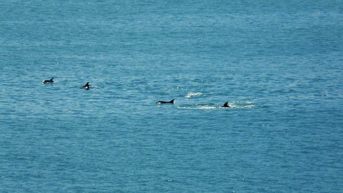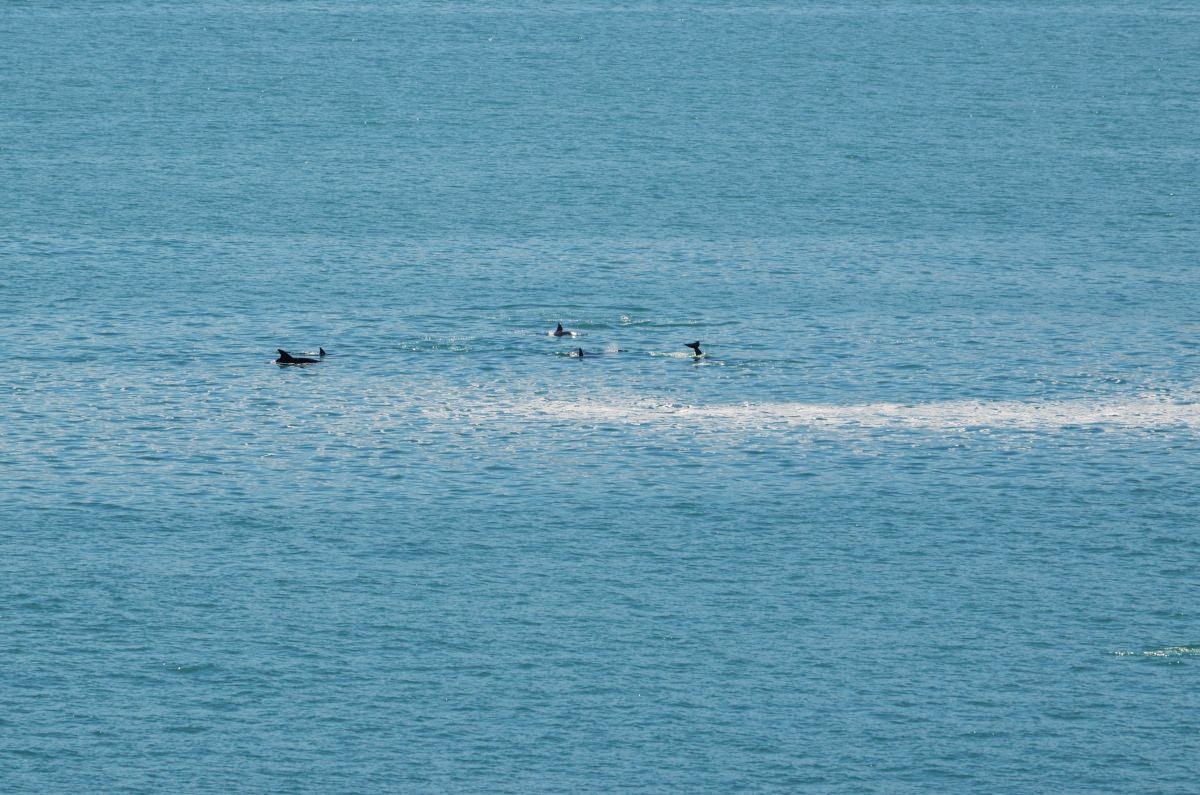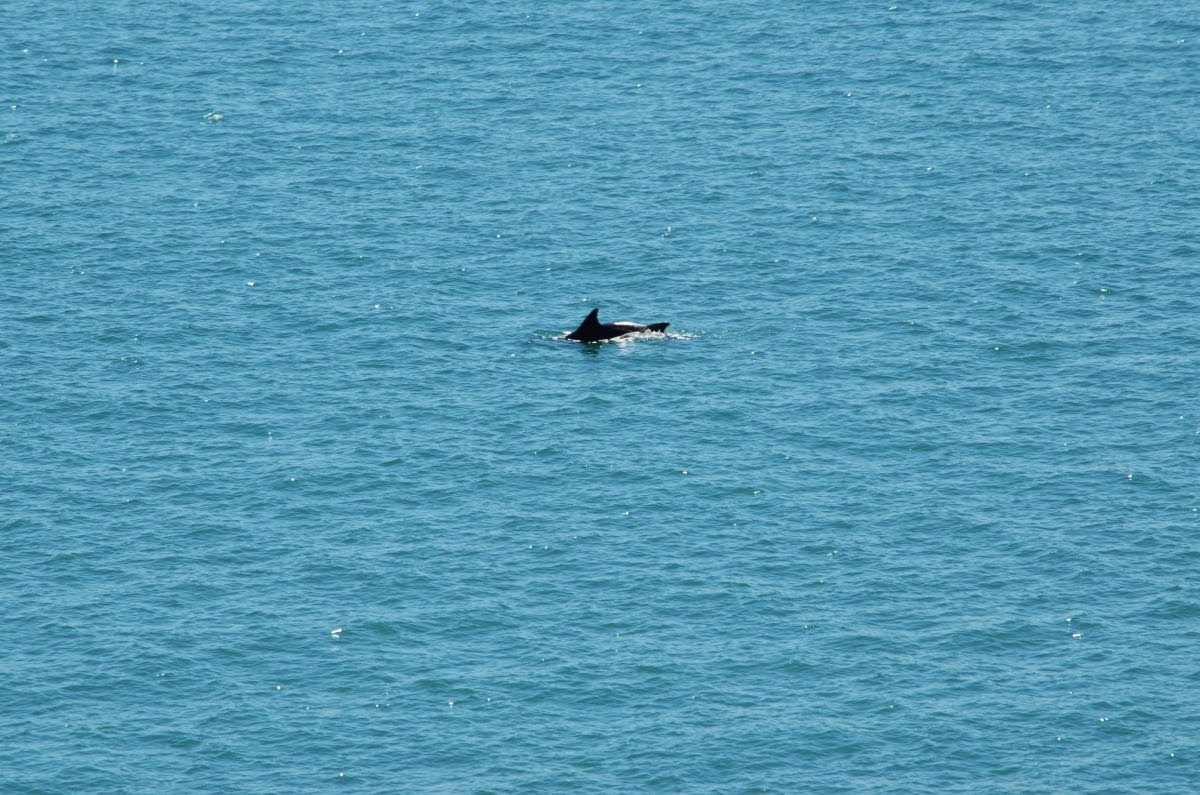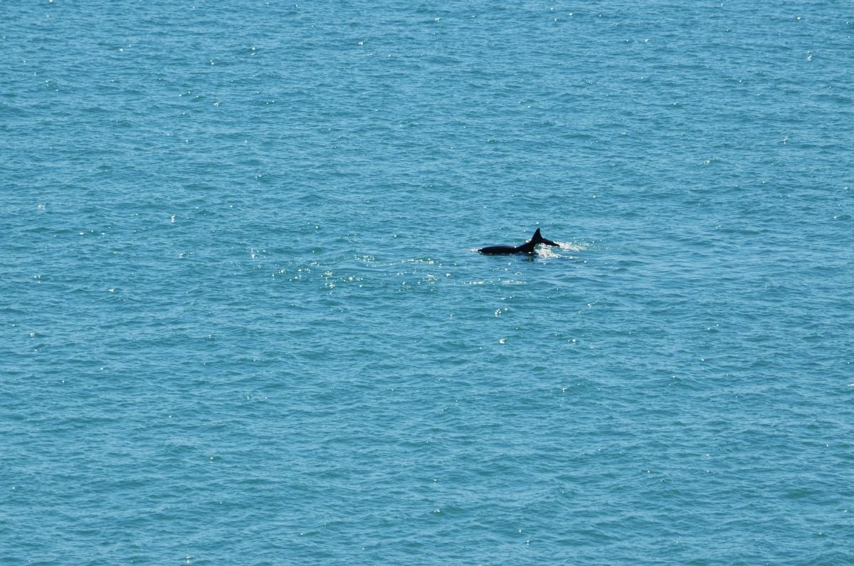 Und von hier aus sehen wir sie: einen ganzen Schwarm Delfine. Sie bewegen sich gemächlich jedoch mehr unter als über Wasser und so können wir leider nicht mit spektakulären Delfinfotos aufwarten – aber wir haben sie gesehen!