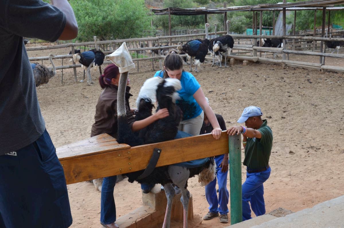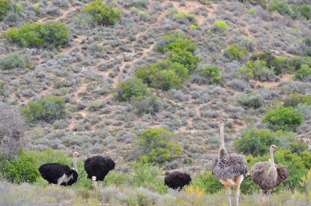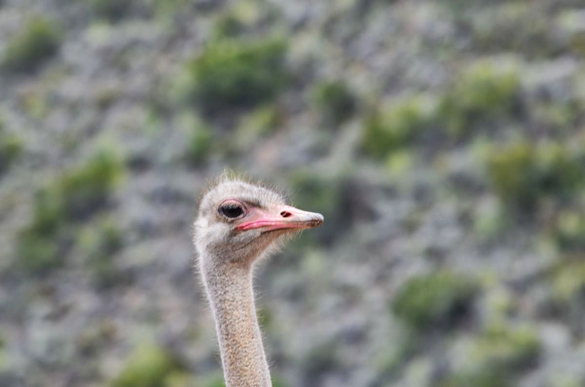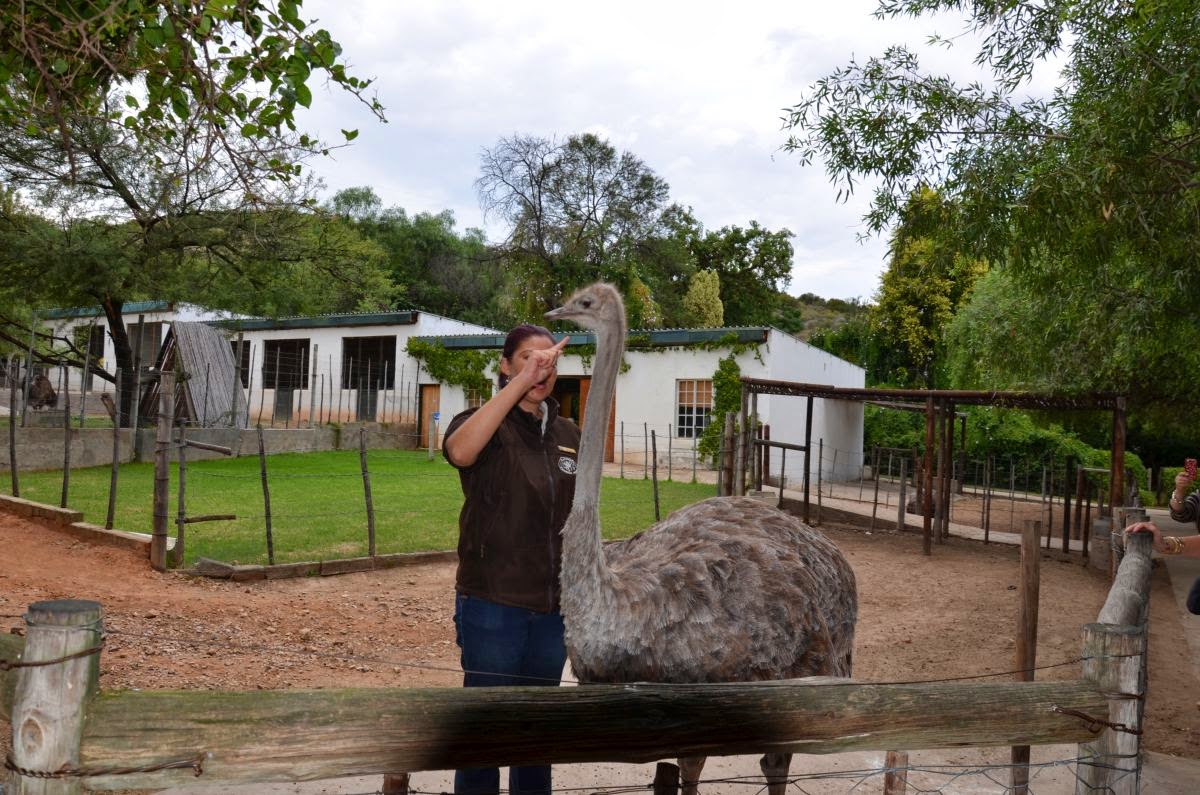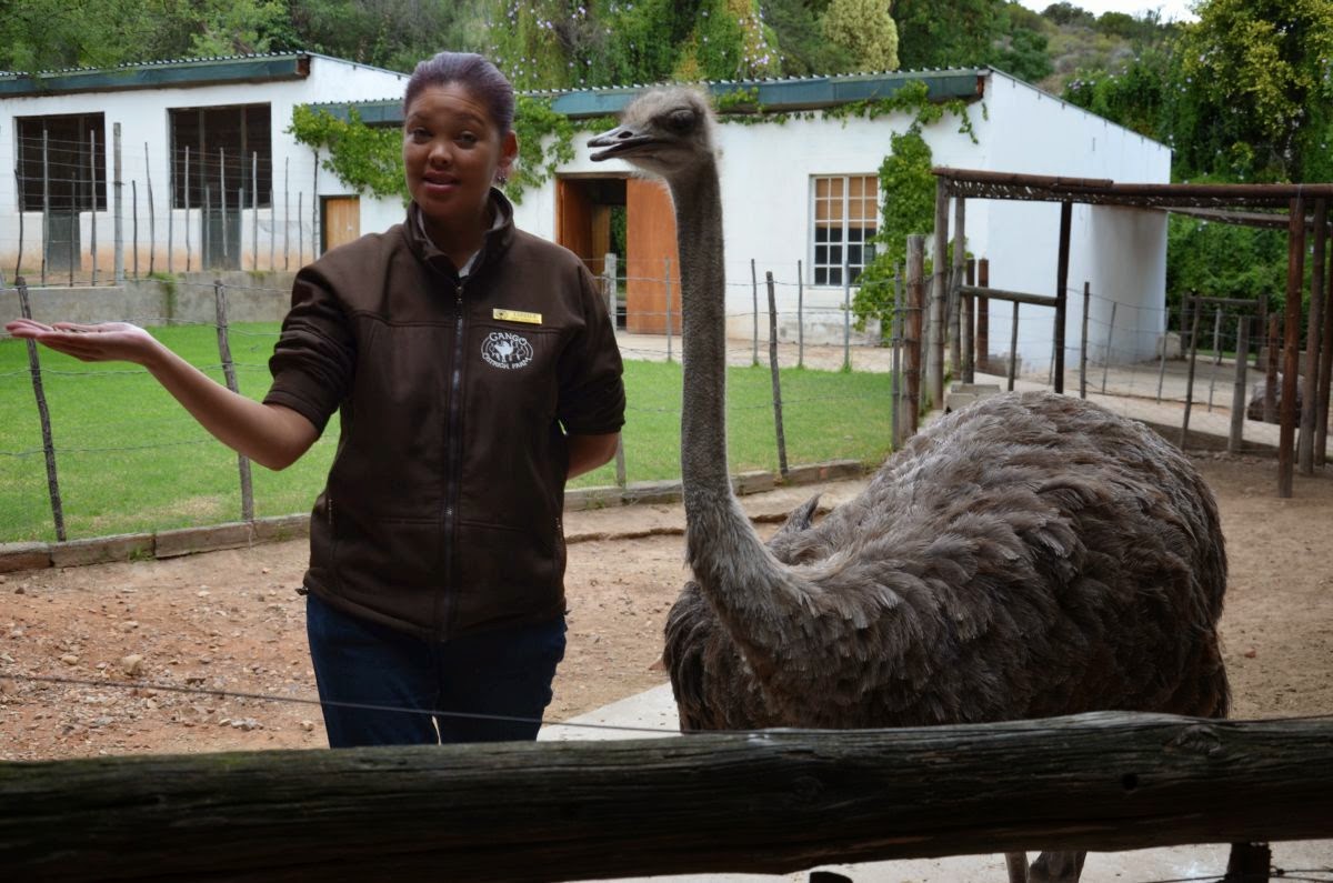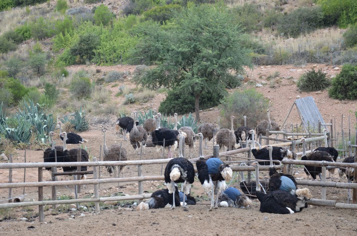 Plötzlich sehen wir anstatt Rinder unzählige Strauße auf den Weiden. Rund um den Ort Oudtshoorn befindet sich das Zentrum für die Straußenzucht in Südafrika. So besuchen wir auch gleich die Farm „Cango Ostrich Farm“. Hier lernen wir, dass der Strauß bis zu drei Meter hoch, 160 Kilo schwer und 40 Jahre alt werden kann. Im Sprint erreicht er bis zu 80 km/h und ist damit das schnellste Tier auf zwei Beinen. Ein Straußenei wiegt etwa 1,5 kg, sein Inhalt entspricht 24 Hühnereiern. Von einem Strauß erhält man etwa 15 kg hochwertiges Steakfleisch, das in Farbe, Struktur und Geschmack am ehesten dem Rindfleisch ähnelt.