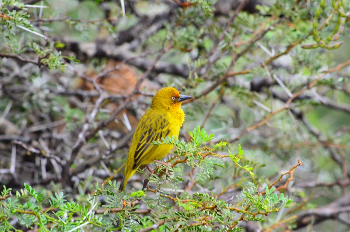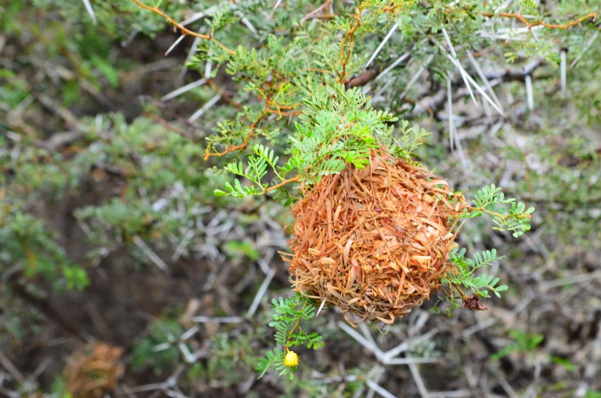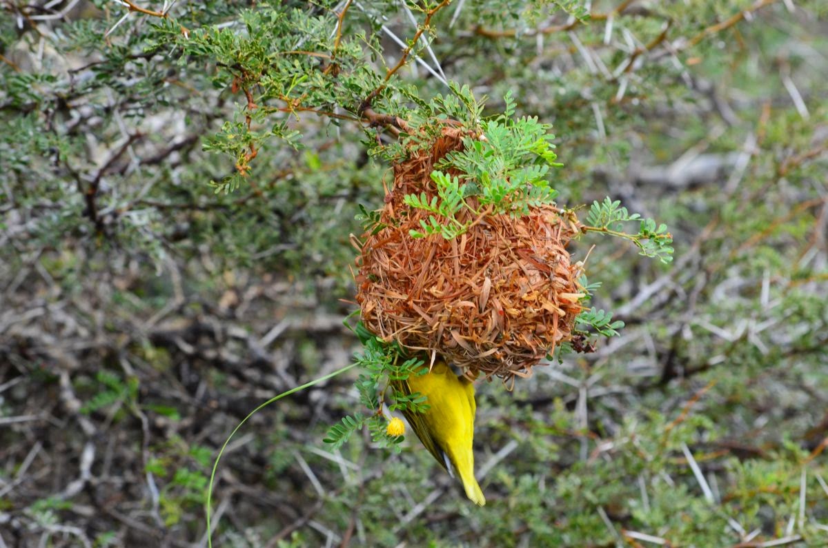 Unterwegs beobachten wir, wie ein Webervogel an seinem Netz webt. Bei den Webervögeln bauen vorwiegend die leuchtend bunt gefärbten Männchen die kompliziert gesponnenen, kunstvollen Hängenester mit langen, zugfesten und biegsamen Pflanzenfasern, Federn oder Wolle.