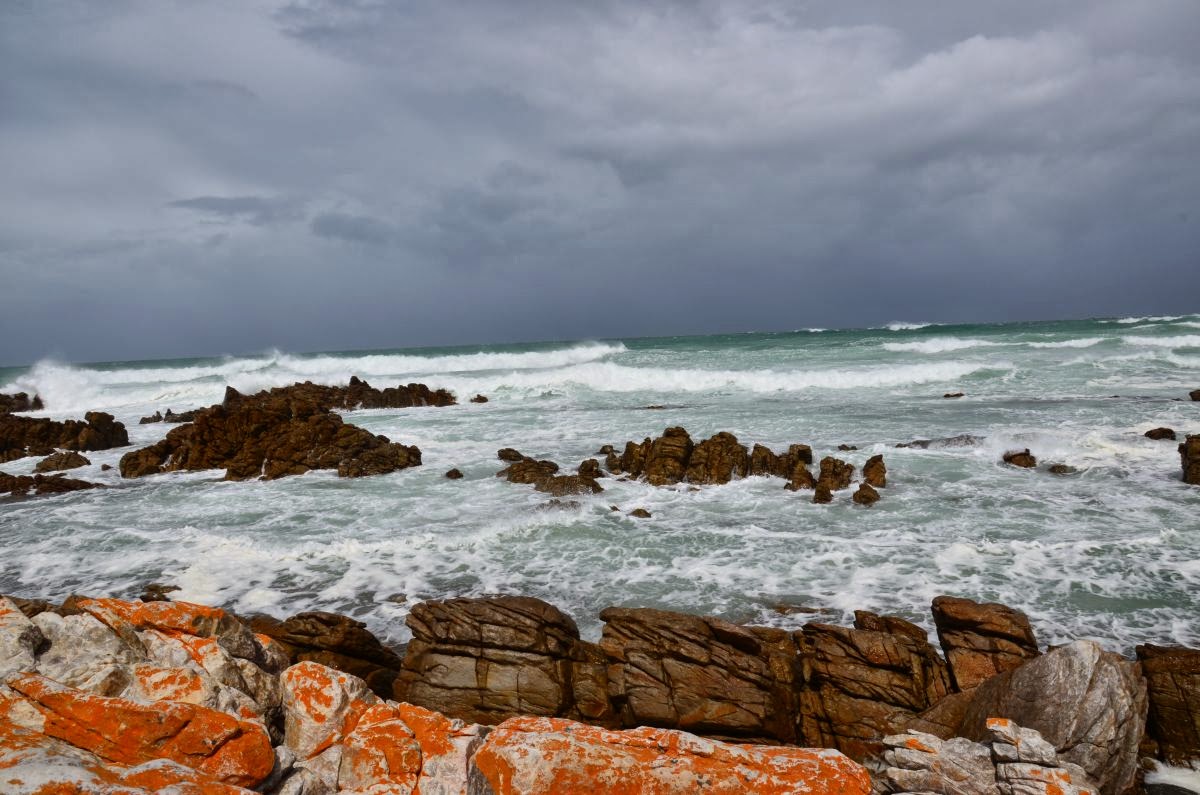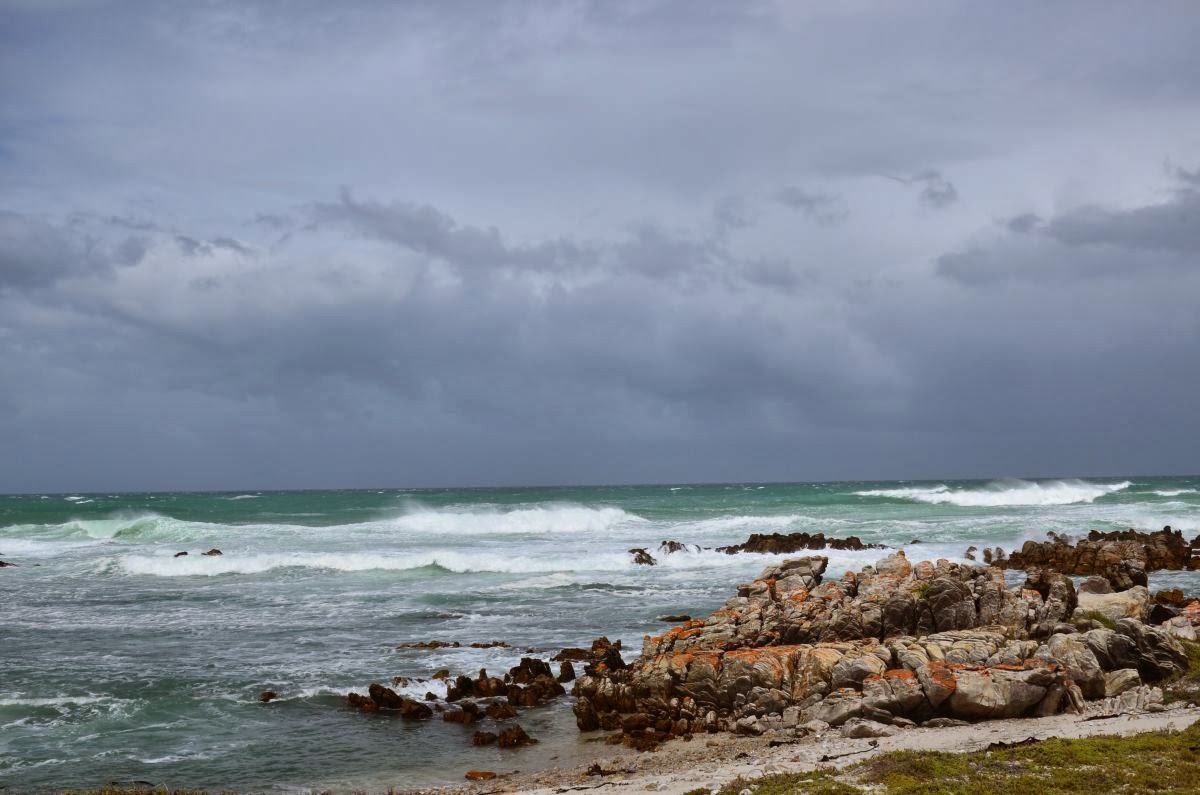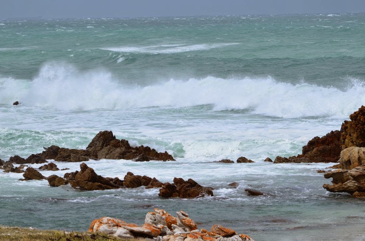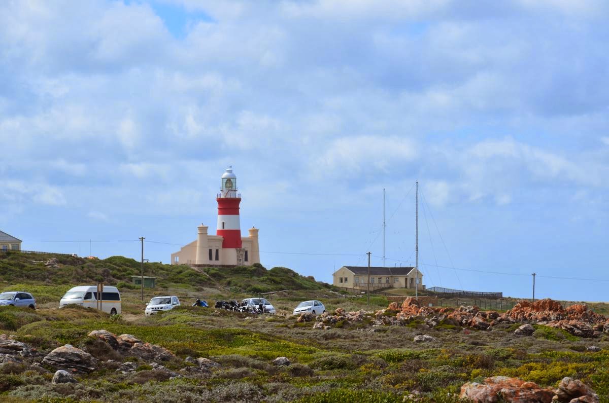 So machen wir uns also wetterfest gekleidet auf zum Cape Agulhas, wo Atlantischer und Indischer Ozean zusammentreffen. Cape Agulhas ist der südlichste Punkt Afrikas und nicht das Kap der Guten Hoffnung, wie fälschlicherweise oft angenommen wird. Der 1848 erbaute Leuchtturm leitet die Schiffe, die am Horizont vorbei ziehen. Hier stehen wir also nun – tatsächlich am Ende des Kontinentes Afrika. Ein ganz besonderes Gefühl, wenn man bedenkt, dass nach diesem festen Grund, auf dem wir stehen, nur noch tausende von Kilometern Meer nach Süden, Westen und Osten vor uns liegen.