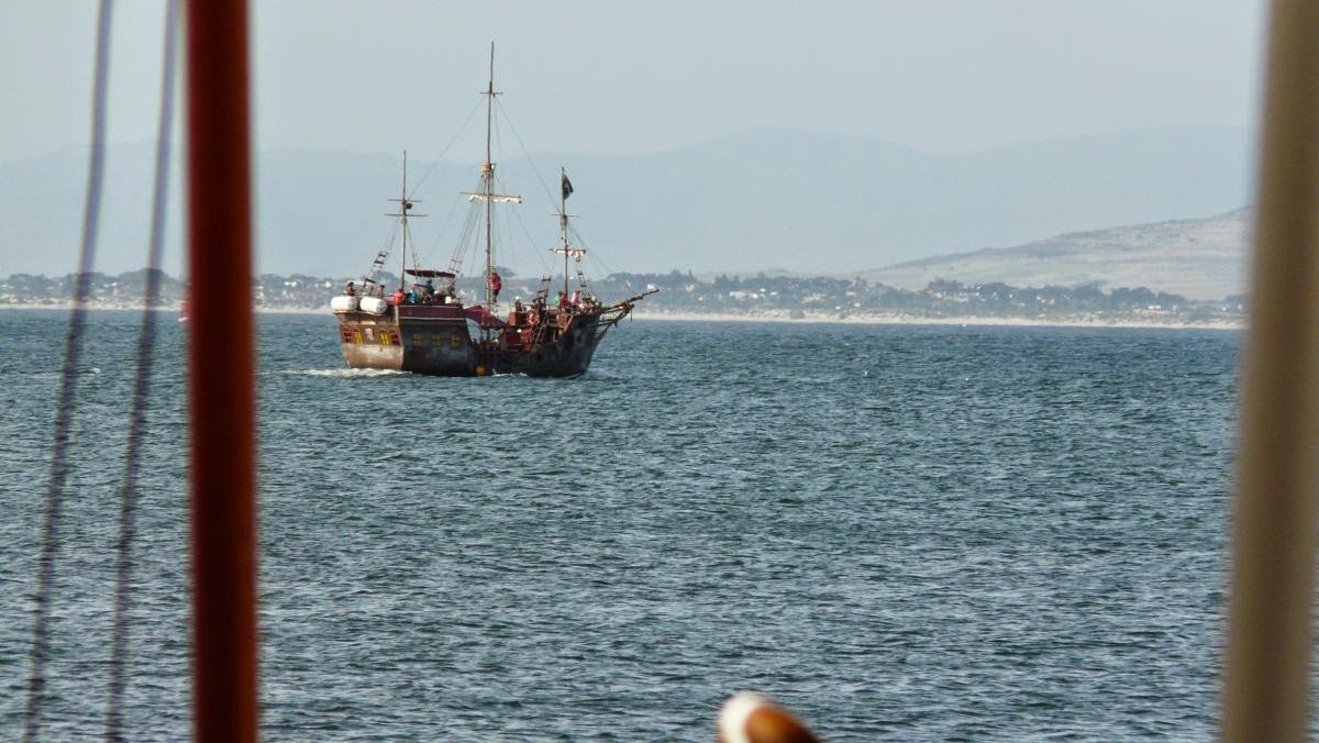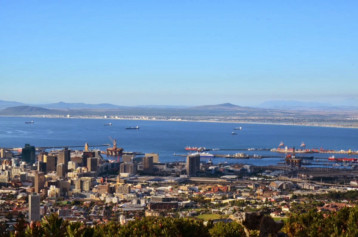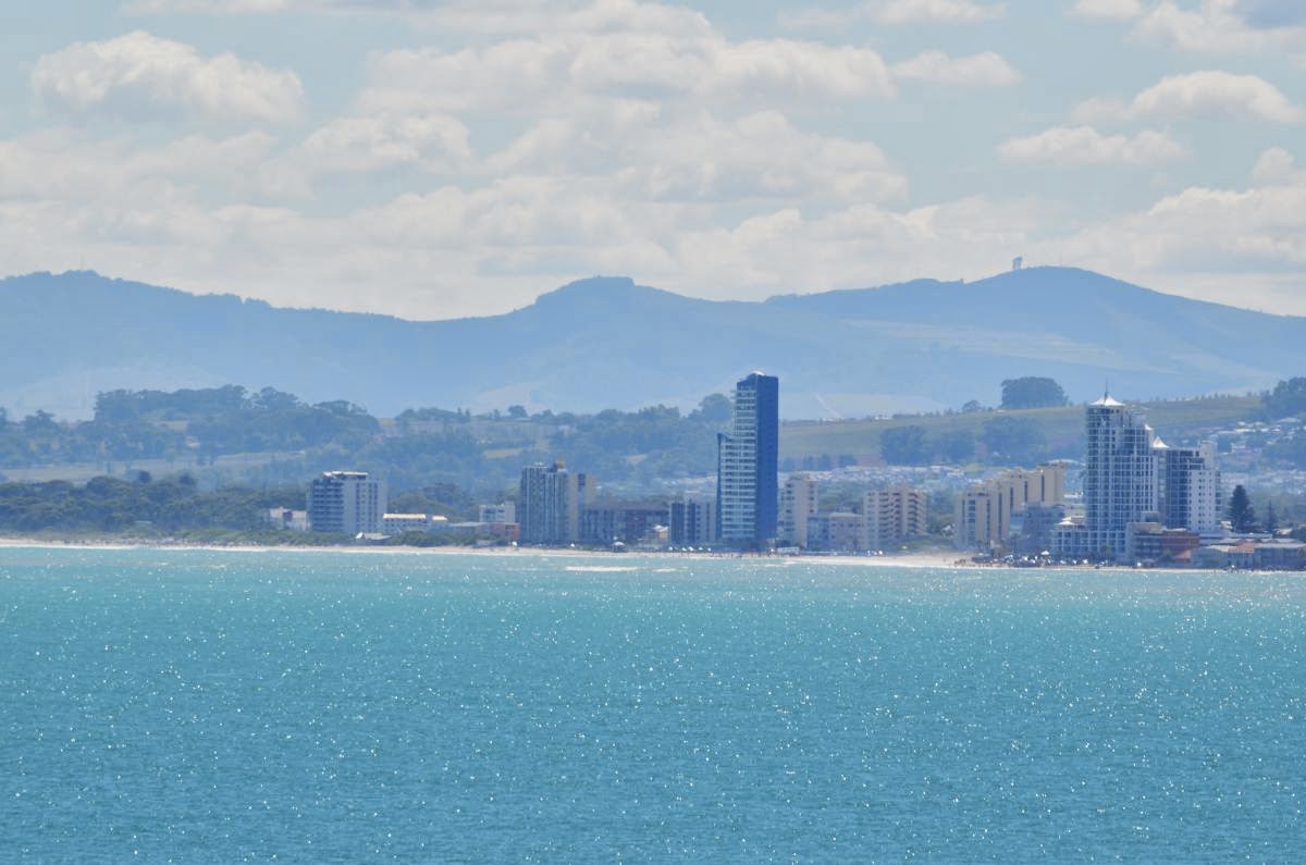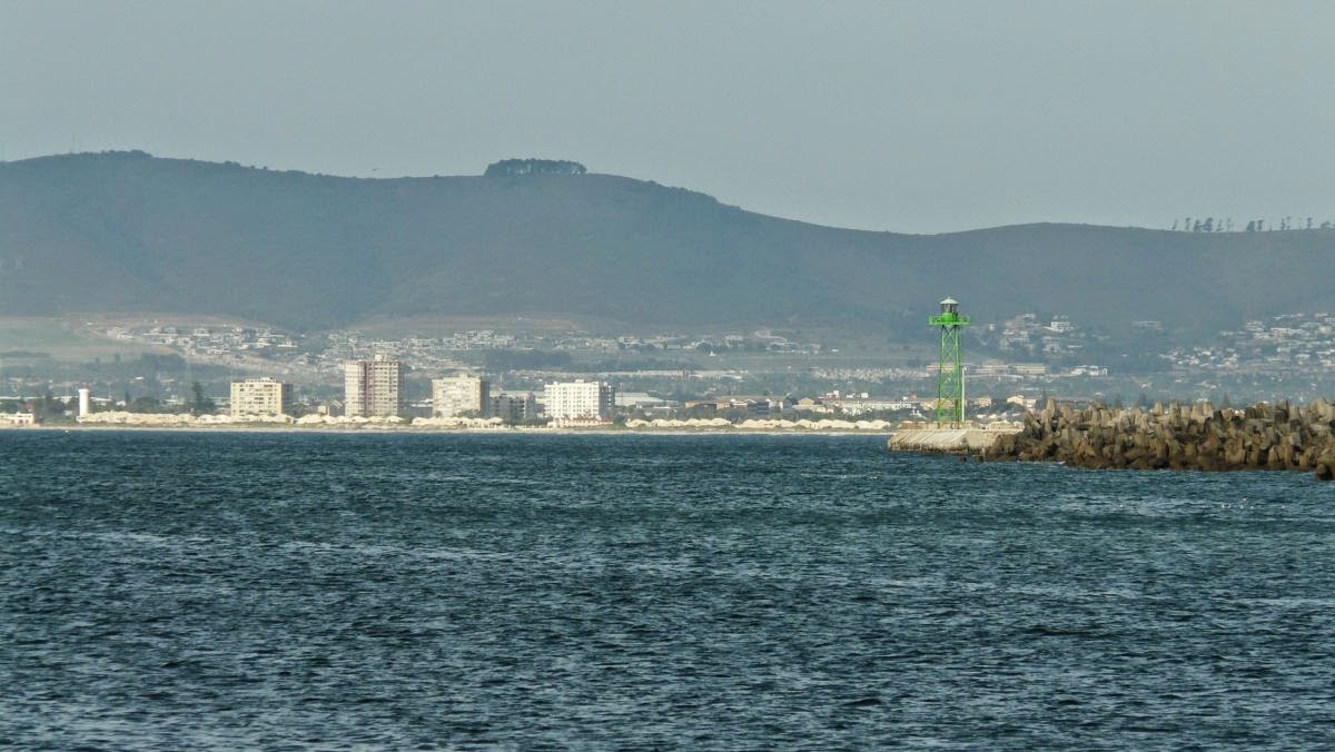 Plötzlich ist an der False Bay Kapstadt in Sicht. Zwar noch recht verschwommen und noch weit entfernt aber der Endpunkt unserer Reise ist erstmals in Sicht.