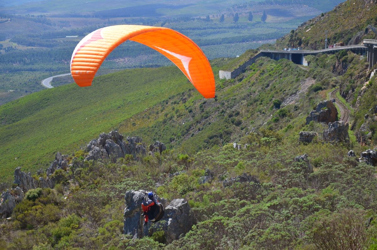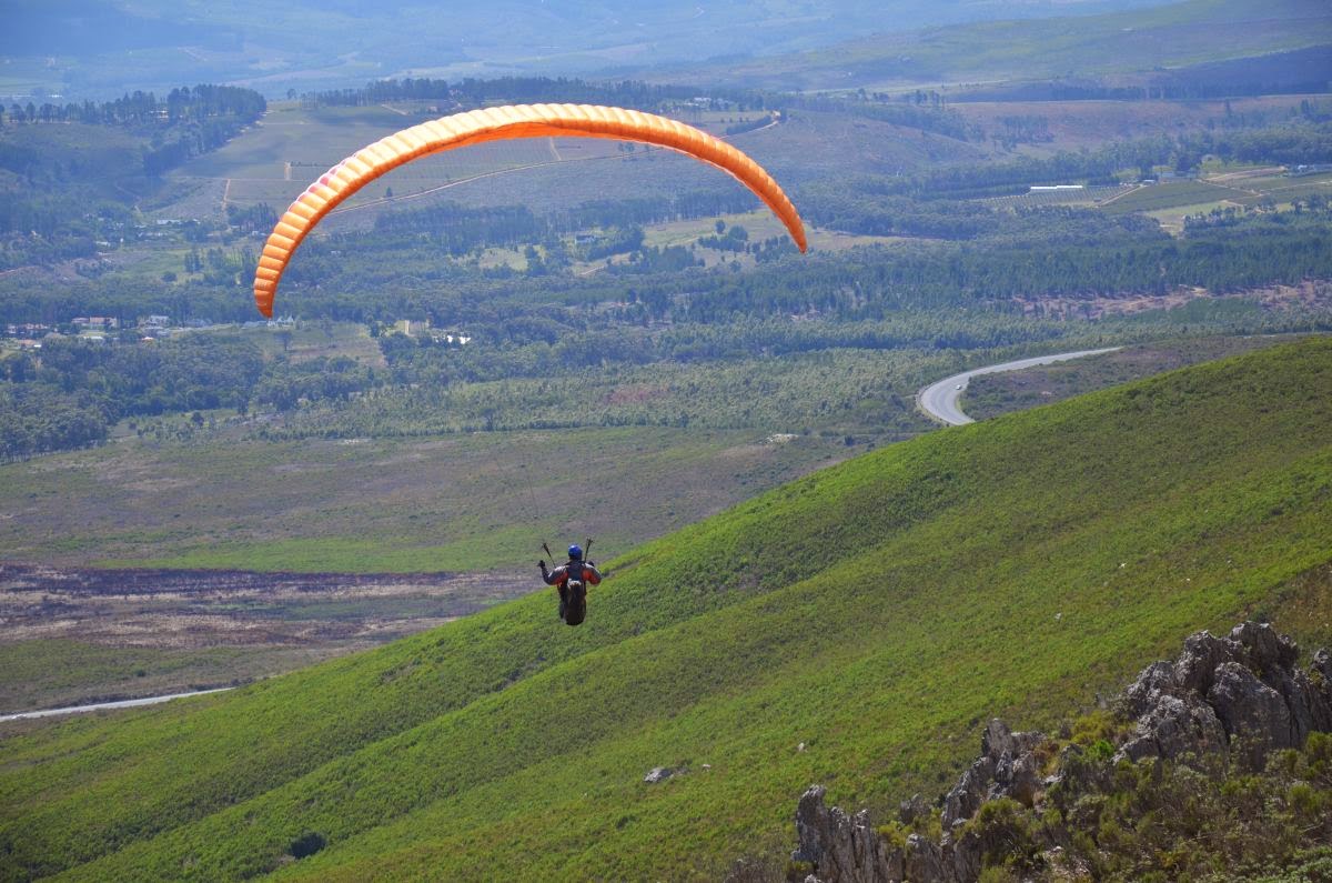 Sobald wir die erste Anhöhe erreicht haben, startet vor unseren Augen ein Gleitschirmflieger.