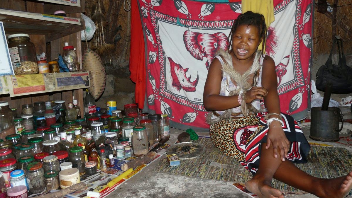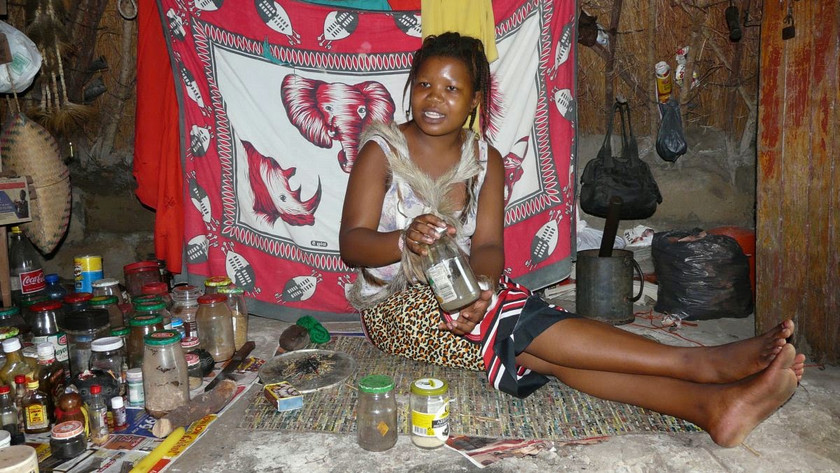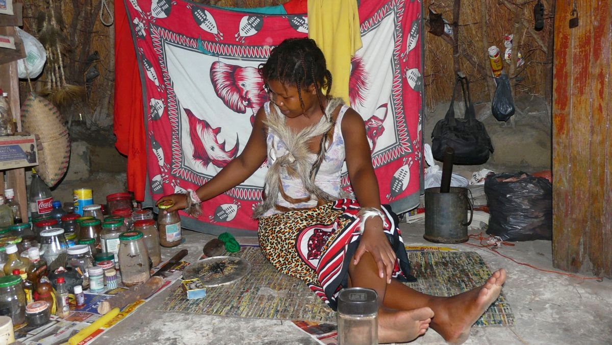 Wir steigen wieder auf unseren Wagen und werden auf Wegen, die kaum als solche zu erkennen sind, zur nächsten Familie gefahren. Eine junge Medizinfrau zeigt uns ihre Naturheilmittel. Aus Höflichkeit und Respekt lassen wir unsere Schuhe draußen vor der Hütte stehen und sitzen ihr gegenüber auf Strohmatten. An der Wand hängt ein Zertifikat, dass belegt, dass sie sechs Monate bei einem traditionellen Heiler eine Ausbildung genossen hat. Jeder aus dem Dorf kann sich für ein paar Rand Hilfe und alternative Medizin holen. Bei Kopf- und Zahnschmerzen, Schlafproblemen bis hin zu Potenzstörungen ist Man(n) bei ihr gut aufgehoben. Wir verabschieden uns jedoch, ohne irgendeine Medizin zu erwerben.