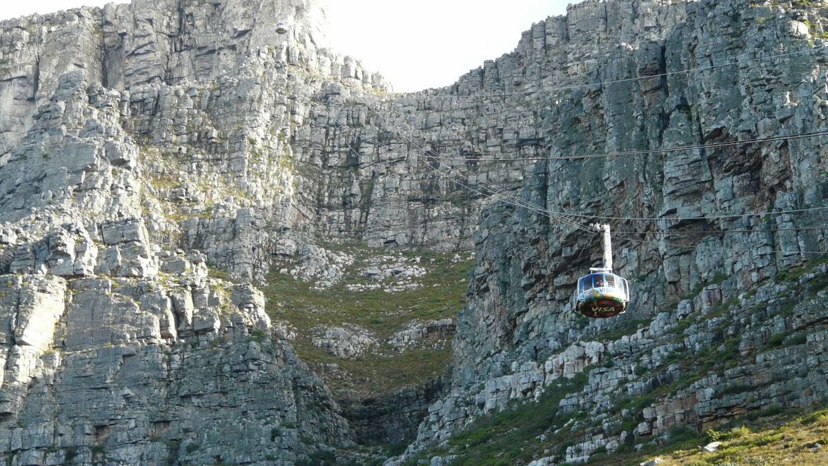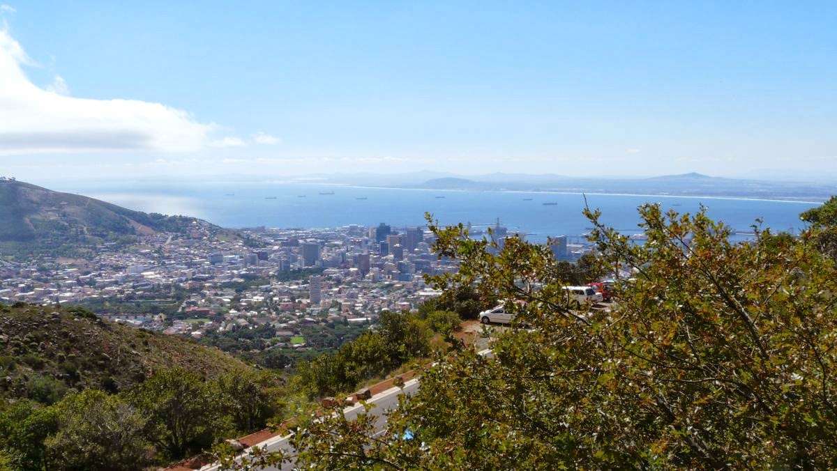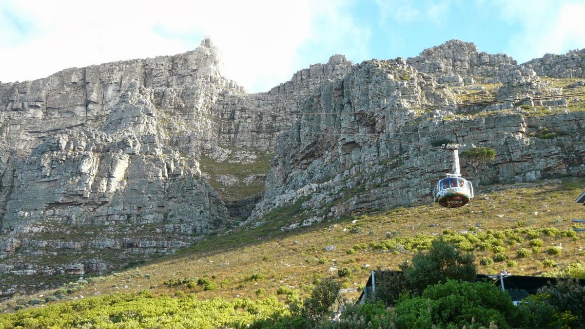Runter geht es jetzt mit der Drahtseilbahn. Deren Kabine dreht sich während der Fahrt ein Mal um 360 Grand. So gelingen uns noch mal wieder schöne Fotos vom Blick auf Kapstadt, soweit uns die etwa 80% Japaner in der Kabine dazu die Gelegenheit gegeben haben.