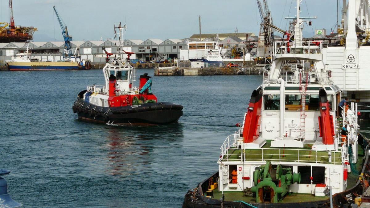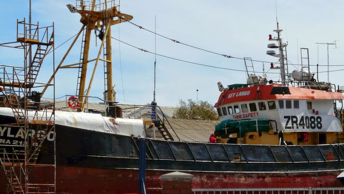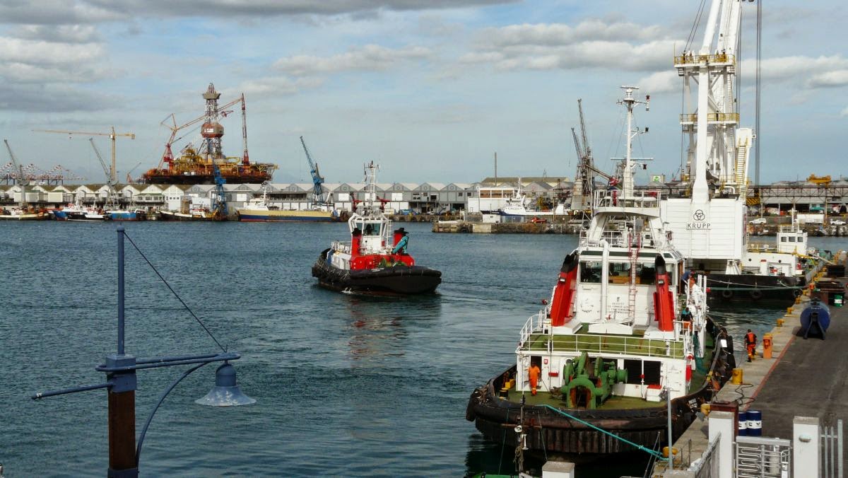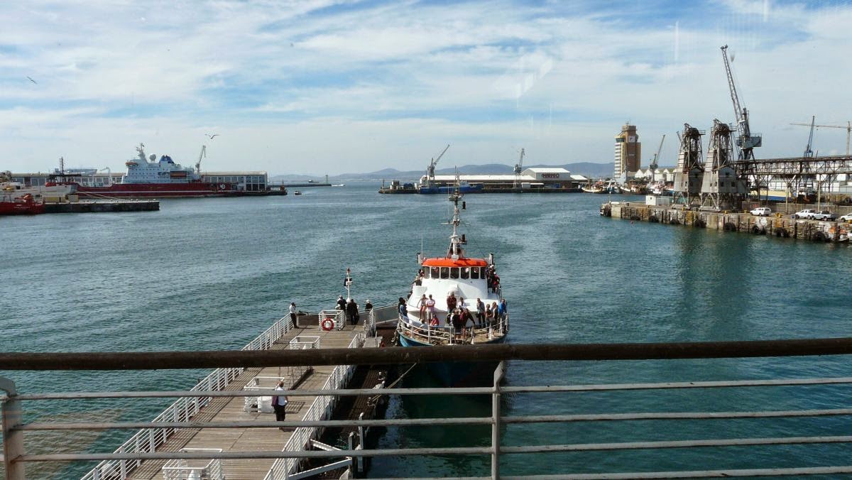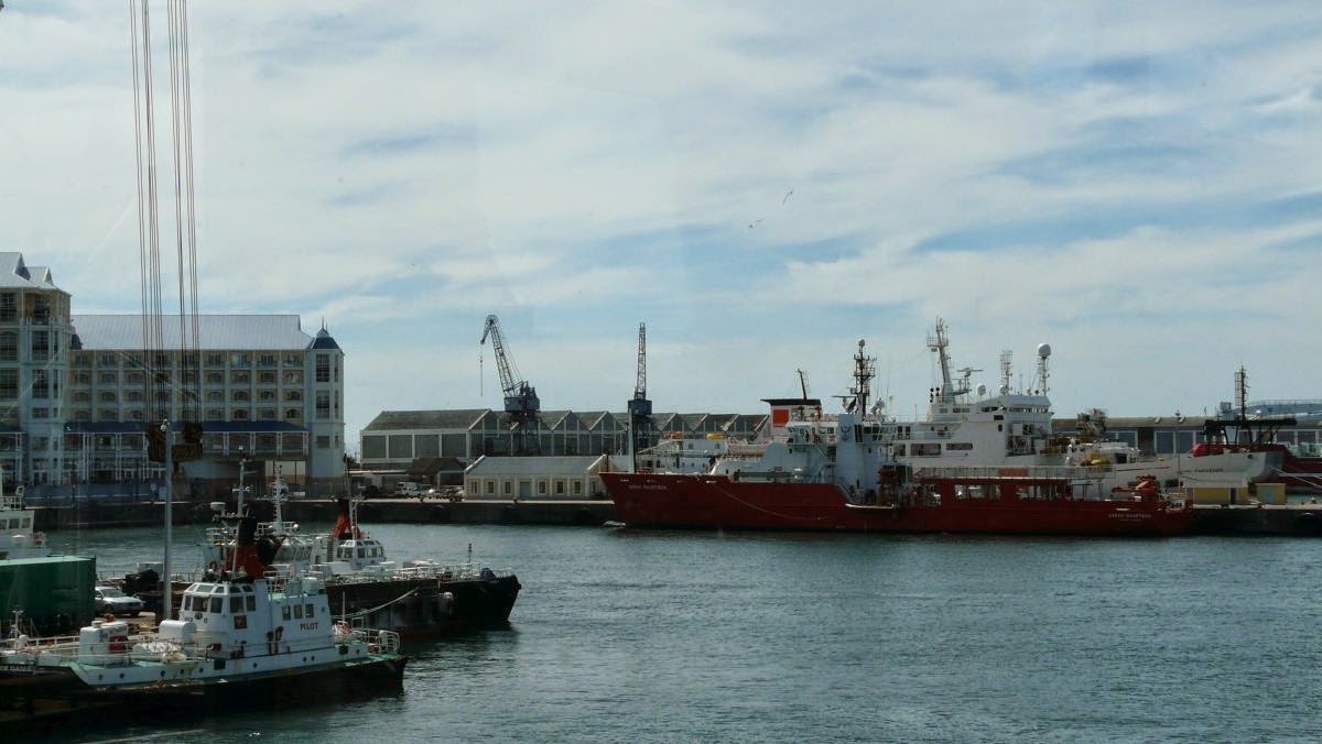 Nun kommen wir zum Hafen an der Table Bay. Er ist Basis für Kreuzfahrtschiffe, Fischereihafen und Umschlagplatz für Güter aller Art. Für das wichtigste Exportgut des Landes, Obst, wurde hier eines der größten Kühlhäuser der Welt errichtet.