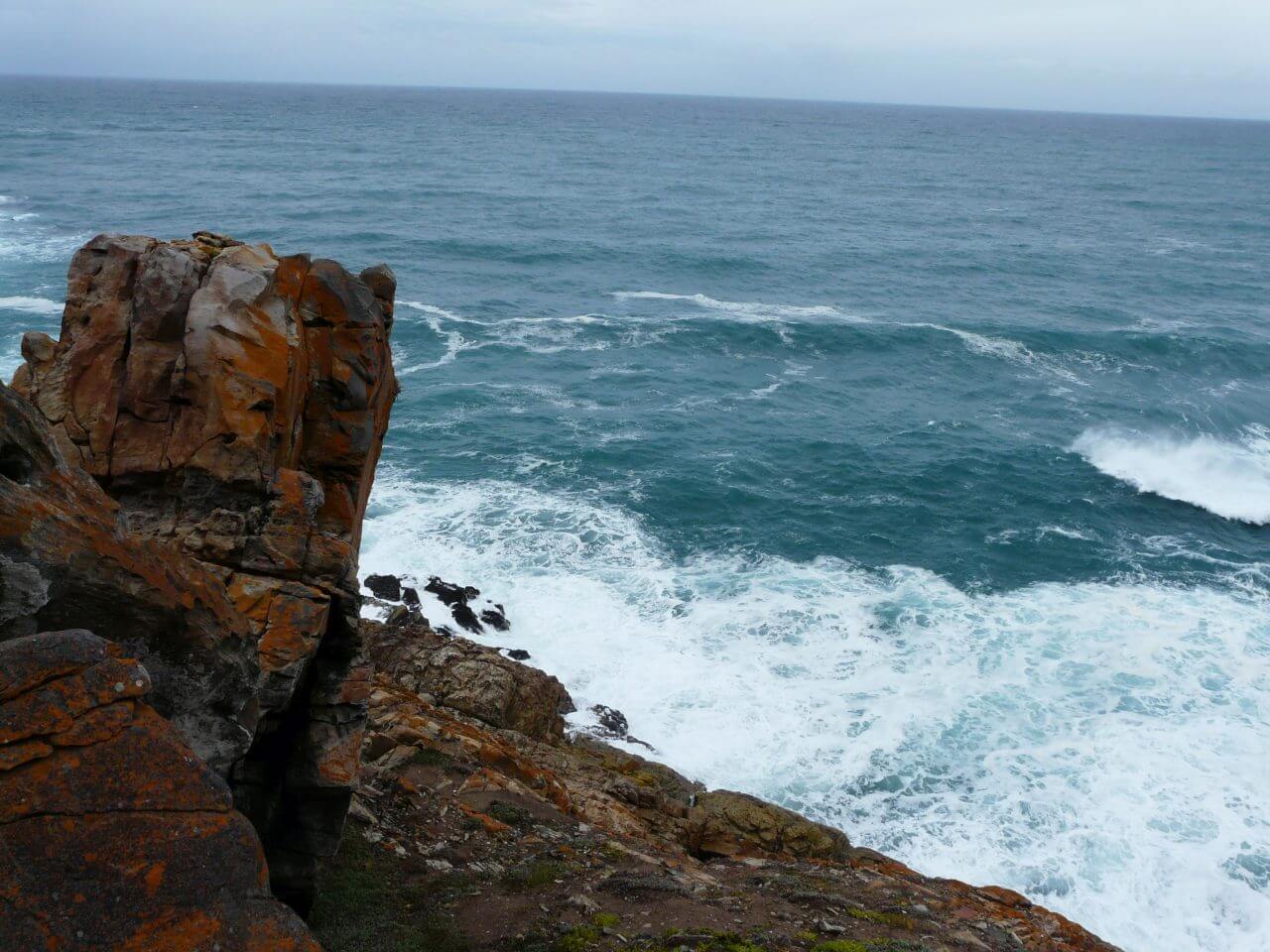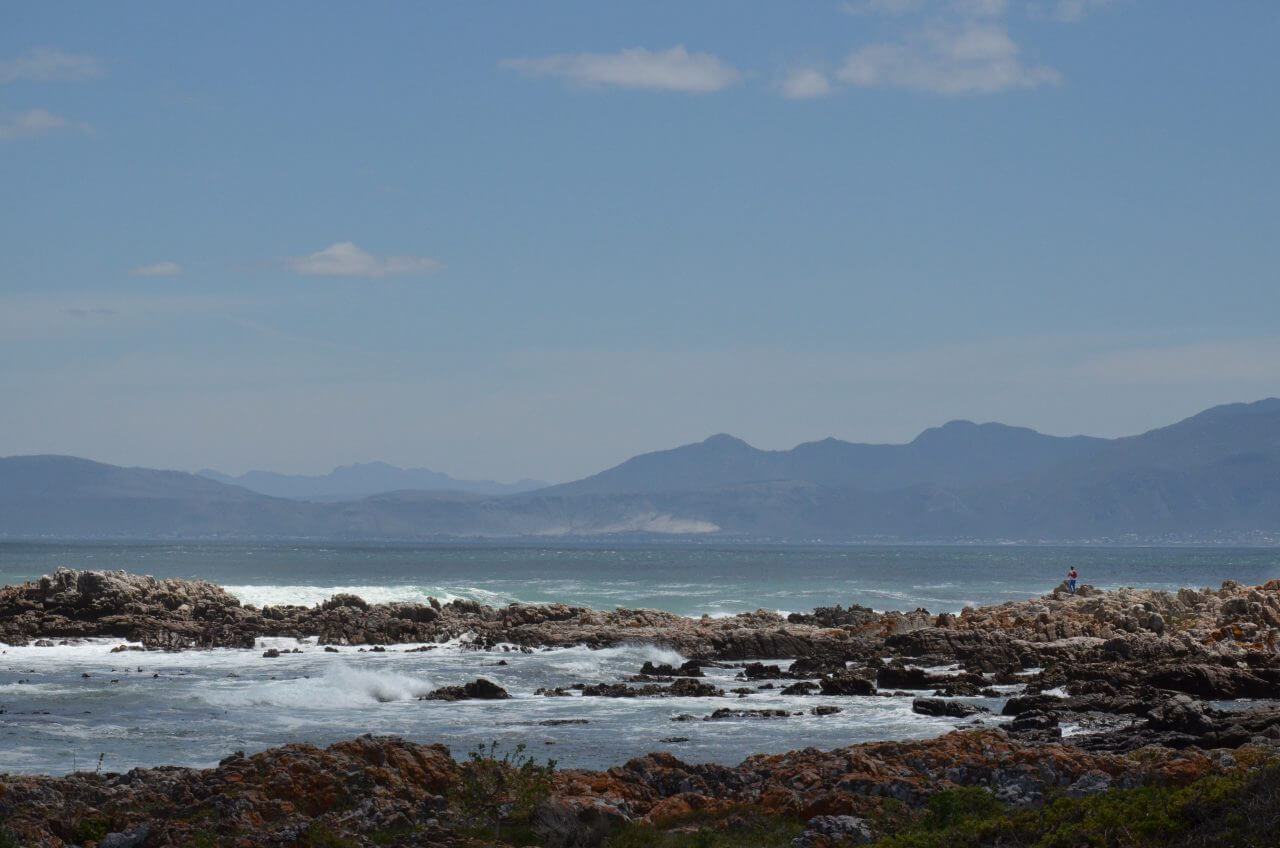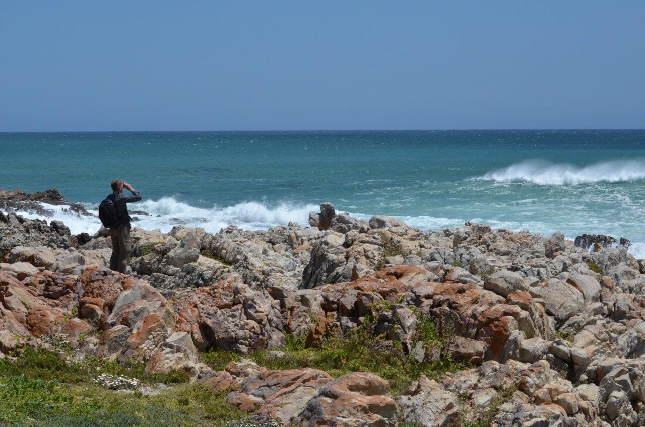 Weiter geht’s dann entlang der Küste Richtung De Kelders, ein Ort, der nur aus einigen Ferienhäusern besteht, aber eine unschlagbare Küstenlandschaft zu bieten hat und in der Walsaison zu den begehrtesten Plätzen der Welt zählt, um diese riesigen Meeressäuger wunderbar beobachten können. Und so schnüren wir wieder unsere Wanderschuhe und laufen entlang der Klippen über Fels und Stein, schauen minutenlang raus aus offene Meer und entdecken tatsächlich wieder Wale am Riff.