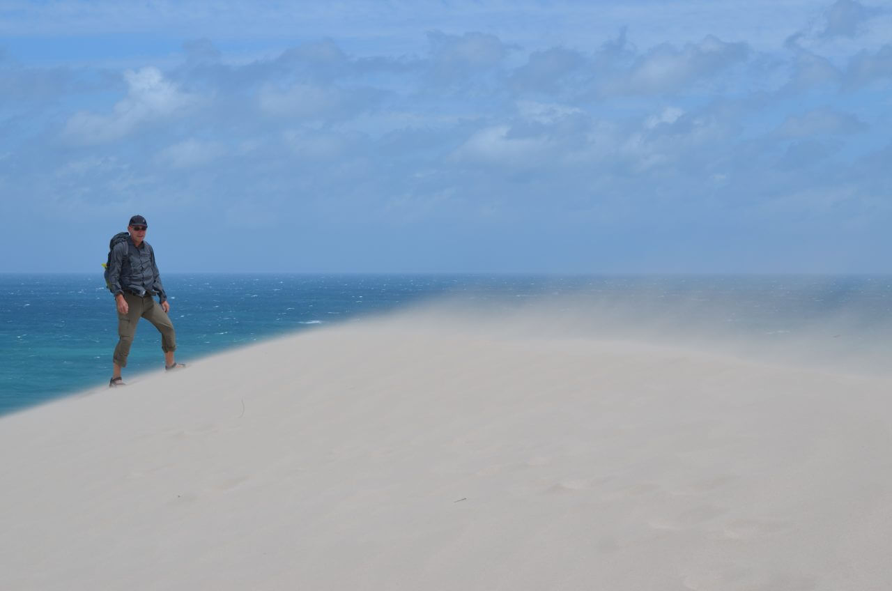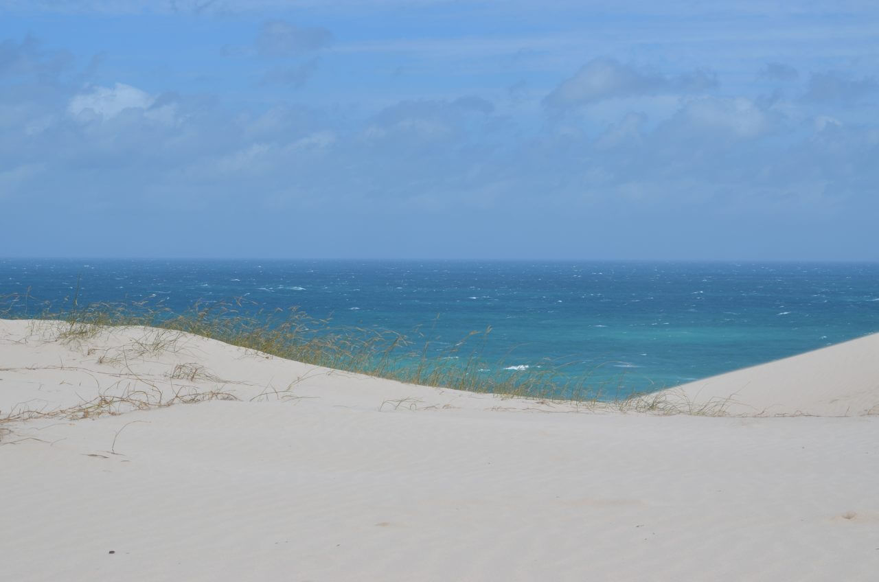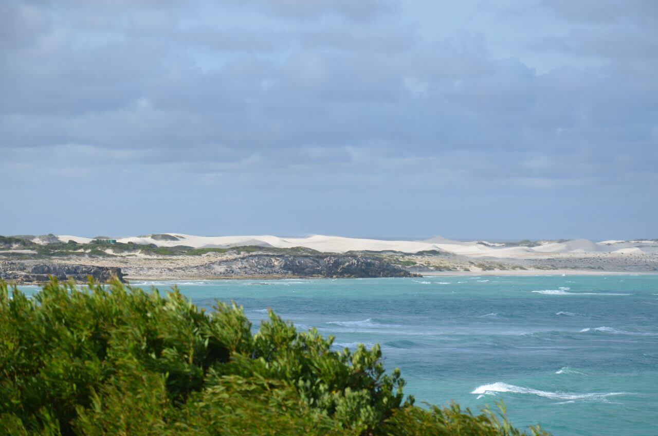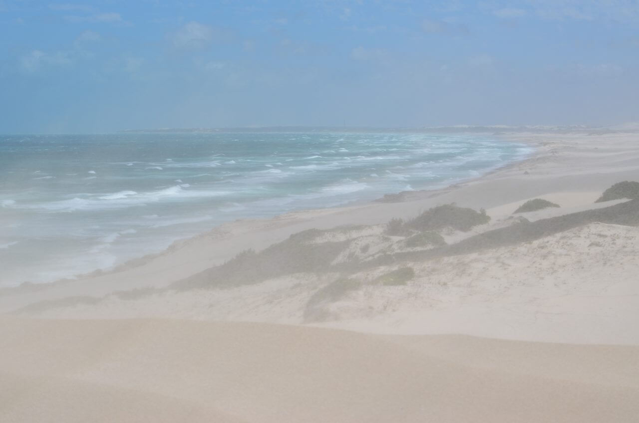Dann fahren wir weiter an den Strand zu den weißen Dünen. Mühsam kämpfen wir uns einen Weg durch den weißen Sand, der Wind hat leider kein bisschen nachgelassen und so sind wir nach einer kurzen Wanderung völlig gepudert…..Die Landschaft ist wunderschön, wir können uns gar nicht satt sehen, allerdings zerrt der sturmartige Wind ganz schön und macht es sehr anstrengend. So haben wir heute an diesem besten Hotspot zur Walbeobachtung auch kein Glück. Bei diesem Wellengang, sind selbst diese großen Tiere nicht zu erkennen.