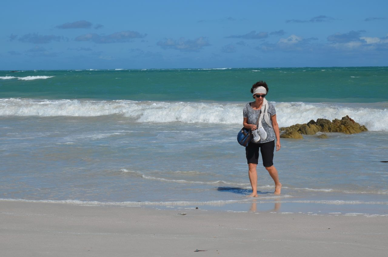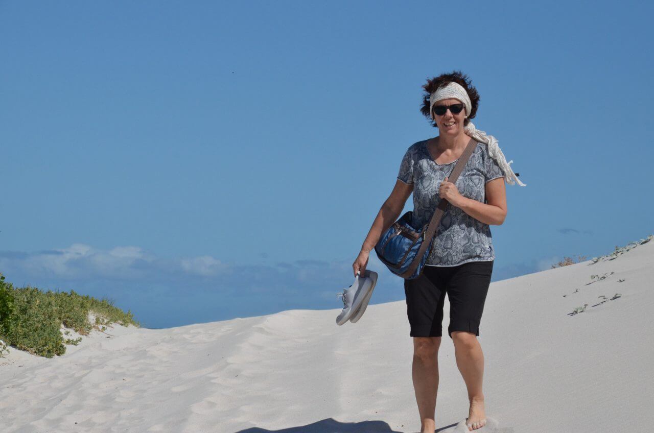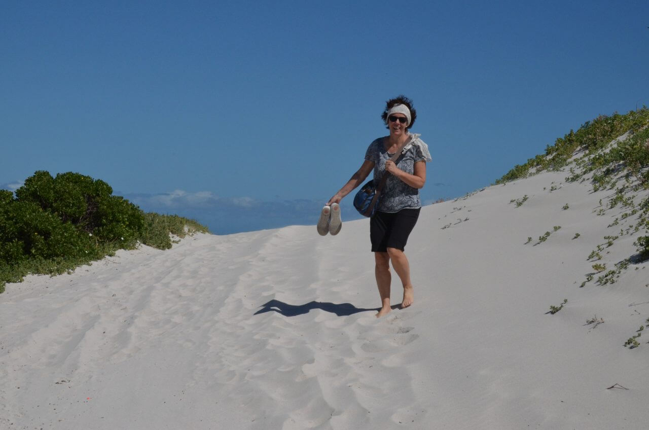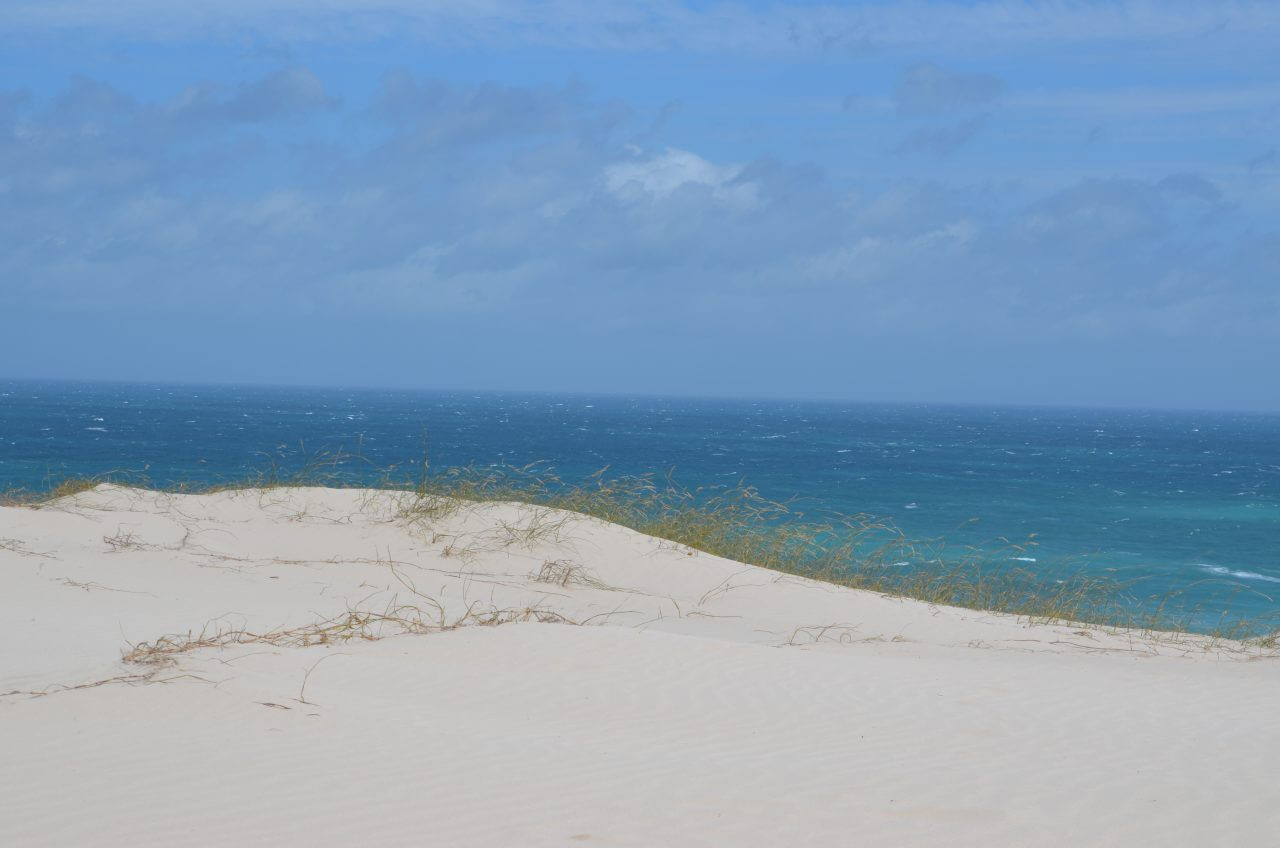 Dann fahren wir weiter an den Strand zu den weißen Dünen. Mühsam kämpfen wir uns einen Weg durch den weißen Sand, der Wind hat leider kein bisschen nachgelassen und so sind wir nach einer kurzen Wanderung völlig gepudert…..Die Landschaft ist wunderschön, wir können uns gar nicht satt sehen, allerdings zerrt der sturmartige Wind ganz schön und macht es sehr anstrengend. So haben wir heute an diesem besten Hotspot zur Walbeobachtung auch kein Glück. Bei diesem Wellengang, sind selbst diese großen Tiere nicht zu erkennen.