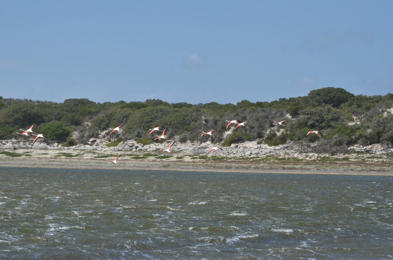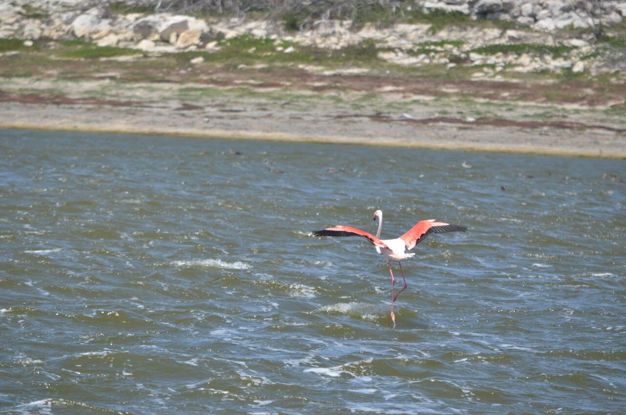 Als erstes machen wir an einem der Pools Halt und beobachten eine ganze Kolonie Flamingos, die sich jedoch von uns gestört fühlen und immer wieder auffliegen, um sich an anderer Stelle niederzulassen.