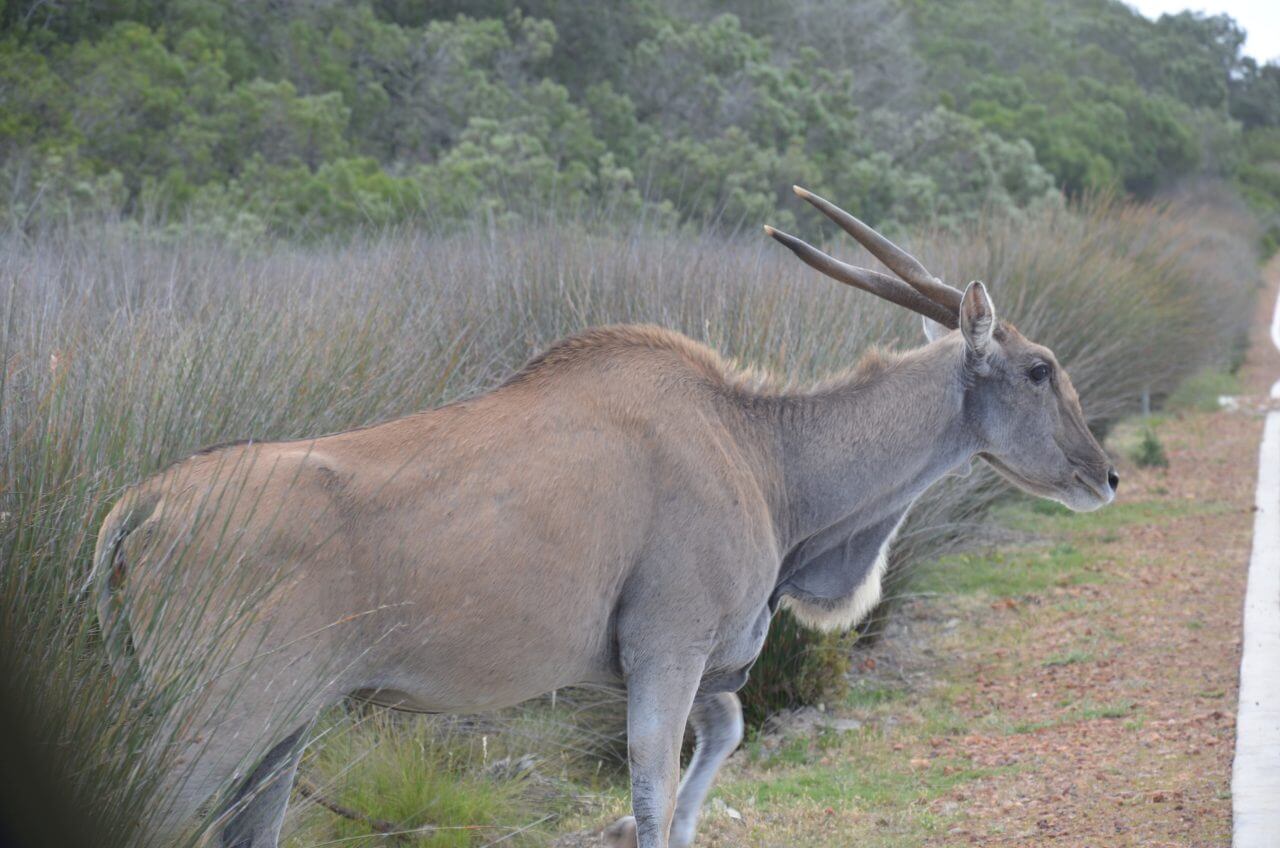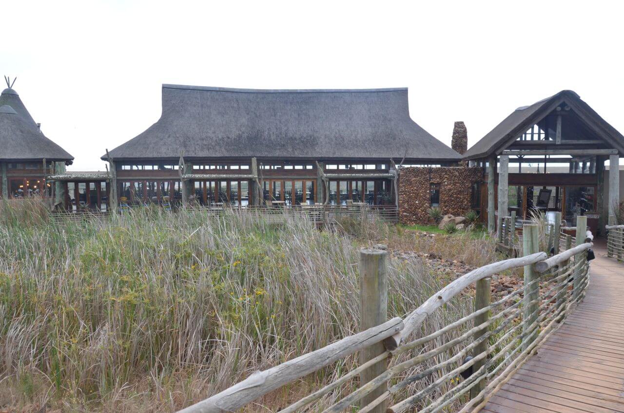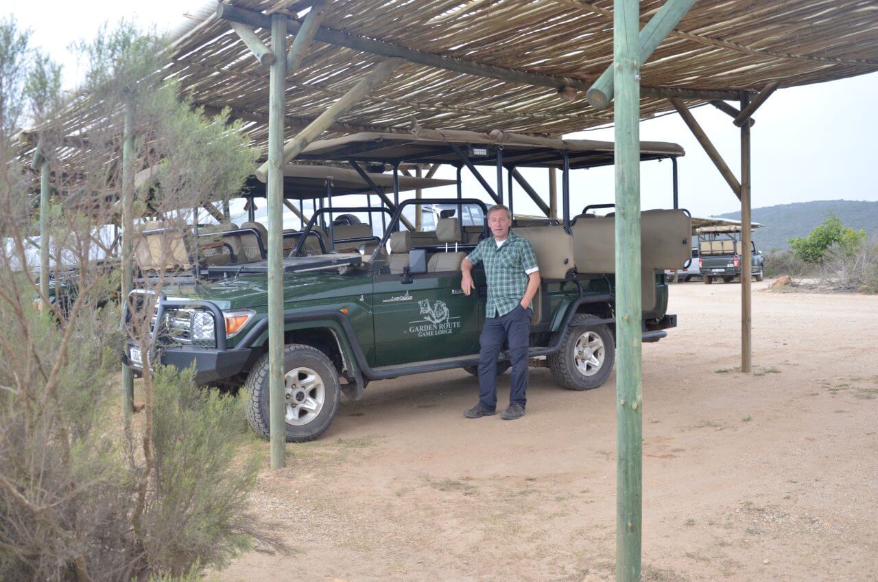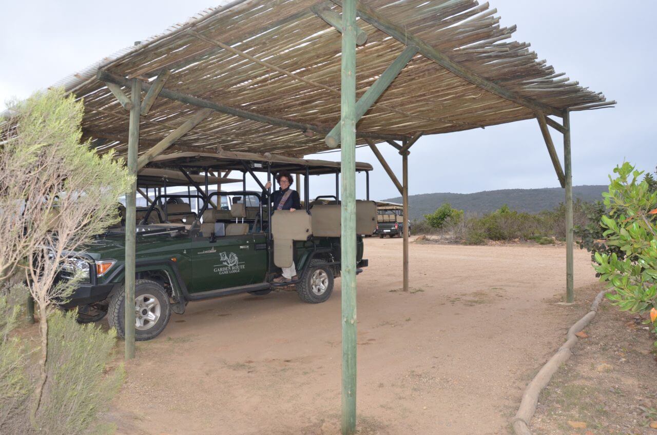 Heute morgen heißt es Abschied nehmen von diesem abgelegenen, aber wunderschönen Fleckchen Erde. Die nächste Stunde geht es wieder über Stock und Stein bis dass wir eine richtige Straße erreichen. Auf der N2 geht es dann weiter bis kurz nach Albertinia, dort befindet sich die Garden Route Game Lodge. Wie wir heraus gefunden haben, können wir hier auch als Day Visitors, also ohne dort für eine Übernachtung gebucht zu haben, an einer Safari im offenen Fahrzeug teilnehmen. Also fahren wir direkt aufs Gelände, lassen uns registrieren und buchen an der Rezeption eine zweistündige Safari in dieser privaten Game Lodge. Die eine Stunde noch, bis dass es losgeht, überbrücken wir mit einem kleinen Snack im Restaurant und mit Sightseeing im Souveniershop. Dann erwartet uns die Rangerin und los geht es im offenen Safariwagen mit sechs anderen Gästen.
