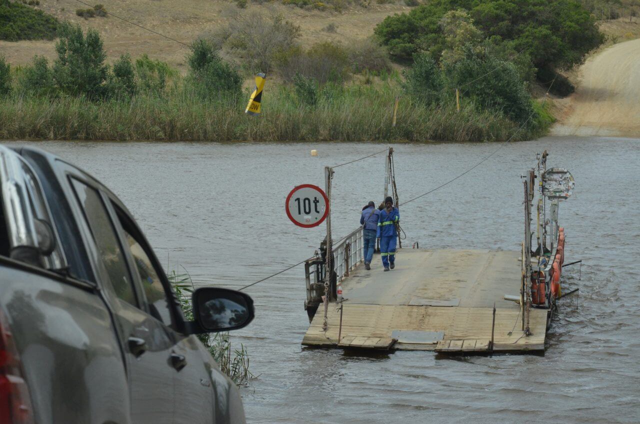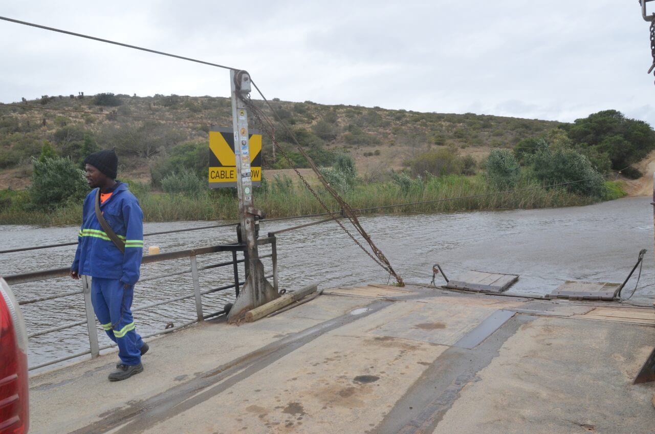 Das Anwesen ist herrlich, die Kanus liegen für die Gäste bereit, doch leider wagen wir uns auf Grund des stürmischen Windes nicht hinauf auf den Fluss, wovon uns unser Gastgeber Daniel auch dringend abrät. Ungefähr 30 km weiter mündet der Breede River bei Witsand in den Indischen Ozean und so nehmen wir die Fähre über den Fluss, die sich als handbetriebenes Floß entpuppt. Drei starke Männer betätigen das dicke Seil mit reiner Muskelkraft, um maximal zwei Autos über das 120 m breite Wasser zu befördern. Auch ein spannendes Unterfangen.