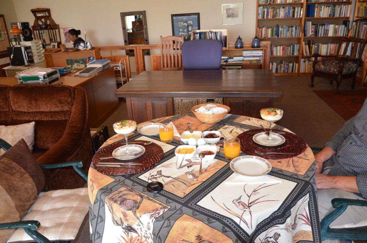 Unsere Gastgeberin, Marietjie Coetzeen, ist die Schwester eines berühmten afrikanischen Schriftstellers, der 2002 in der Nähe vom Krüger Nationalpark ermordet wurde. Viele Zeitungsartikel, Bücher und Fotos in ihrer Bibliothek erzählen uns davon. Marietjie schreibt und verlegt auch selber, kennt Deutschland von der Frankfurter Buchmesse und hat sich mit diesem Guesthouse einen Traum erfüllt, um im Alter zur Ruhe zu kommen. Am Morgen serviert sie uns ein Frühstück und wünscht uns alles Gute für unsere Weiterfahrt. Es ist wieder einmal wahnsinnig interessant und spannend, was uns bis vor kurzem noch völlig fremde Menschen aus ihrem Lebenn zu erzählen haben.