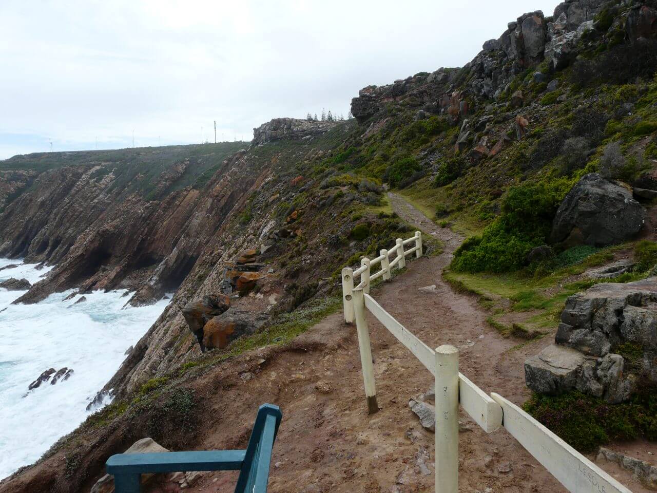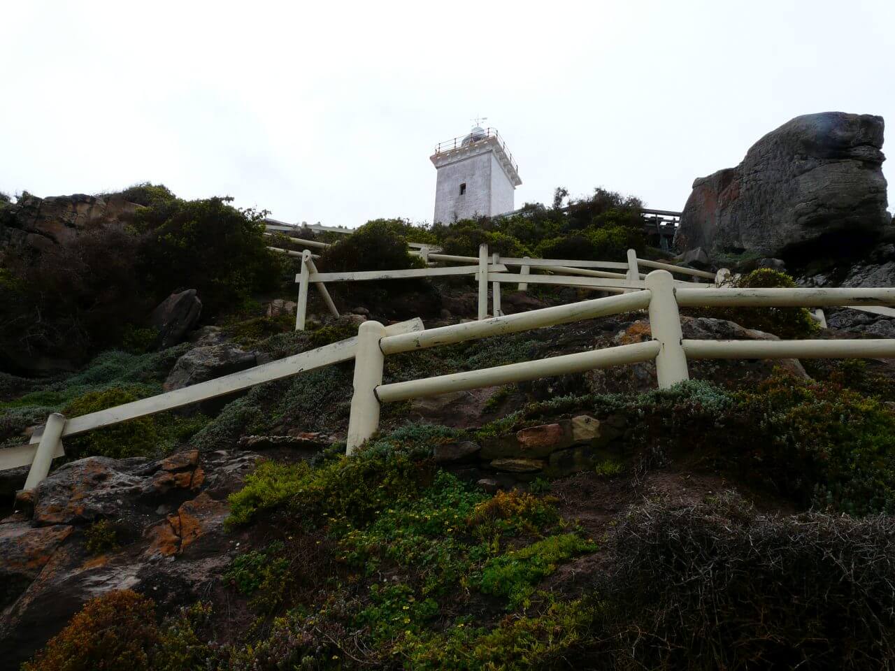 Wir richten uns gemütlich in unserer neuen Unterkunft ein und trinken einen Kaffee. Rika erzählt uns, dass man von hier oben eigentlich fantastische Sicht auf Wale hat, aber leider nicht bei diesem schlechten Wetter. Außerdem neigt sich die Walsaison ohnehin bald dem Ende zu, aber wir hatten trotzdem auf etwas mehr gehofft. Die nächste Regenpause nutzen wir dann auch, um uns nochmals auf den Weg ins Zentrum zu machen. Hier am Lighthouse startet der Saint Blazie Hiking Trail, ein 16 km langer Wanderwege oberhalb der Küste. Wirklich spektakulär, dieser Weg. Auch das Wetter wird etwas freundlicher.