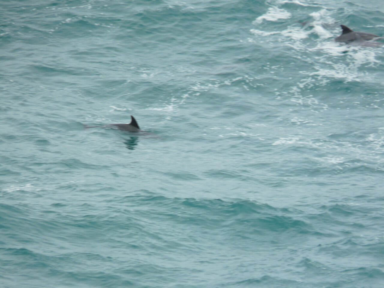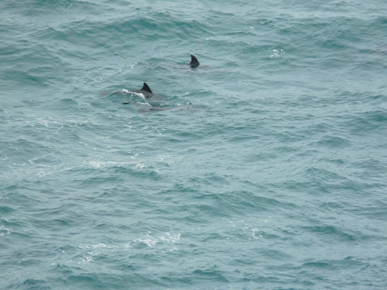 Sogar eine riesengroße Delfinschule von geschätzt weit über 50 Tieren entdecken wir. Sie schwimmen durch die Bucht Richtung Süden und tauchen natürlich nur dann aus dem Wasser, wenn wir gerade nicht den Finger am Auslöser haben.