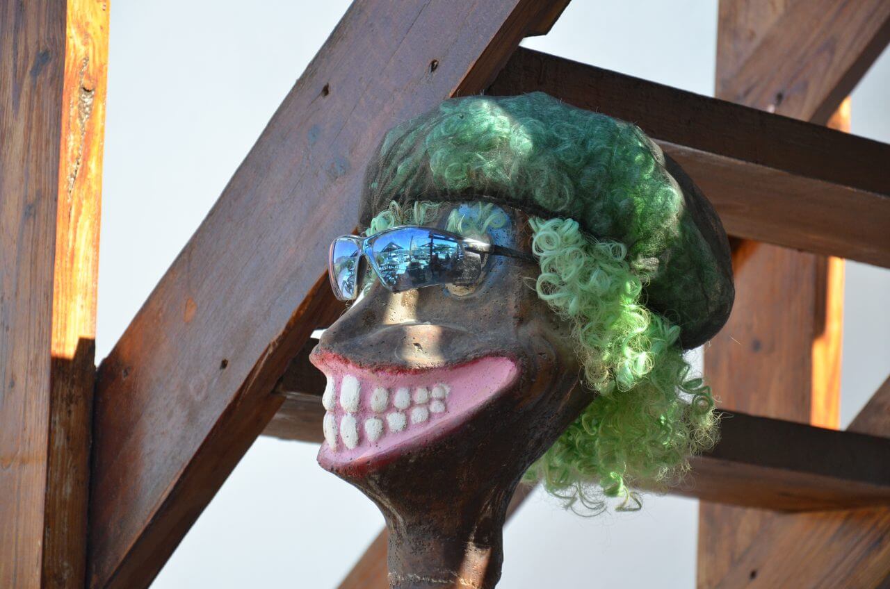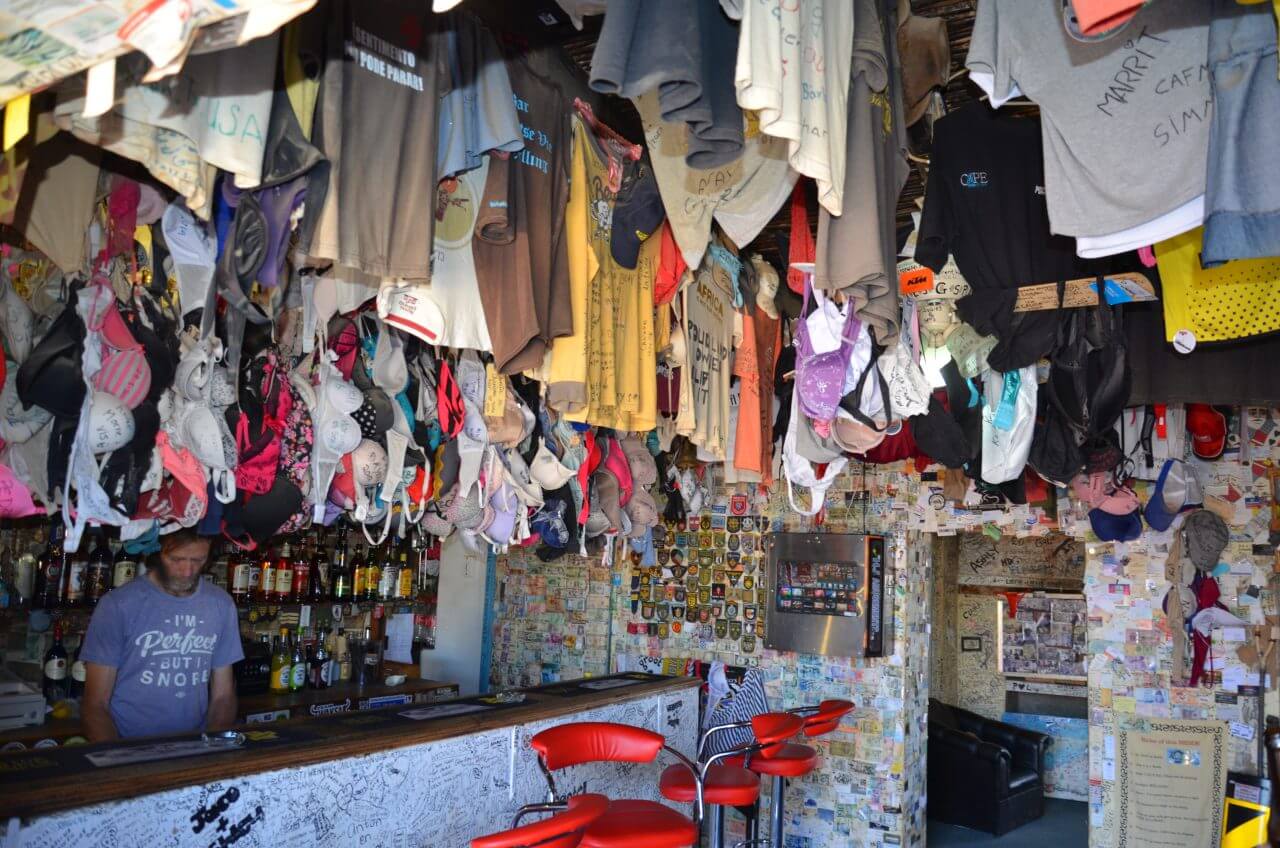 Dann machen wir mitten im Nirgendwo Stop bei Ronnies Sex Shop. Hier gibt es nicht nur eine erfrischende Cola, sondern auch allerhand Kurioses zu sehen. Anstatt dass man, wie der Name vermuten lässt, hier verschiedene Sexartikel oder Wäschestücke erstehen kann, baumelt delikate Wäsche von Gästen aus aller Herren Länder von der Decke, BHS in allen Farben und Körbchengrößen…….wessen Trophäen das auch immer sein mögen 😂