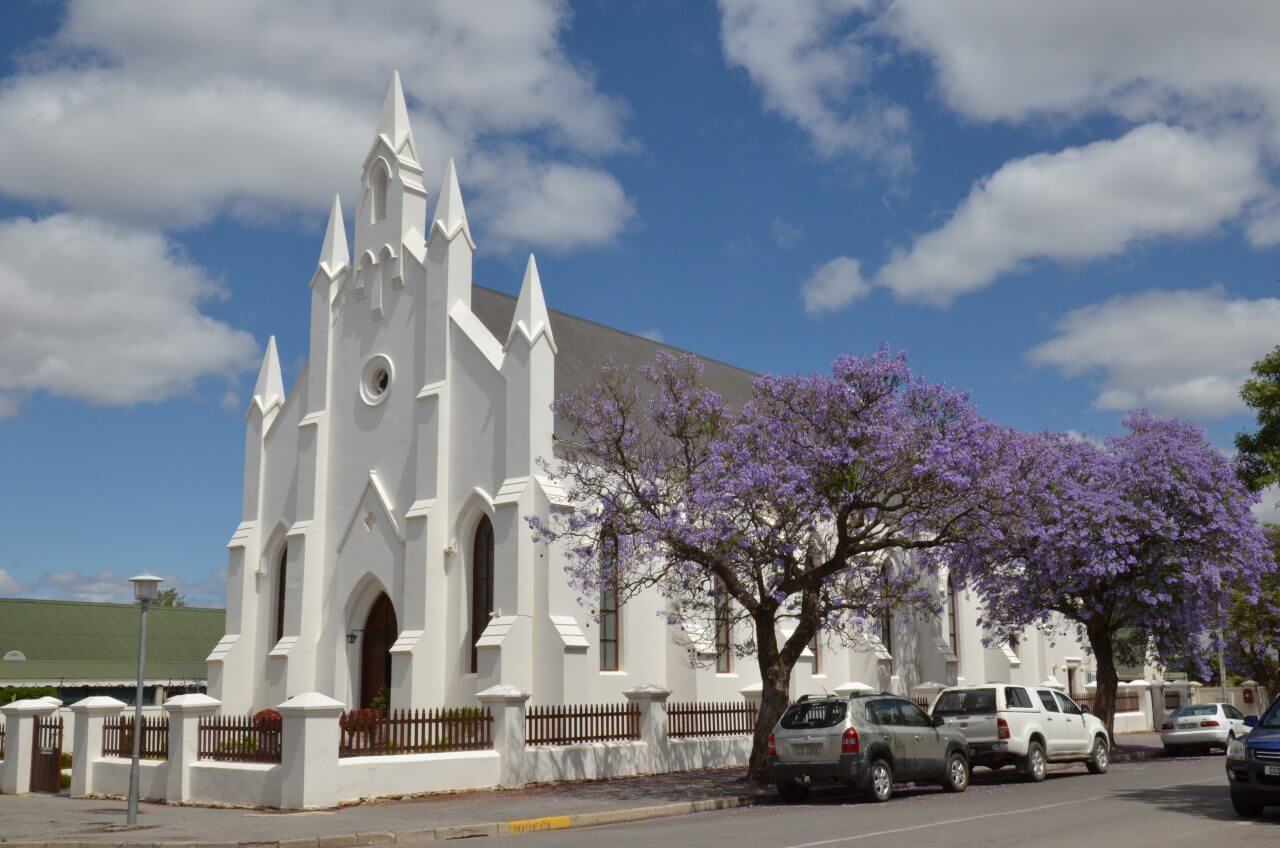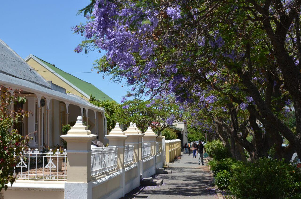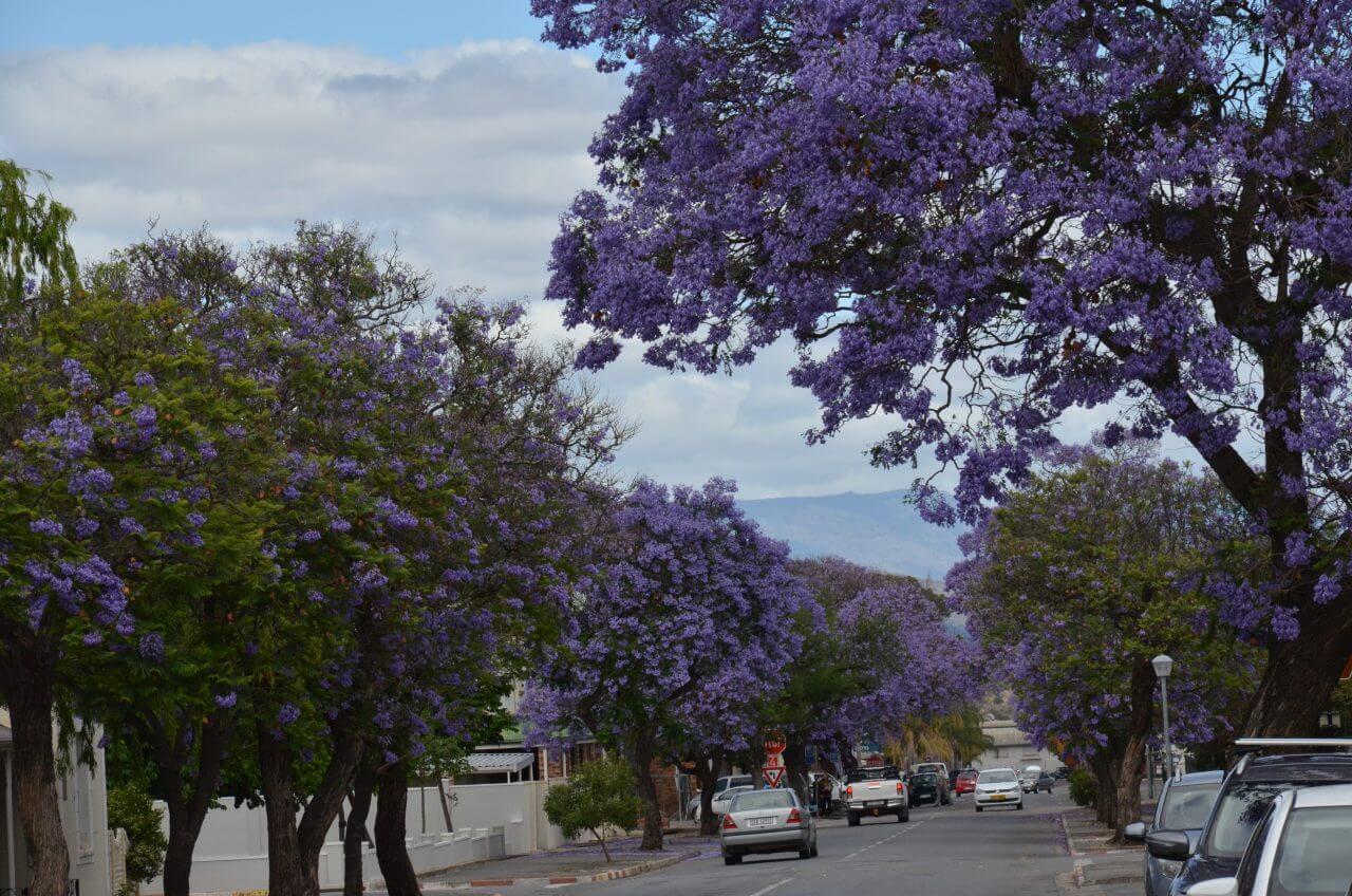 In Robertson, einer der berühmten Weinstädte Südafrikas, machen wir einen ersten Stop. Zu den besten hiesigen Weinen zählen unter anderem Chenin Blanc, die hier oft preiswerter als in der Kapstadtregion sein sollen. Hier, wie in vielen anderen Orten auch, blühen momentan die violett-hellblauen Jacarandabäume und säumen viele Straßen. Zusammen mit den weißen Häusern bildet das ein einmaliges Ensemble.
