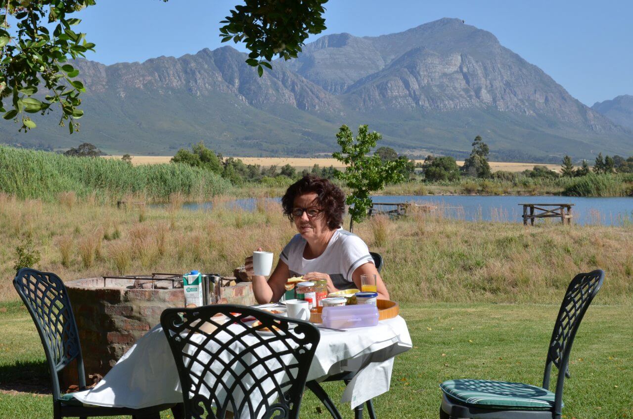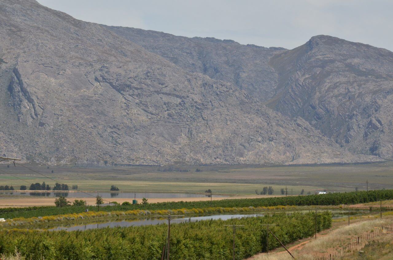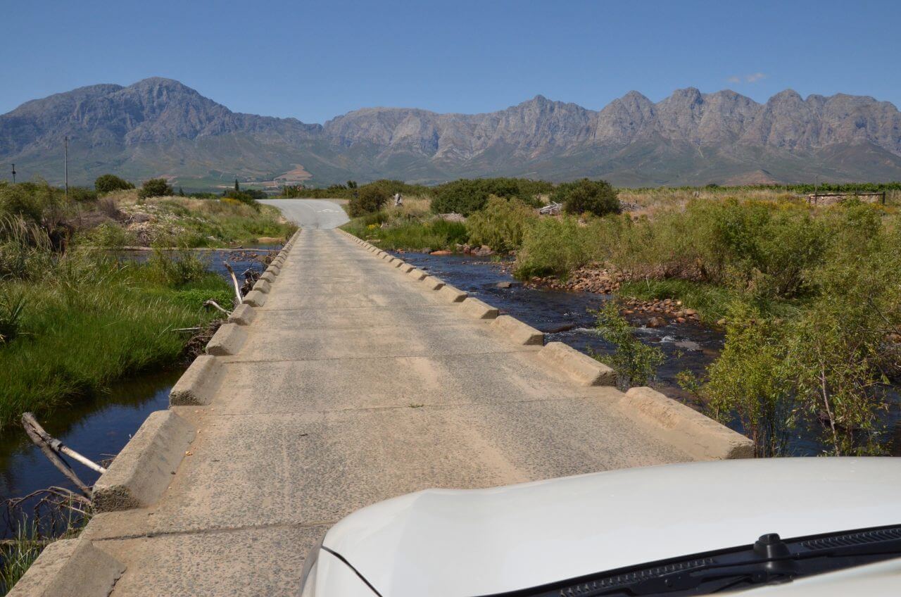 Und so fahren wir weiter über Worcester und Slanghoek, immer entlang des Breede Rivers auf der einen Seite und den hoch aufragenden Hawequas Mountains auf der anderen Seite. Dazwischen WIR und unzählige Weinfelder über viele Kilometer, so weit das Auge blicken kann. Zum Schluss müssen wir mal wieder den Breede River überqueren, aber diesmal, so warnen uns Schilder, ist das nur bei normalem Wasserstand möglich, bei Flut müssten wir umdrehen und ca 100 km Umweg fahren 🤔…..Da haben wir ja noch mal Glück gehabt.