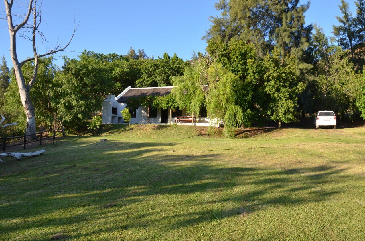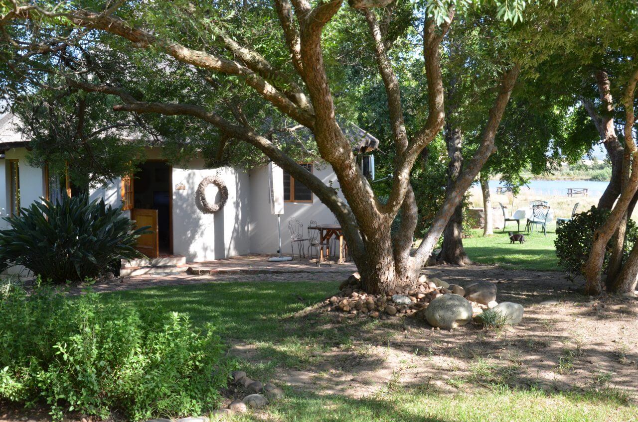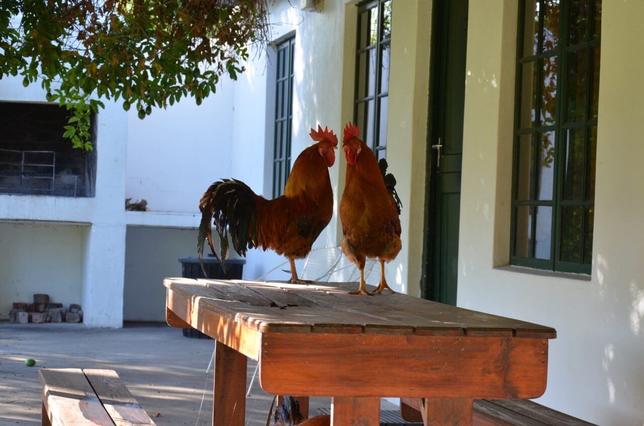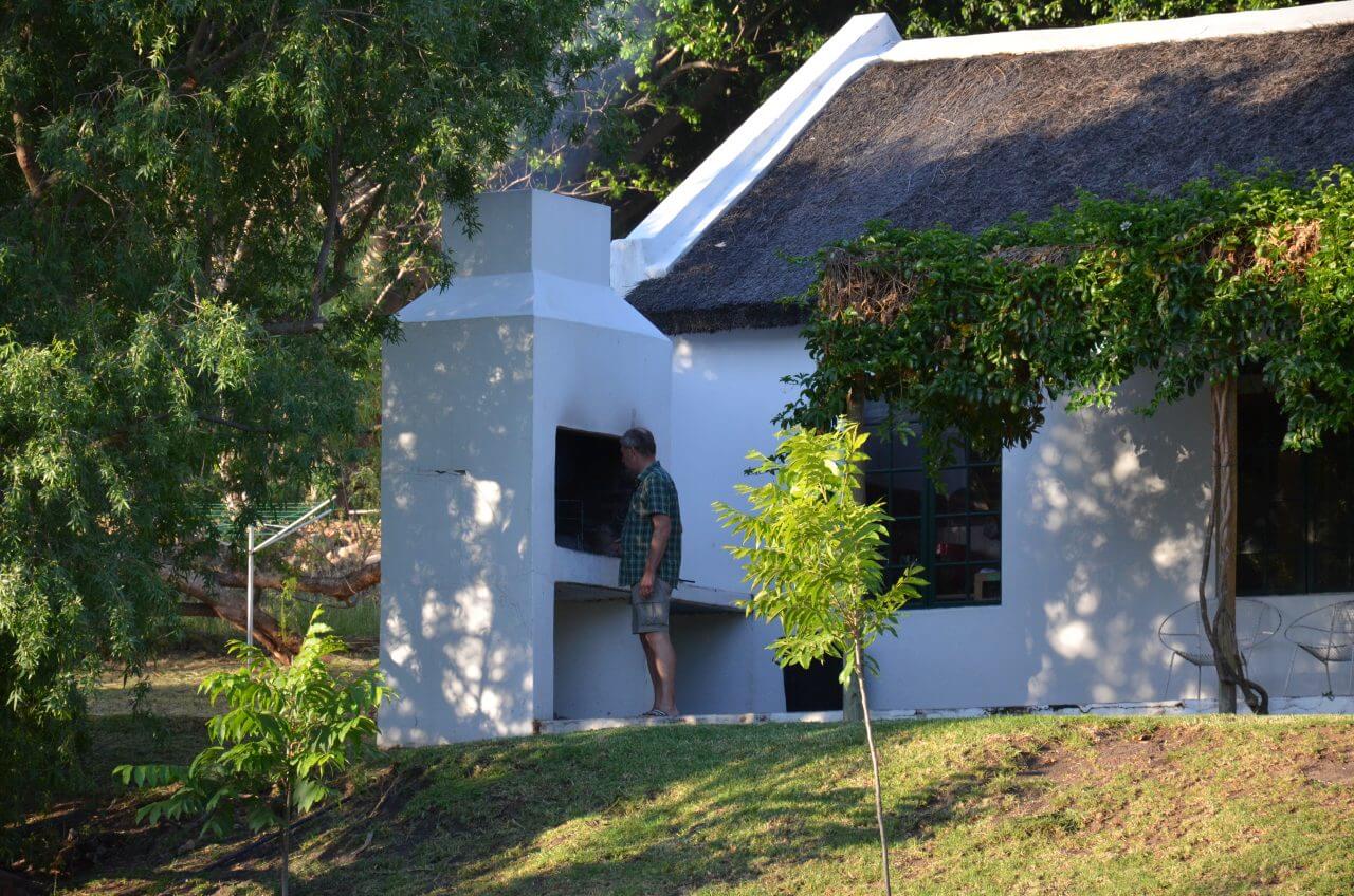 Dann hacken wir die Koordinaten für unsere Unterkunft, dem Boskloof Swemgat ein. MWir fahren wieder 10 km über eine Gravel Road ins Nirgendwo, sehen am Rand der Piste einige farbige Menschen laufen, wundern uns noch, wo die hier hin wollen und erkennen eine Minute später, dass wir am Ziel angekommen sind und diese Menschen zu unserer Gastgeberfamilie gehören. Wir bekommen von einer netten Farbigen im blauen Arbeiteranzug unseren Schlüssel fürs Cottage und fahren noch auf die andere Seite zum Flussufer. Oh, mein Gott, wie einsam!!! Als wir die Hähne auf unserem Gartentisch sehen, müssen wir laut lachen. Außerdem zählen wir auch noch Esel und Zebra zu unseren unmittelbaren Nachbarn heute Abend.