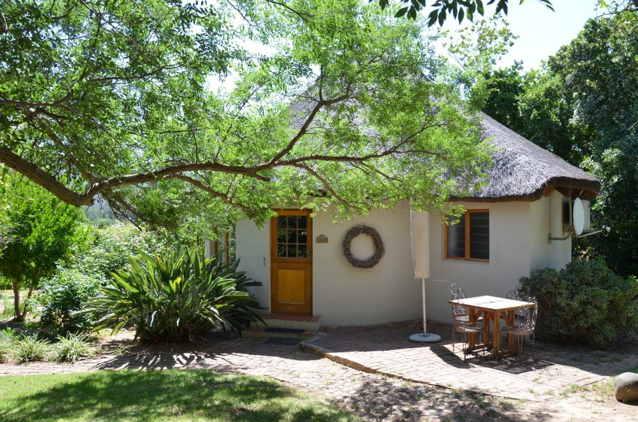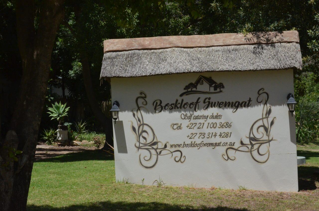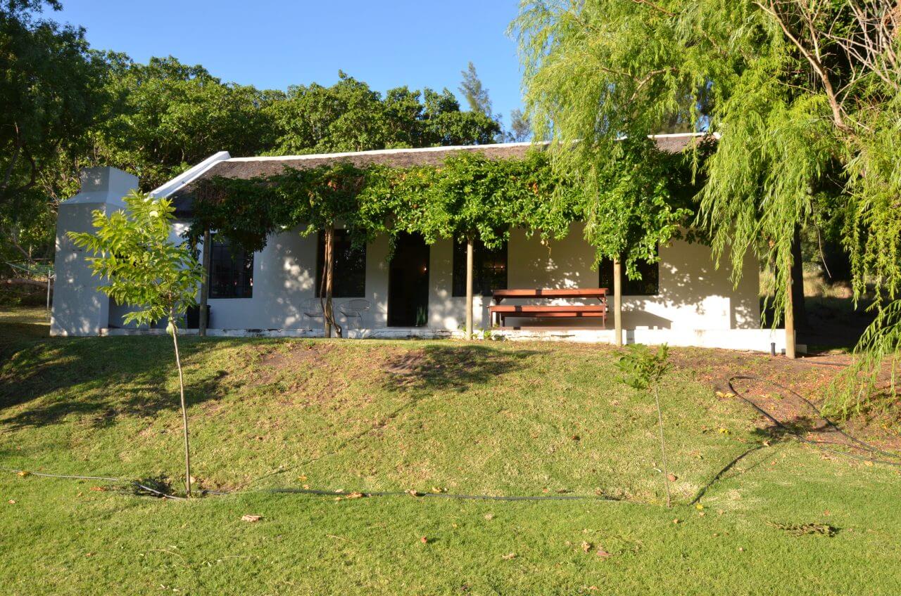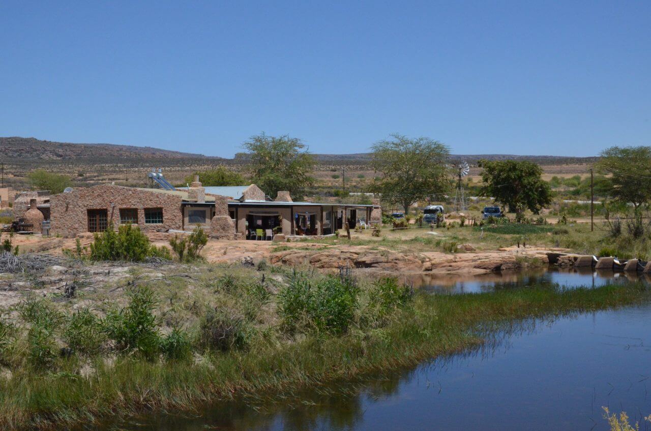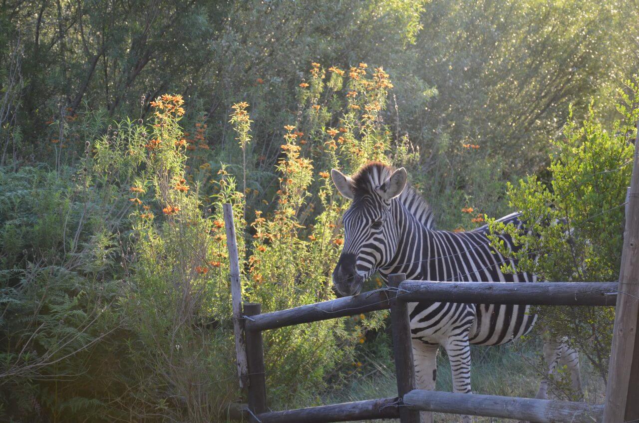 Dann hacken wir die Koordinaten für unsere Unterkunft, dem Boskloof Swemgat ein. MWir fahren wieder 10 km über eine Gravel Road ins Nirgendwo, sehen am Rand der Piste einige farbige Menschen laufen, wundern uns noch, wo die hier hin wollen und erkennen eine Minute später, dass wir am Ziel angekommen sind und diese Menschen zu unserer Gastgeberfamilie gehören. Wir bekommen von einer netten Farbigen im blauen Arbeiteranzug unseren Schlüssel fürs Cottage und fahren noch auf die andere Seite zum Flussufer. Oh, mein Gott, wie einsam!!! Als wir die Hähne auf unserem Gartentisch sehen, müssen wir laut lachen. Außerdem zählen wir auch noch Esel und Zebra zu unseren unmittelbaren Nachbarn heute Abend.