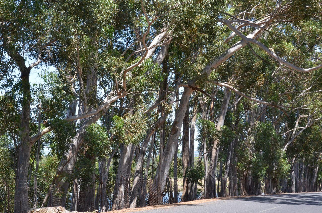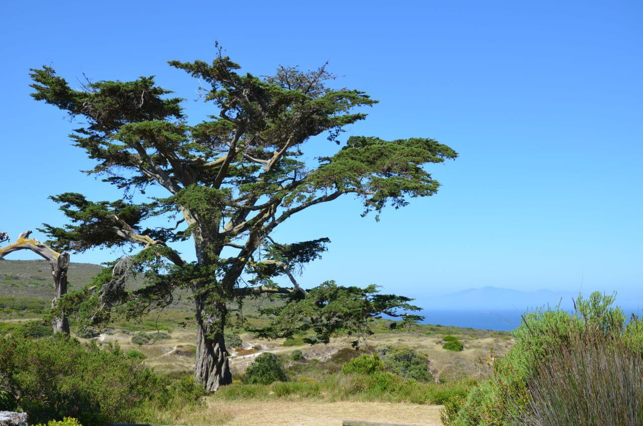 Auf dem Weg zum Ausgang des Parks sehen wir in der Ferne das weiße Denkmal, was zu Ehren von Vasco da Gama aufgestellt wurde. Was für eine eindrucksvolle Kulisse mit all den wunderschönen und windschiefen Bäumen hier oben.
