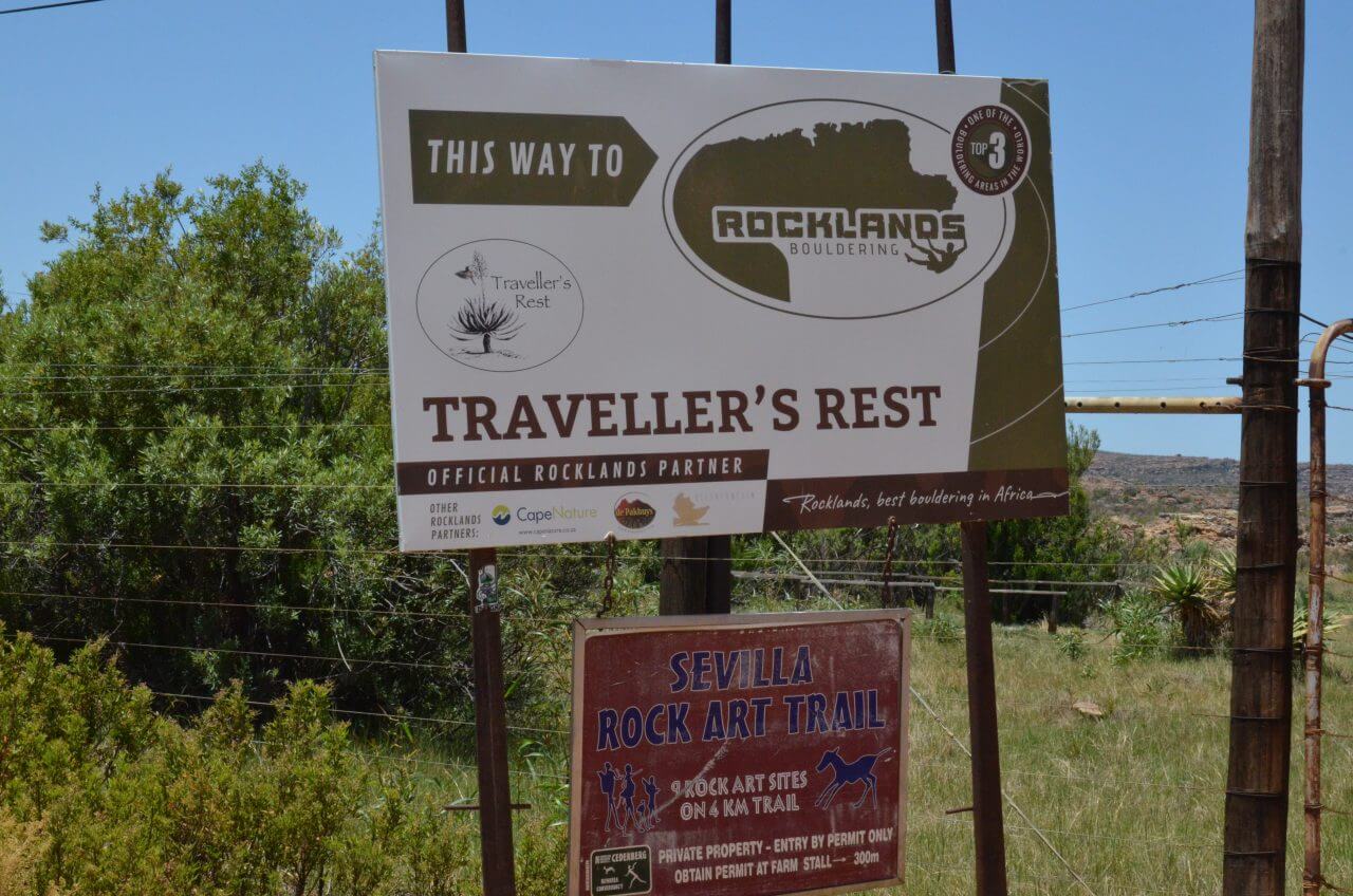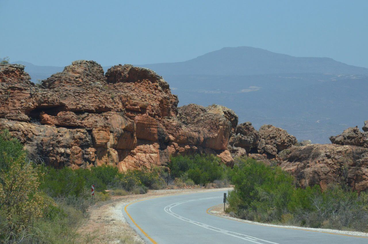 Am frühen Morgen sitzen wir tatsächlich schon um 7:20 Uhr im Auto und sind unterwegs zum “Sevilla Rock Art Trail”, der in ca 40 km Entfernung an einem Farmstall mit dem Namen Traveller’s Rest beginnt. Schon der Weg dorthin über den Pakhuis Pass führt durch eine wildromantische Gebirgslandschaft.