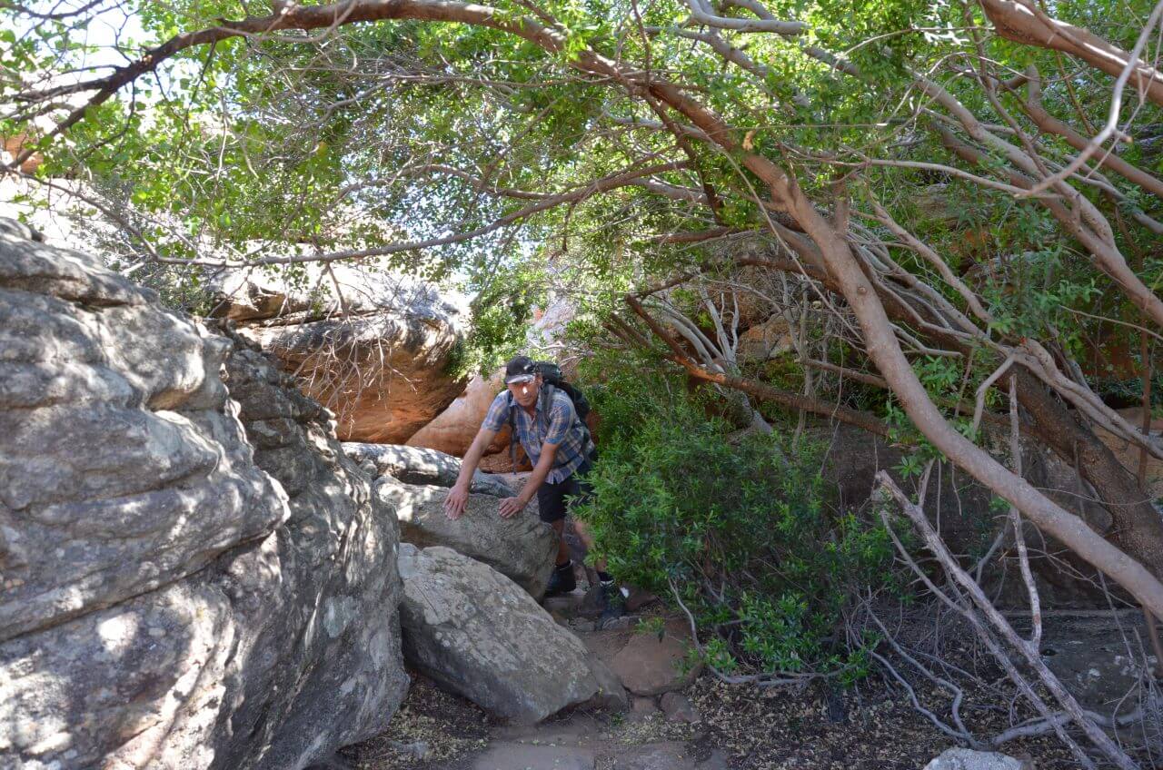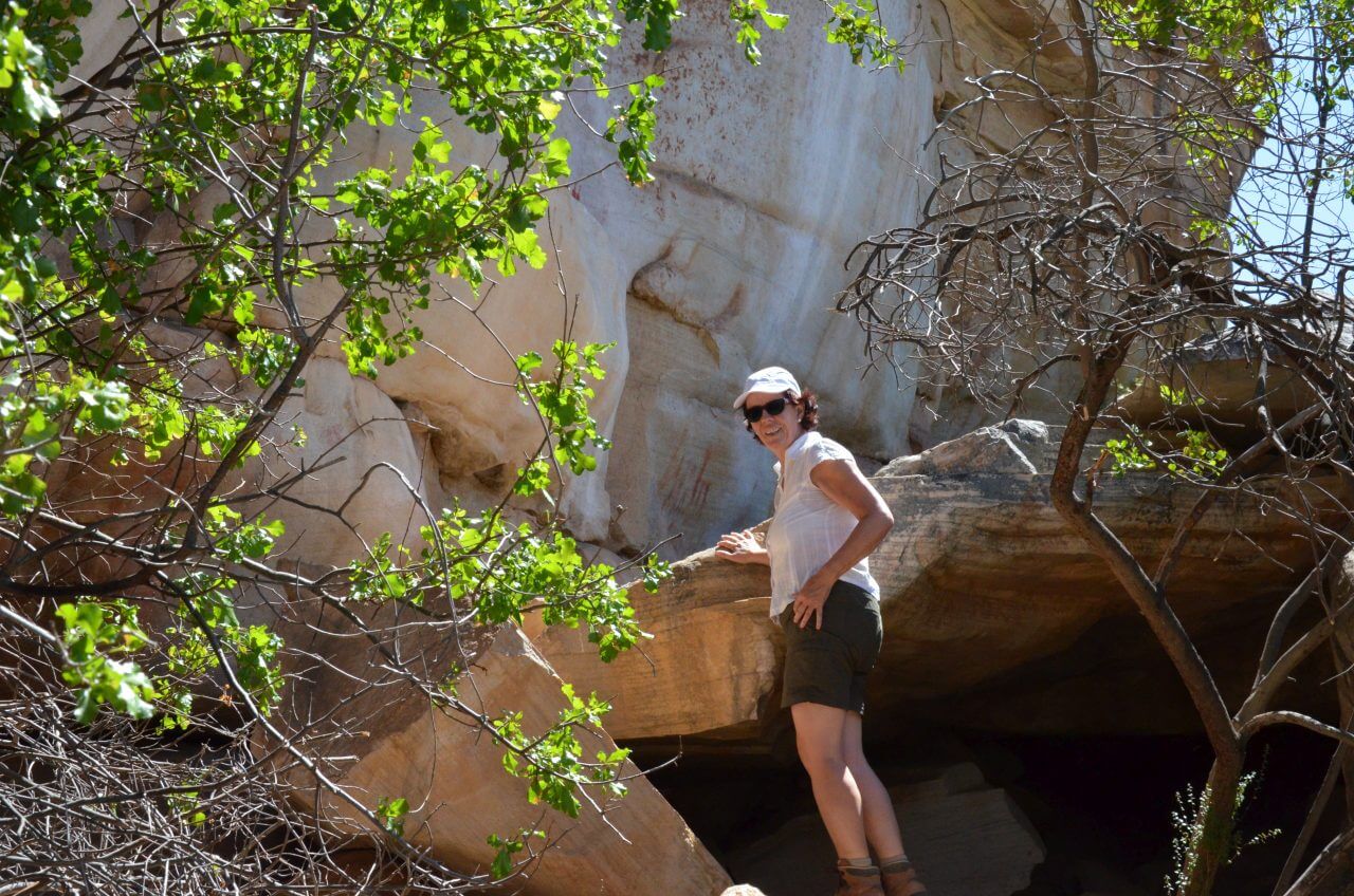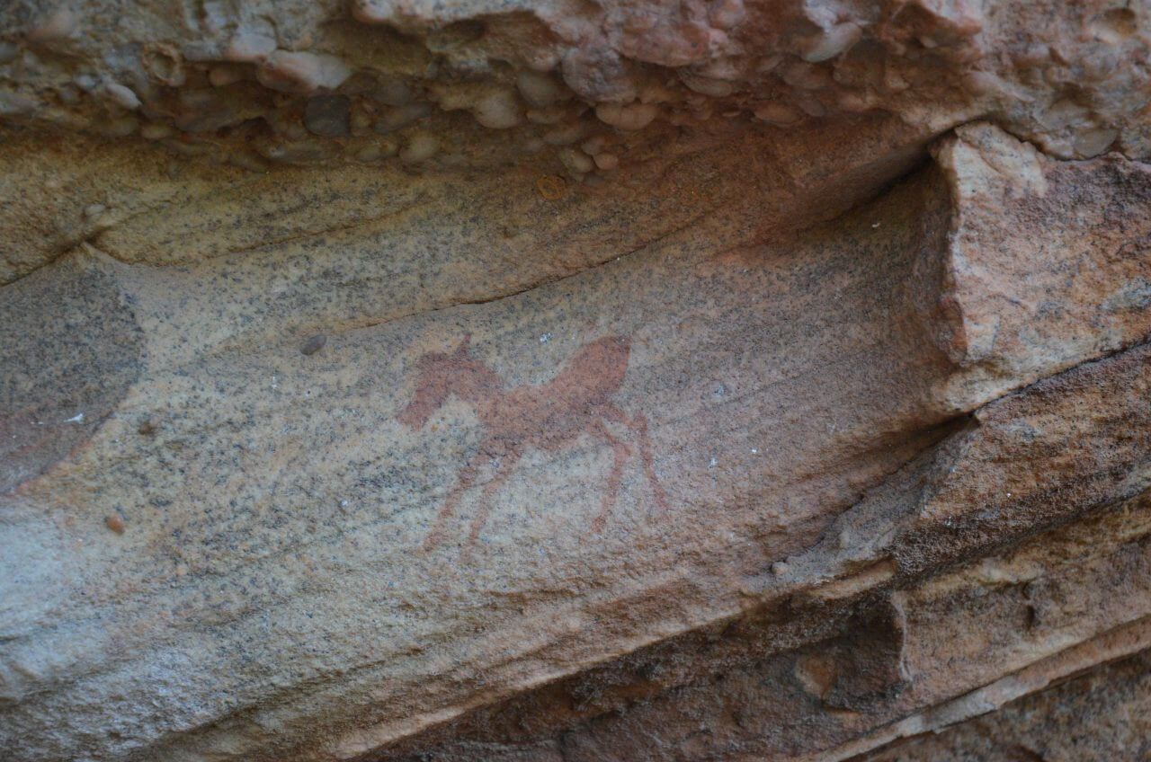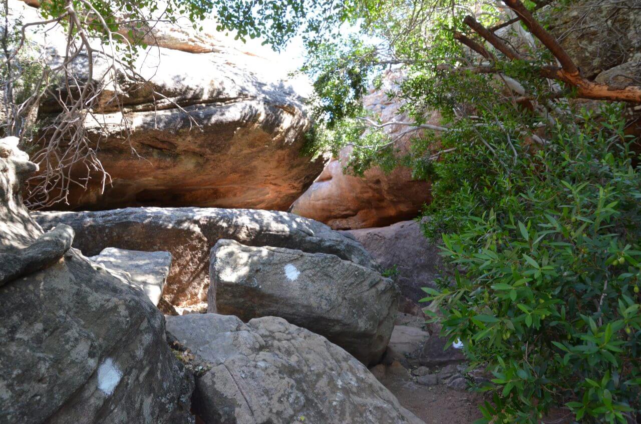 Der “Sevilla Rock Art Trail” zählt hier in den Cederbergen zu den Hauptattraktionen. Der Weg führt durch ein felsiges, trockenes Tal in dem die San, die Ureinwohner Afrikas, vor tausenden von Jahren ihre Zeichnungen in den Felsenhöhlen hinterließen. Unglaublich, dass wir heute noch diese Spuren entdecken können. Es macht trotz der Hitze Spaß, den Anweisungen auf dem Wegeplan zu folgen und die Zeichnungen zu suchen und auch zu entdecken.