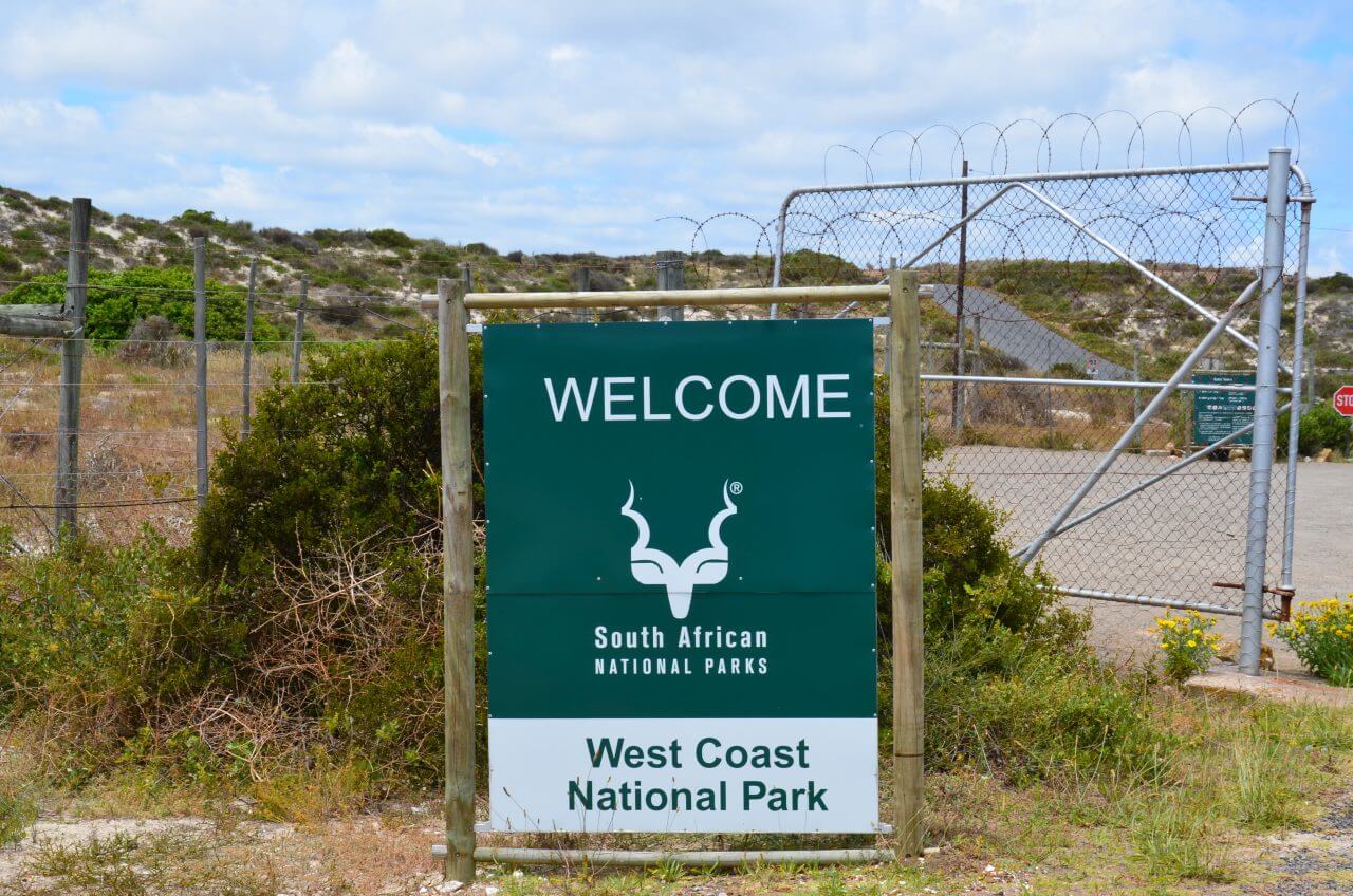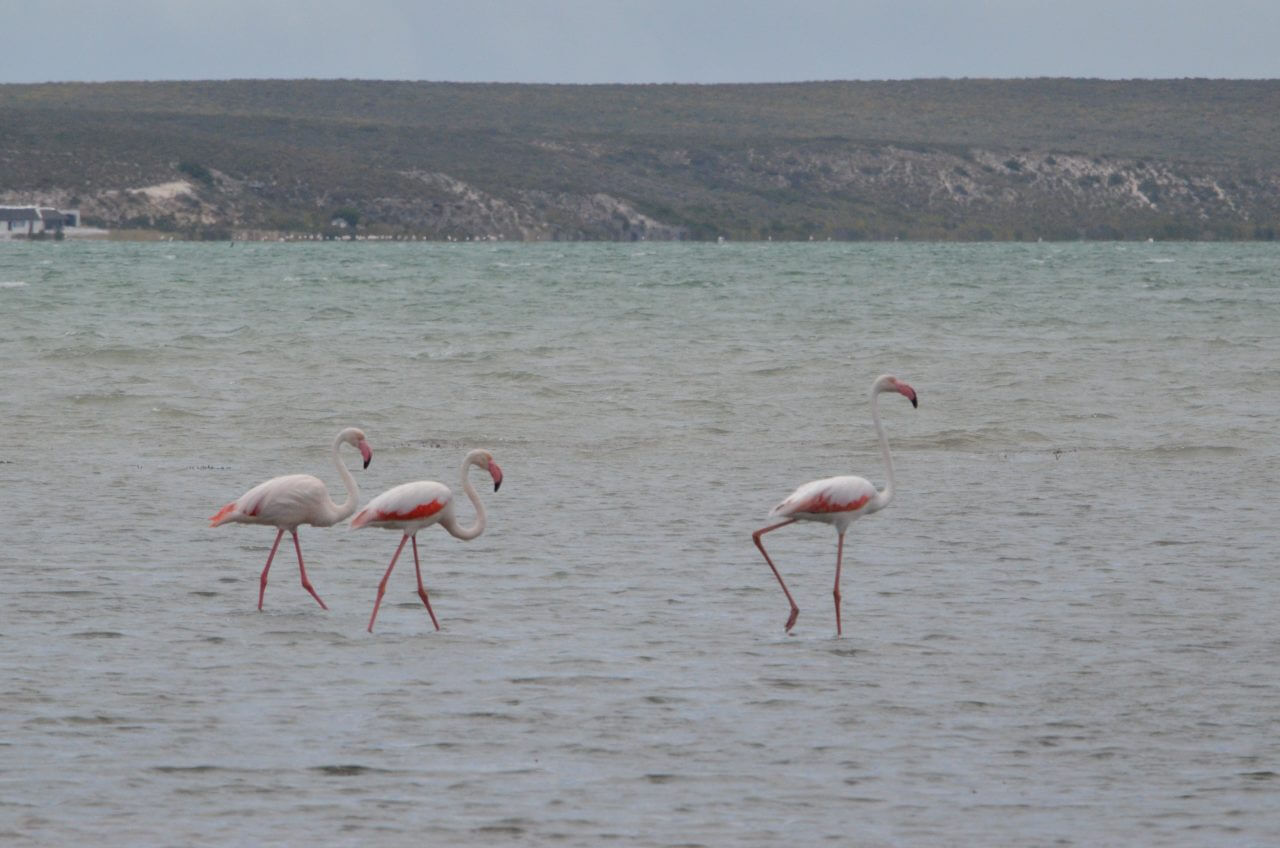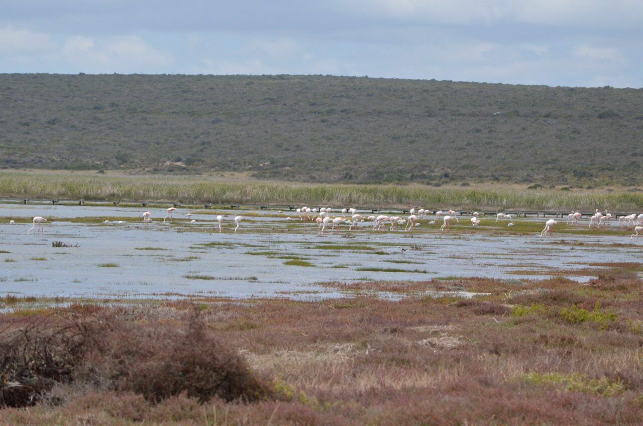 Kurz drauf erreichen wir den West Coast National Park. Hier fahren wir ganz gemütlich durch, um abseits der Hauptverkehrsstraße näher an der Küste zu bleiben. Nebenbei entdecken wir in der Lagune noch eine ganze Flamingokolonie.
