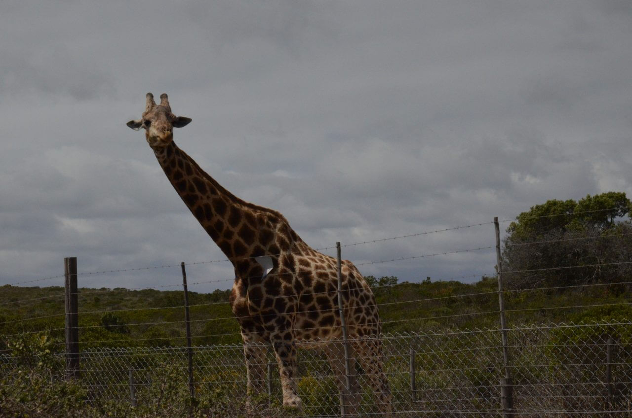 Überraschenderweise entdecken wir am Straßenrand eine große Giraffe, die neugierig ihren Hals über den Zaun reckt. Sie gehört wohl zu einem großen Reservat, dass seine Ausläufer bis hinunter zur R27 Richtung Kapstadt hat.