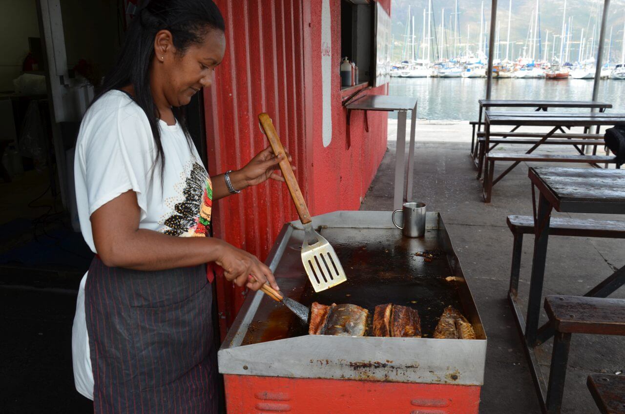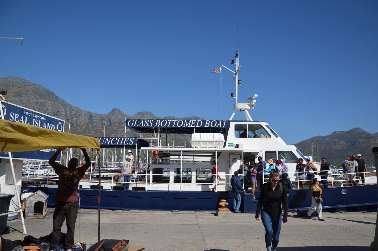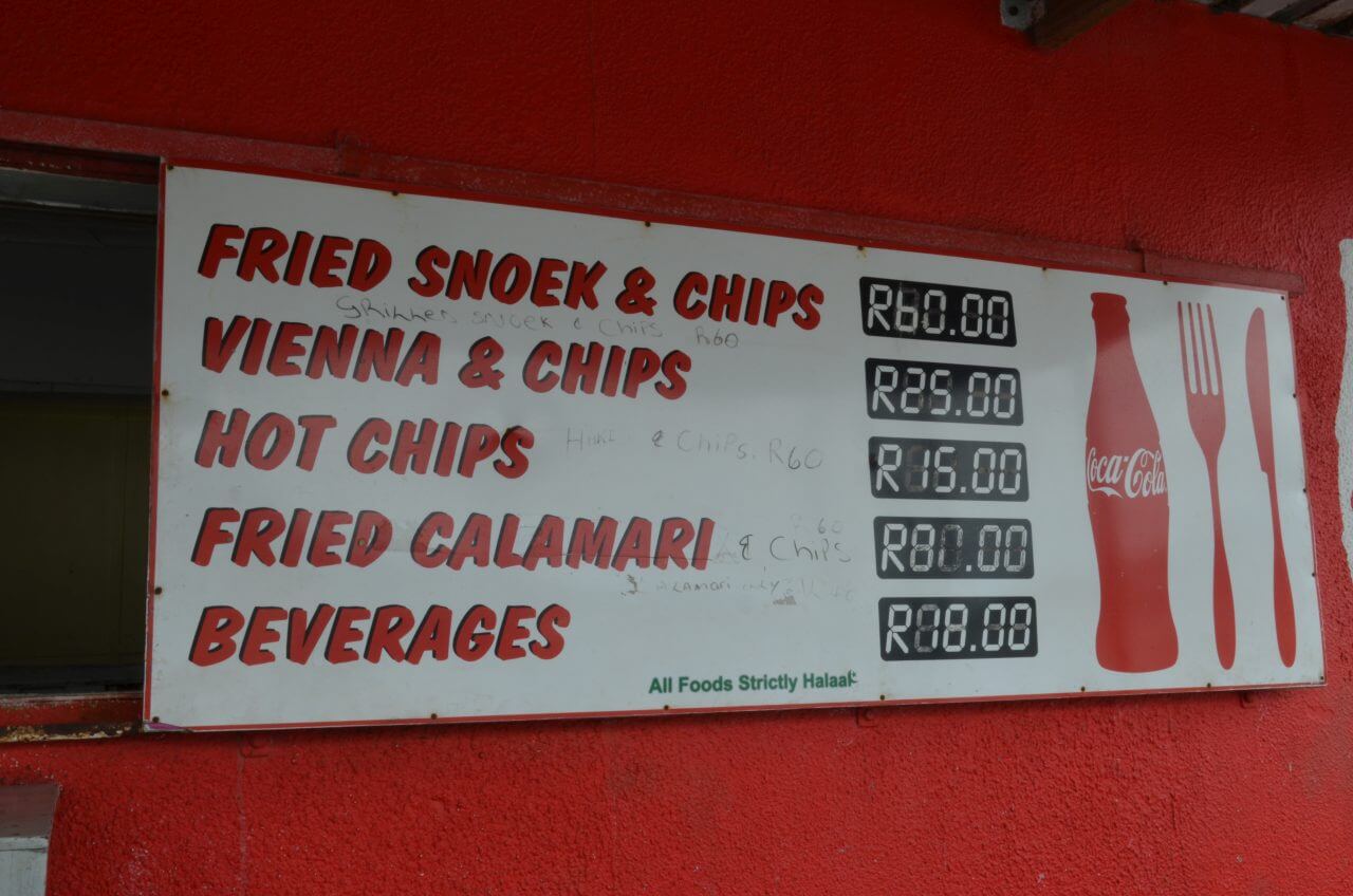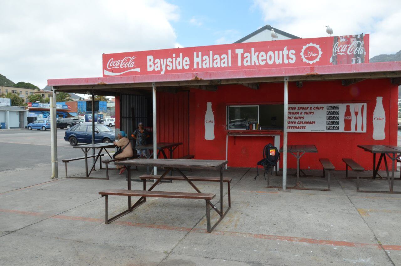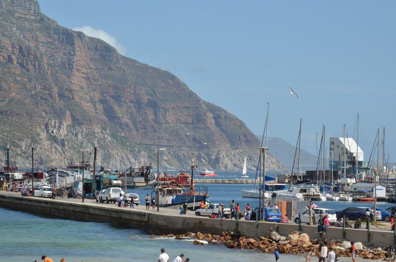 Am Mittag steigen wir wieder in den roten Bus und fahren rund um den Tafelberg auf die andere Seite an die Küste und steigen in Hout Bay wieder aus. Wir können noch erahnen, dass hier in diesem ehemaligen Fischerdörfchen mal ein beschauliches Leben stattgefunden hat. Der alte Fischereihafen ist voll in Betrieb und wir genießen an einem ganz einfachen Imbiss unser erstes Fish and Chips. Der Fisch ist ein frischgefangener Snoek, der uns frisch zubereitet köstlich schmeckt.