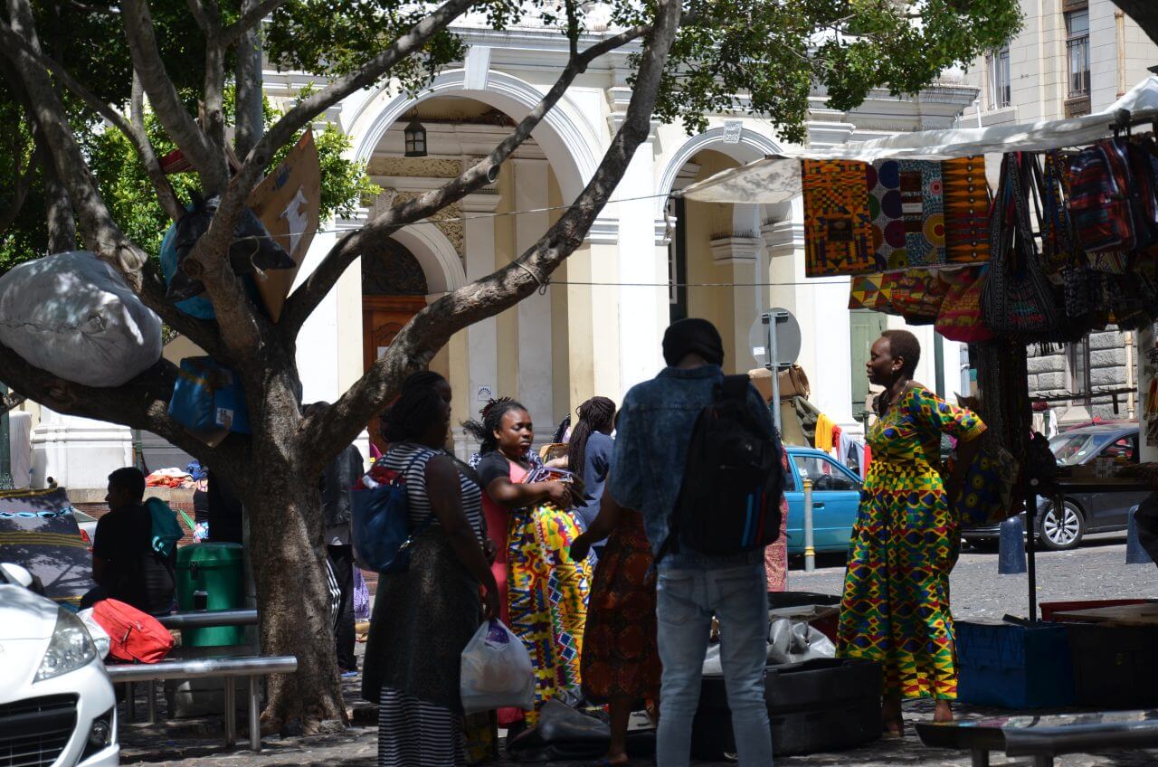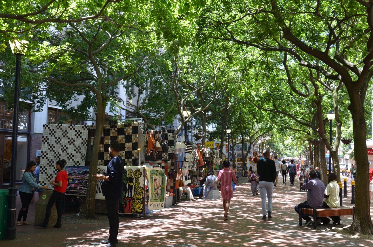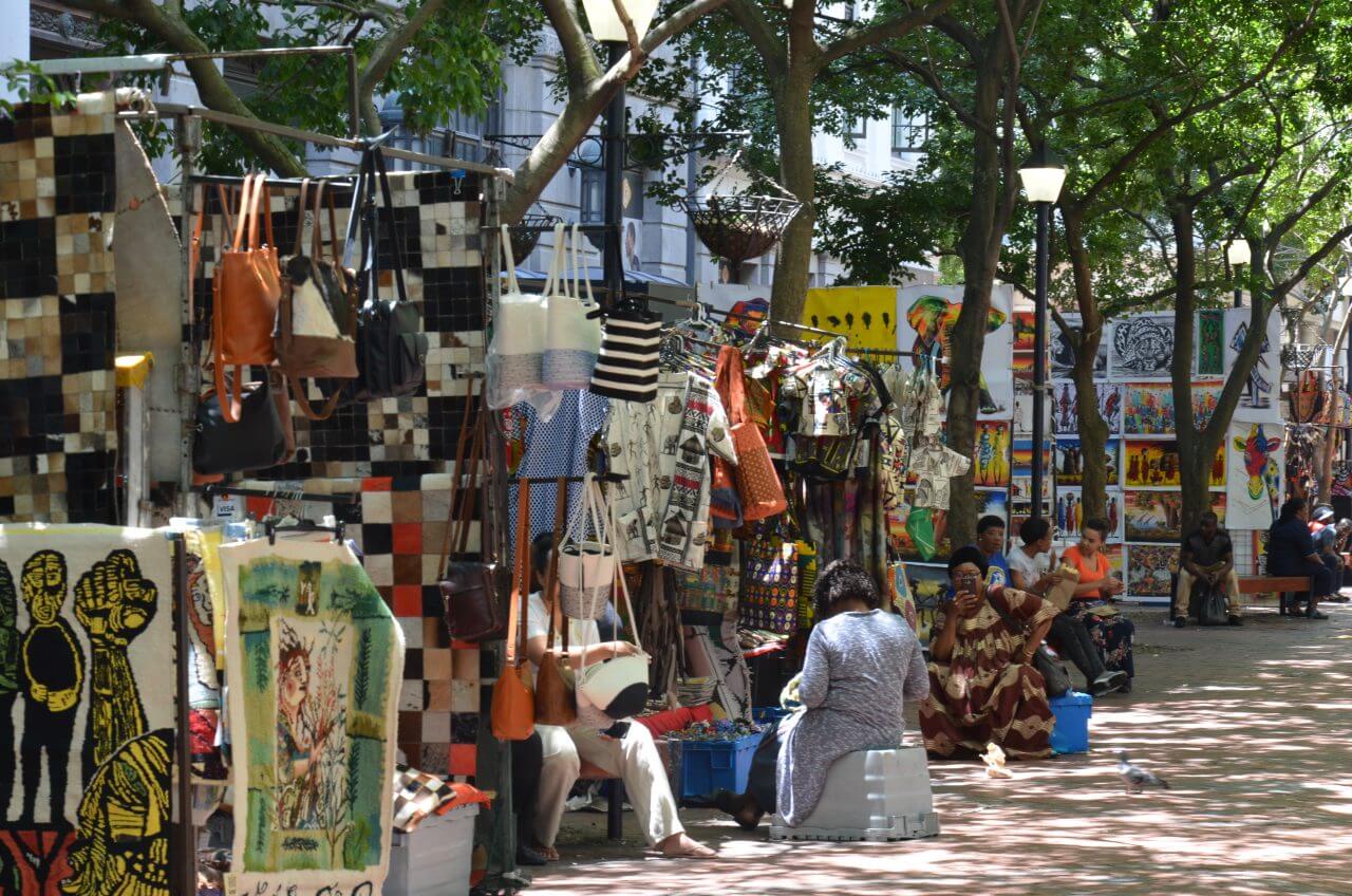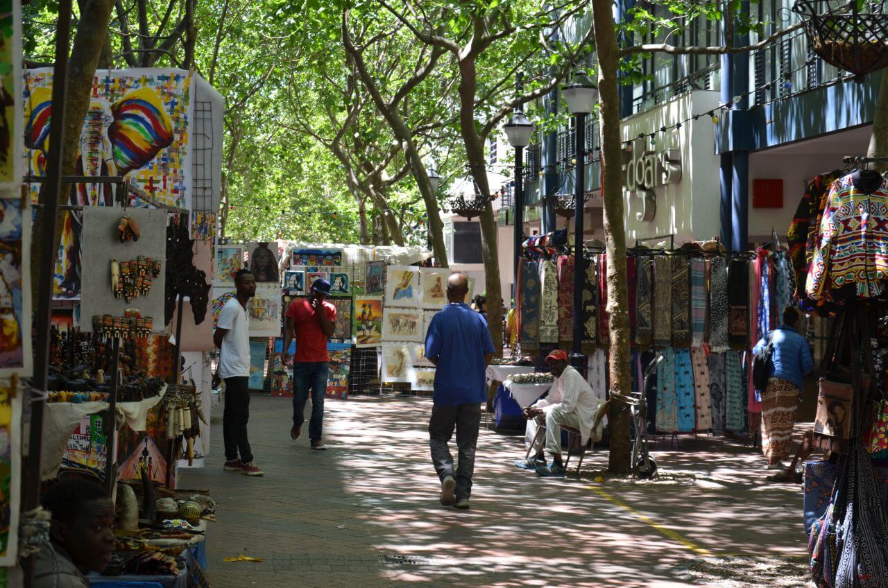 Dann erreichen wir die St George’s Mall, eine Fußgängerzone mit vielen Coffeeshops, Snackbars und Straßenkünstlern und gleich nebenan den Greenmarket mit seinem Flohmarkt.