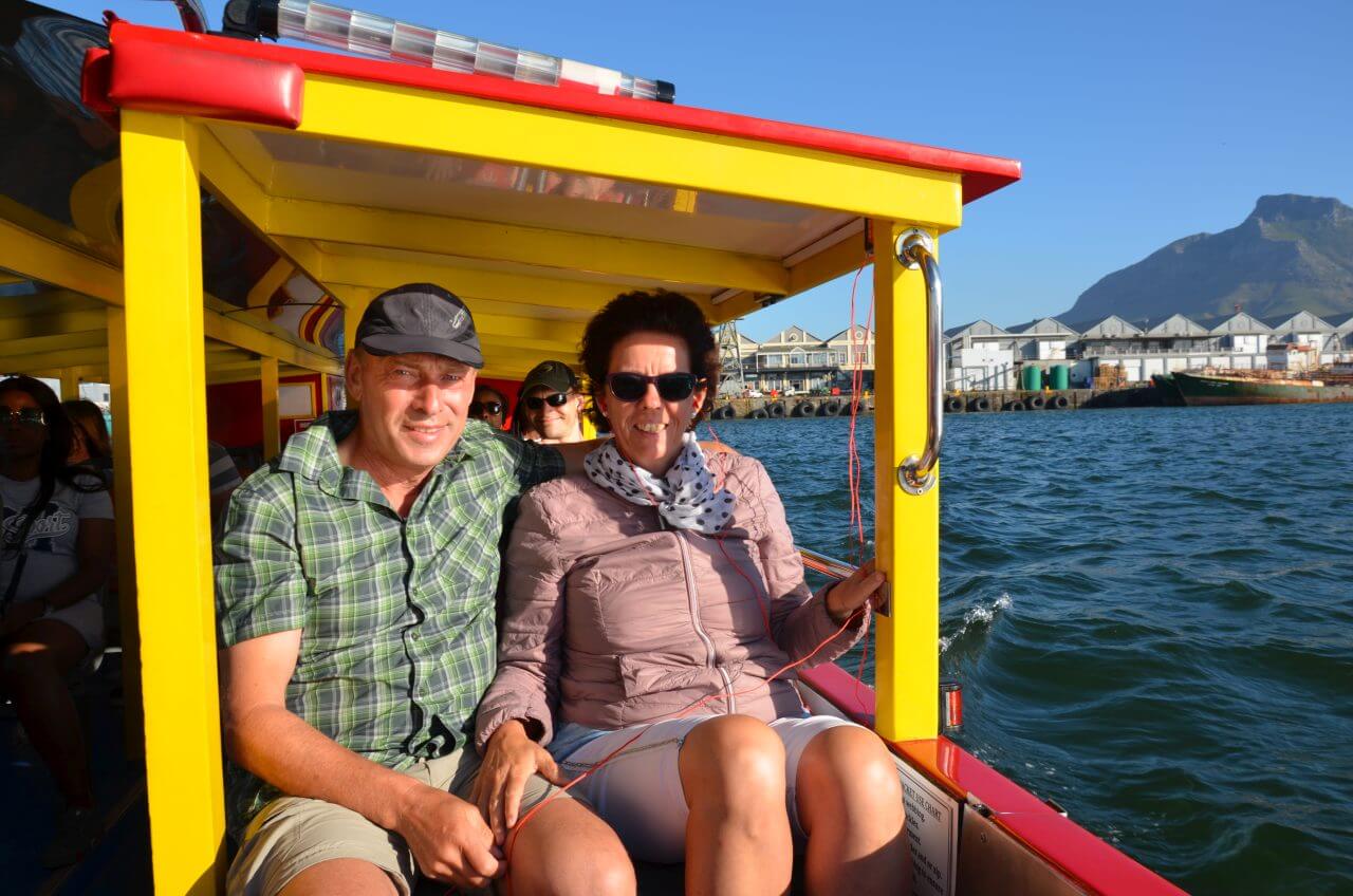 Dann bringt uns der nächste Bus wieder zurück zur Victoria & Alfred Waterfront, wo wir direkt in ein kleines rotes Boot umsteigen, um den Tag mit einer kleinen Hafenrundfahrt abzuschließen.
