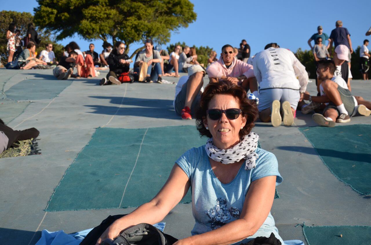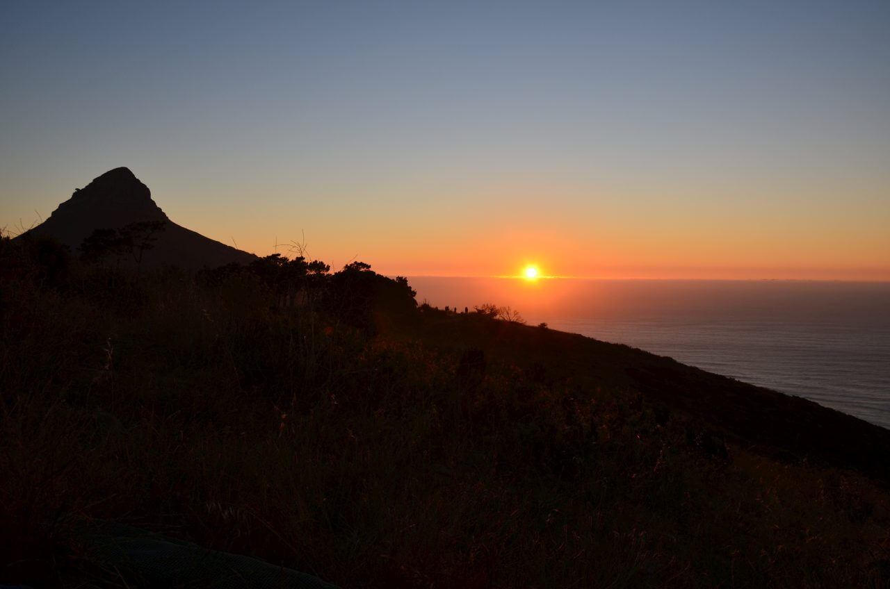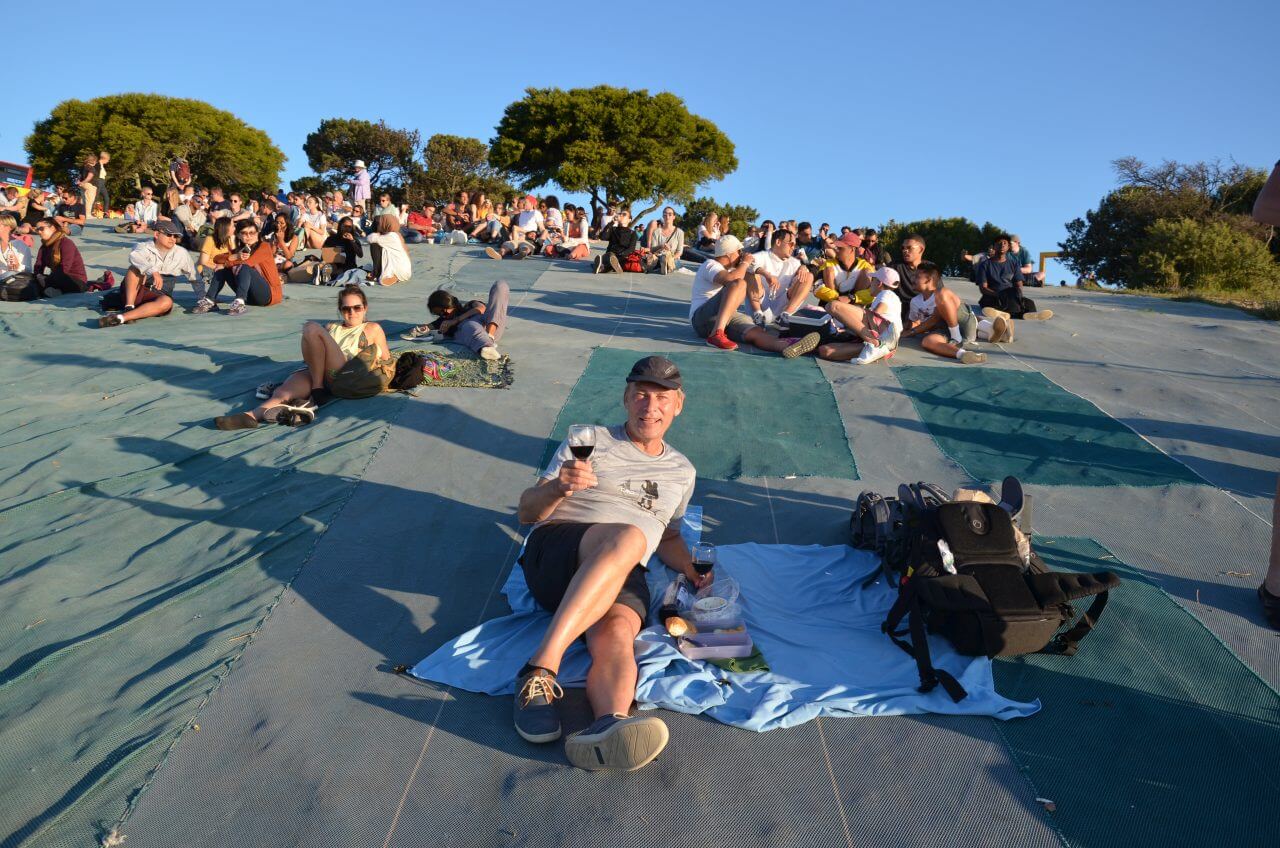 Gegen Abend brechen wir zu unserer letzten Bustour auf. Wir haben ein Ticket für drei Tage und wollen es voll ausnutzen. Der Bus fährt uns hinauf zum Signal Hill, einem Ausläufer vom Tafelberg mit flachem Gipfel und herrlicher Aussicht auf die Tafelbucht. Zum Sundowner kommen hier jeden Abend viele Menschen zusammen, bringen ihr Picknick mit und bewundern den Sonnenuntergang. Auch wir haben eine Flasche Rotwein im Gepäck, denn der Bus bringt uns ja anschließend sicher wieder zurück.