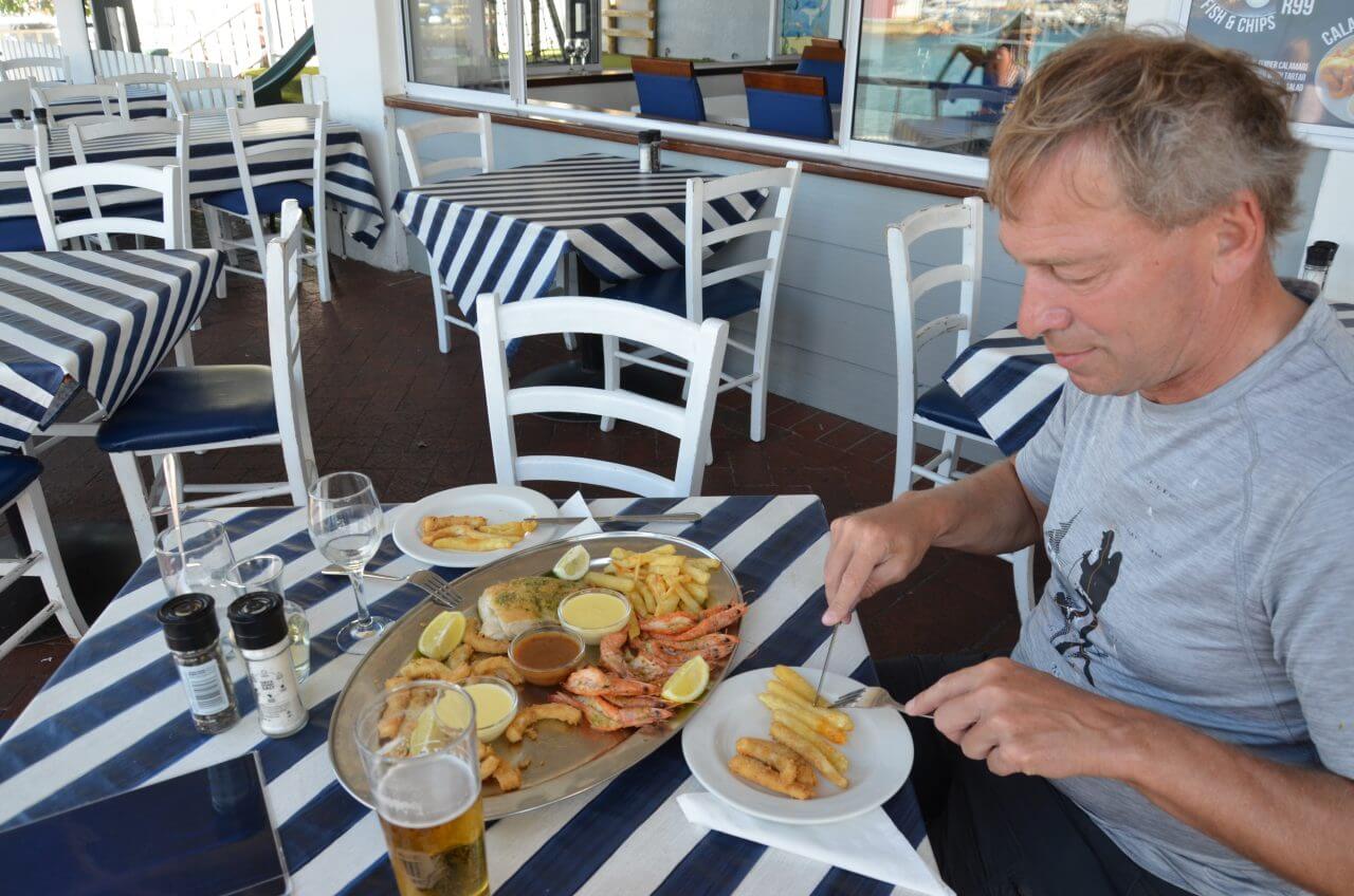 Über Fish Hoek fahren wir weiter nach Simon’s Town. Simon’s Town ist eine der ältesten europäischen Niederlassungen am Kap und heute wichtigster militärischer Stützpunkt der südafrikanischen Marine. Da wir schon am Meer sind und auch hungrig, gibt’s in einem Hafenrestaurant für uns heute Nachmittag eine Fischplatte…..mmh 😊
