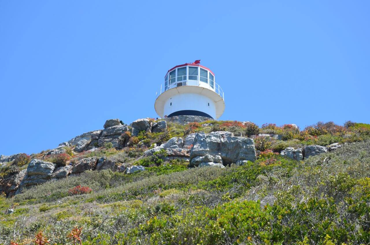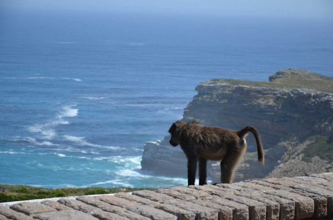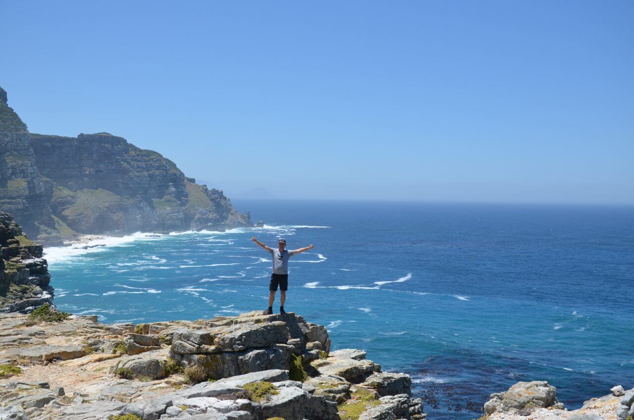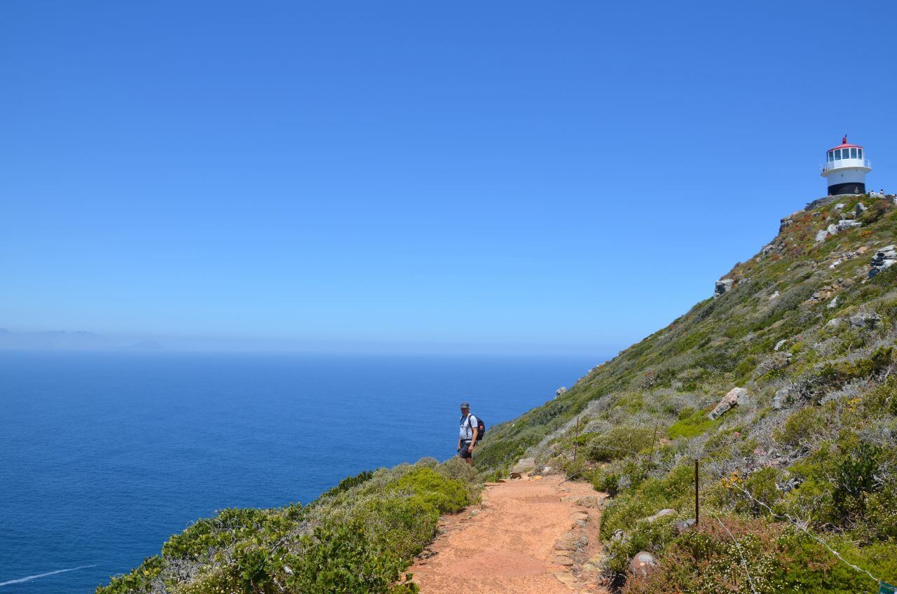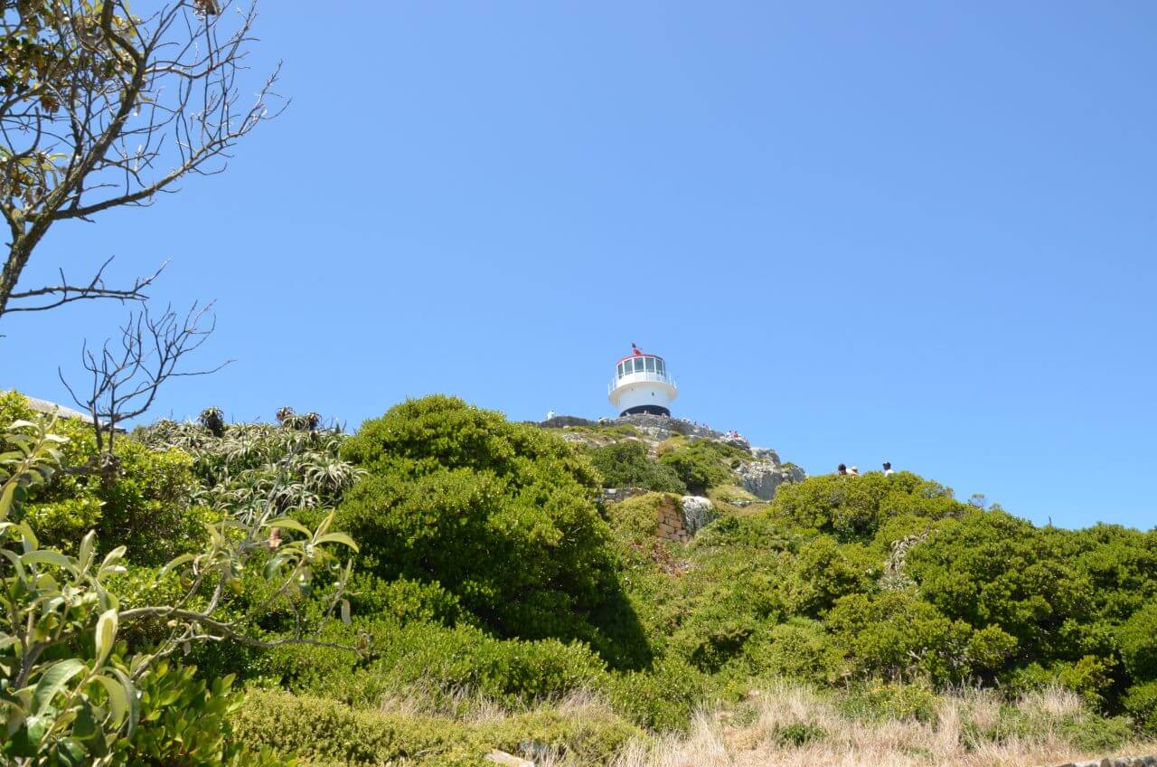 So nehmen wir dann wieder das Auto, um zum Cape Point hoch zu fahren. Von hier aus laufen wir anstrengenderweise viele Felstreppen nach oben zum Leuchtturm. Von hier oben sieht man sehr gut den berühmten und gefährlichen Felsvorsprung, der auch heute noch die Seeleute vor navigationstechnische Herausforderungen stellt. Hier oben stehen wir am Old Ligthouse. Weil aber dieser alte Leuchtturm die Seefahrer nicht ausreichend weit vom Felsen fernhalten konnte, da er zu häufig im Nebel lag, wurde 1914 ein zweiter Leuchtturm weiter unten am Felsvorsprung gebaut. Auch bis dahin wagen wir uns vor und stehen nun wirklich an der Spitze! Gigantisch – rechts der Atlantik und links der indische Ozean. Einfach atemberaubend!