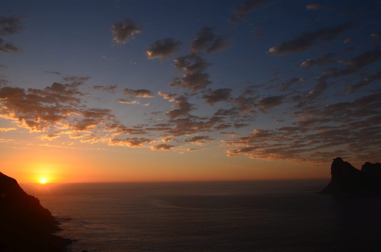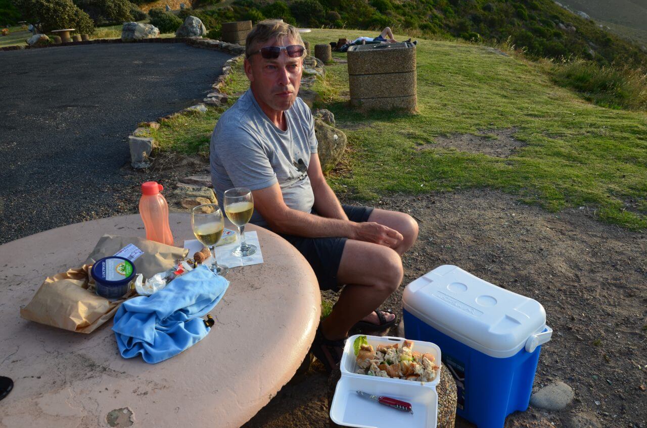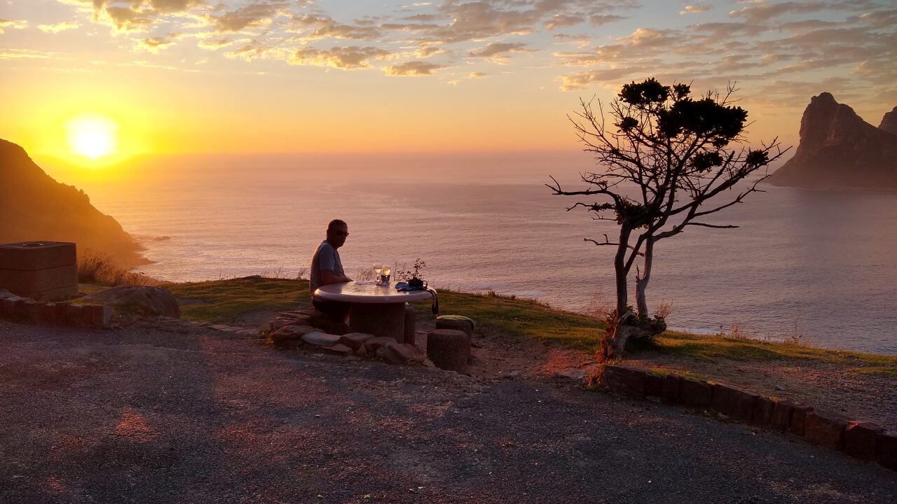 Schnell wird es schon dämmerig und auf dem Chapmans Peak, einer der schönsten Küstenstraßen der Welt suchen wir uns einen Picknickplatz um den wunderschönen Sonnenuntergang mit unserem letzten Flasche Sekt zu begießen. 😊 Es ist schließlich unser letzter Abend.